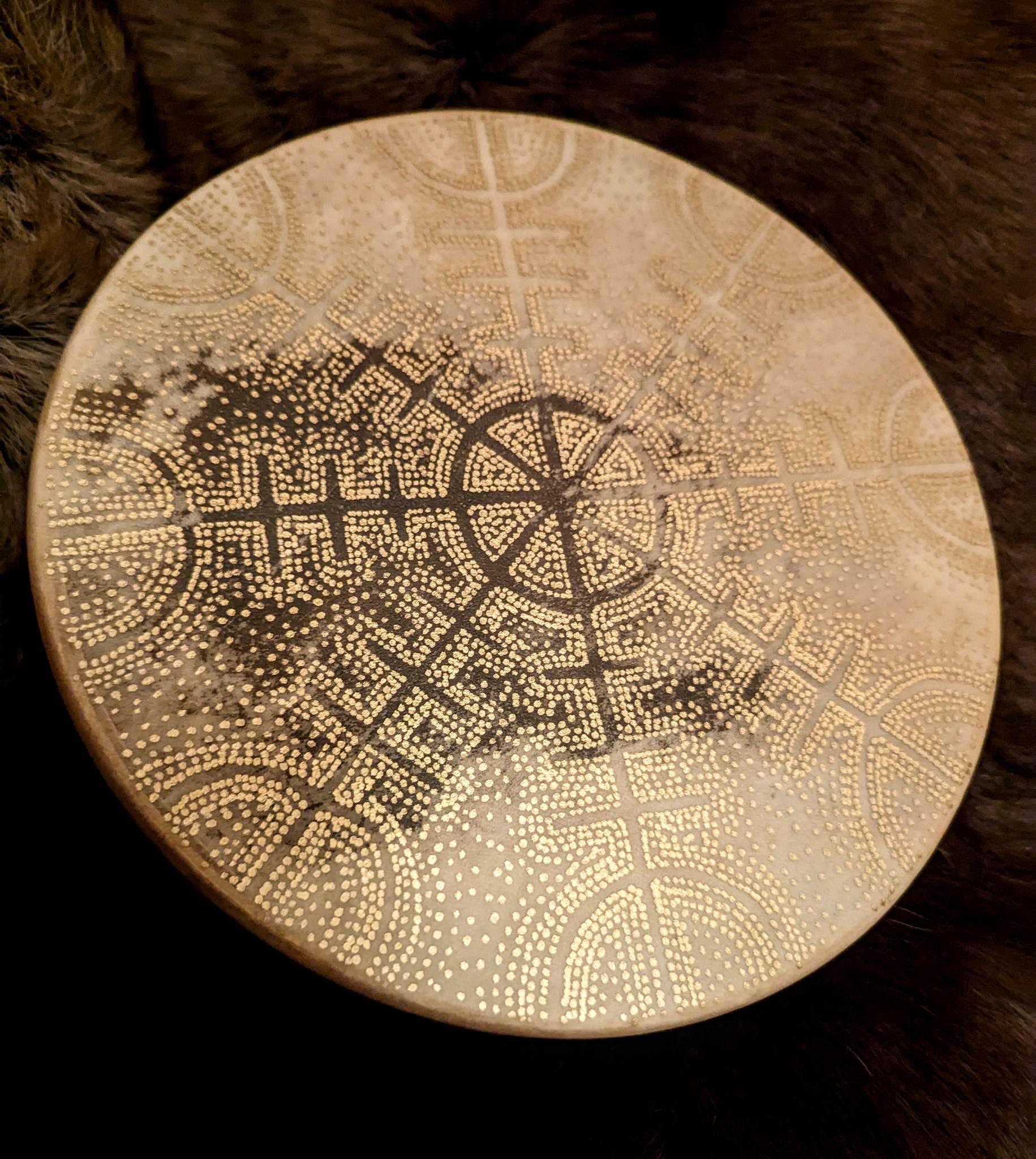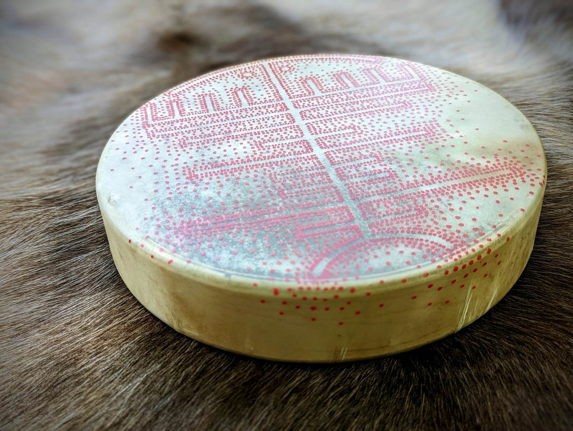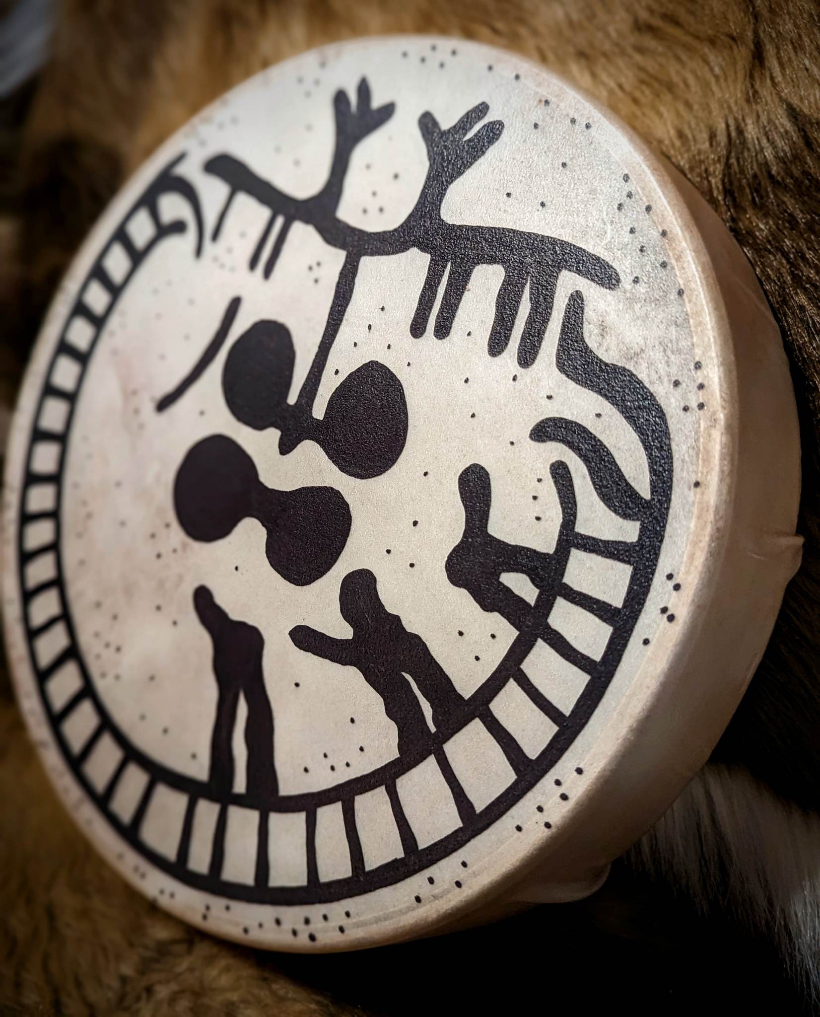 10 inch drums: hand painted, handmade pieces of traditional art crafted from deer hide. Play by hand or with included alder wood and buckskin beater. Tone/voice changes depending on heat, cold, and humidity. Drier conditions = higher tone and vice versa.