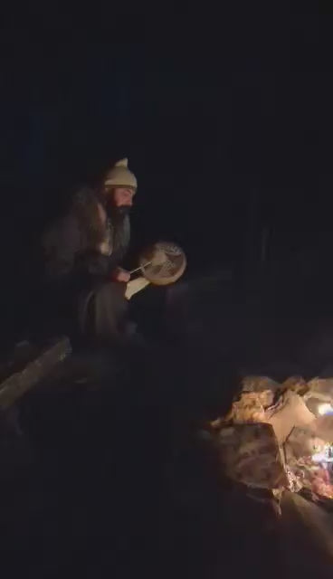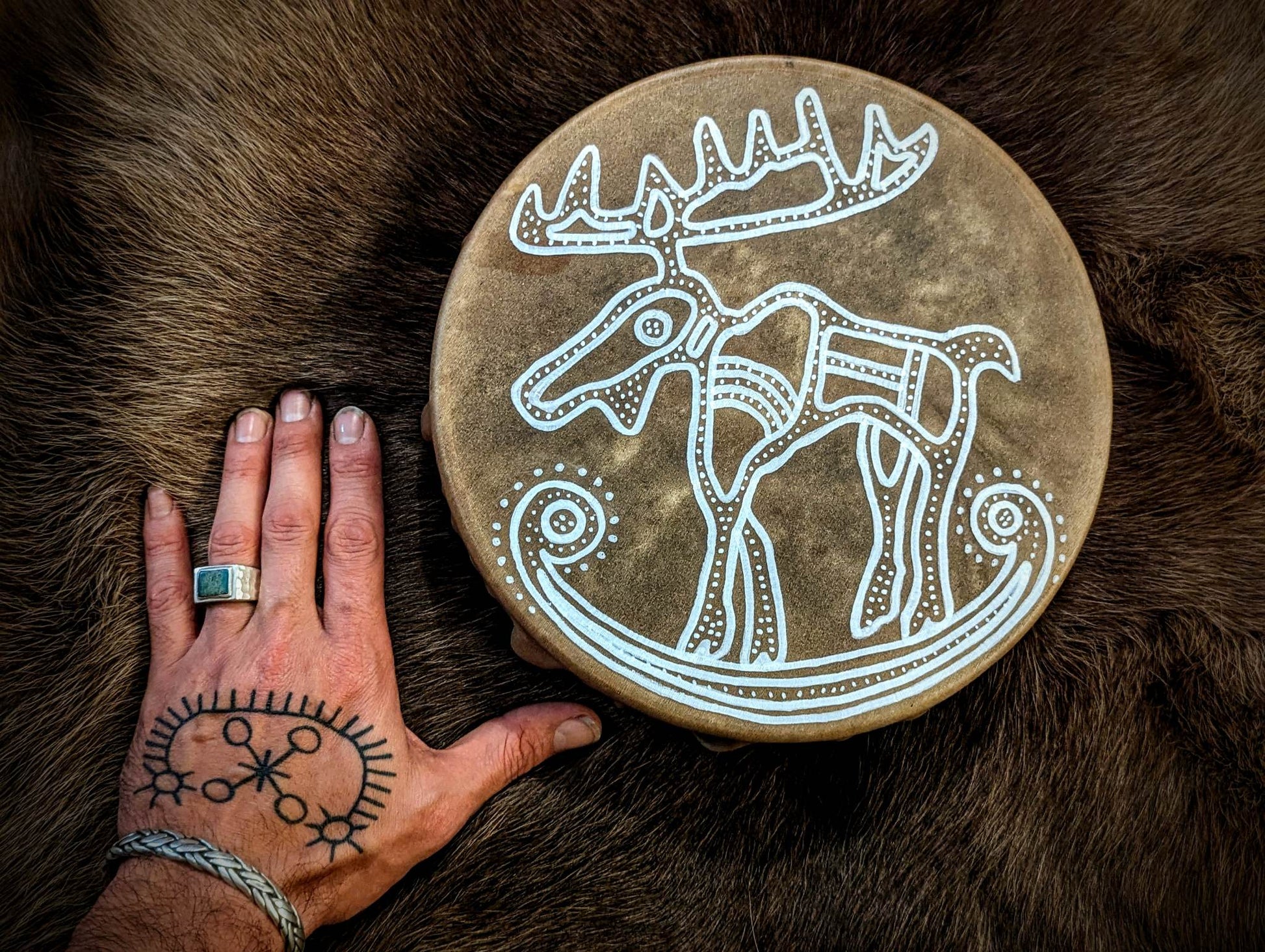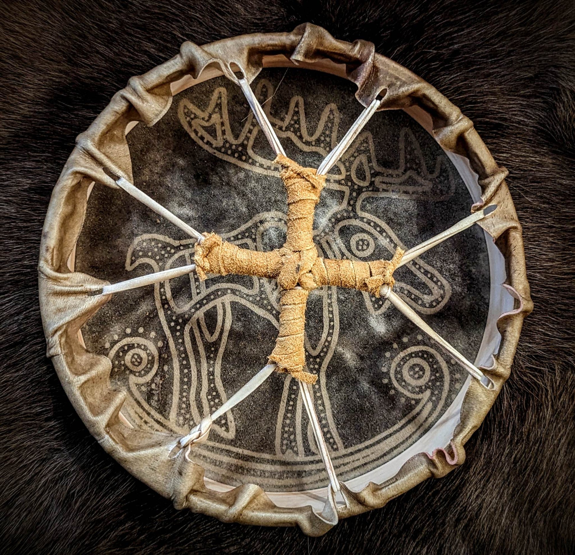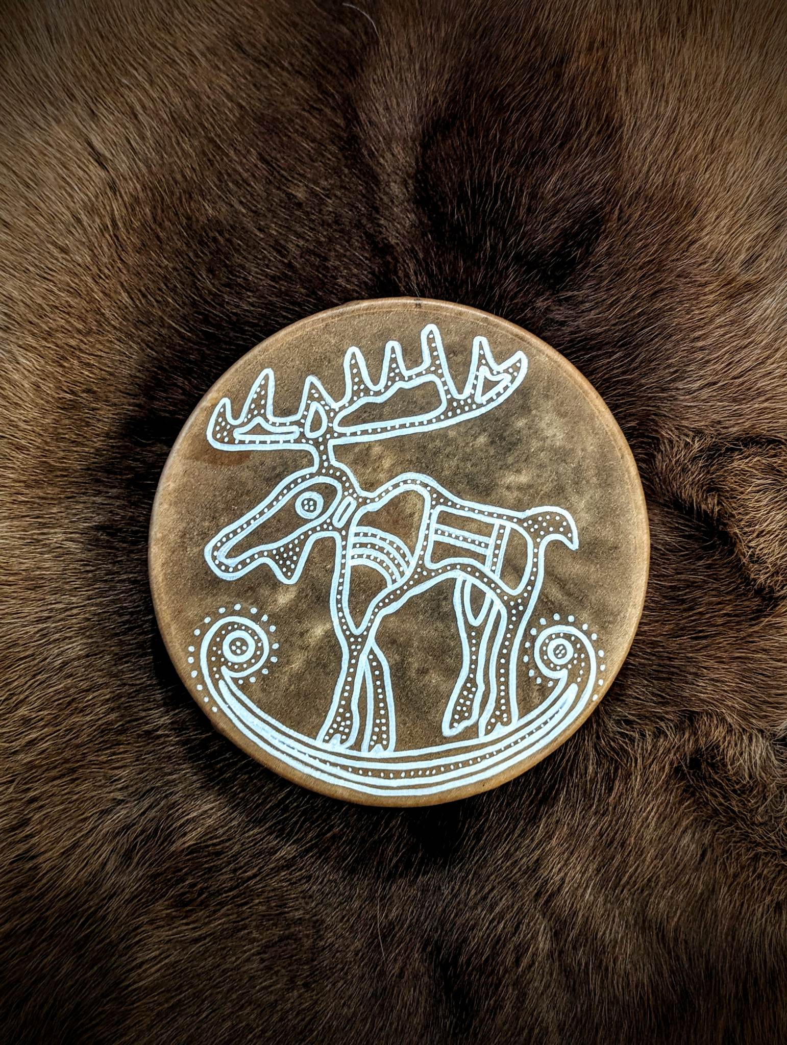 10 inch drum made from thick moose hide, for a deeper sound than is usually achievable in a small drum. The artwork features a moose atop a sled, skis, or canoe depending on how you interpret it. Great hand drum or can be played with a beater. Buckskin wrapped grip. Headphones on to best hear sound.
