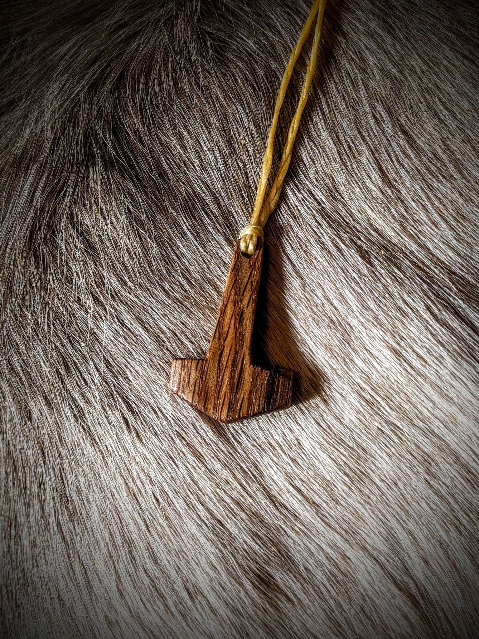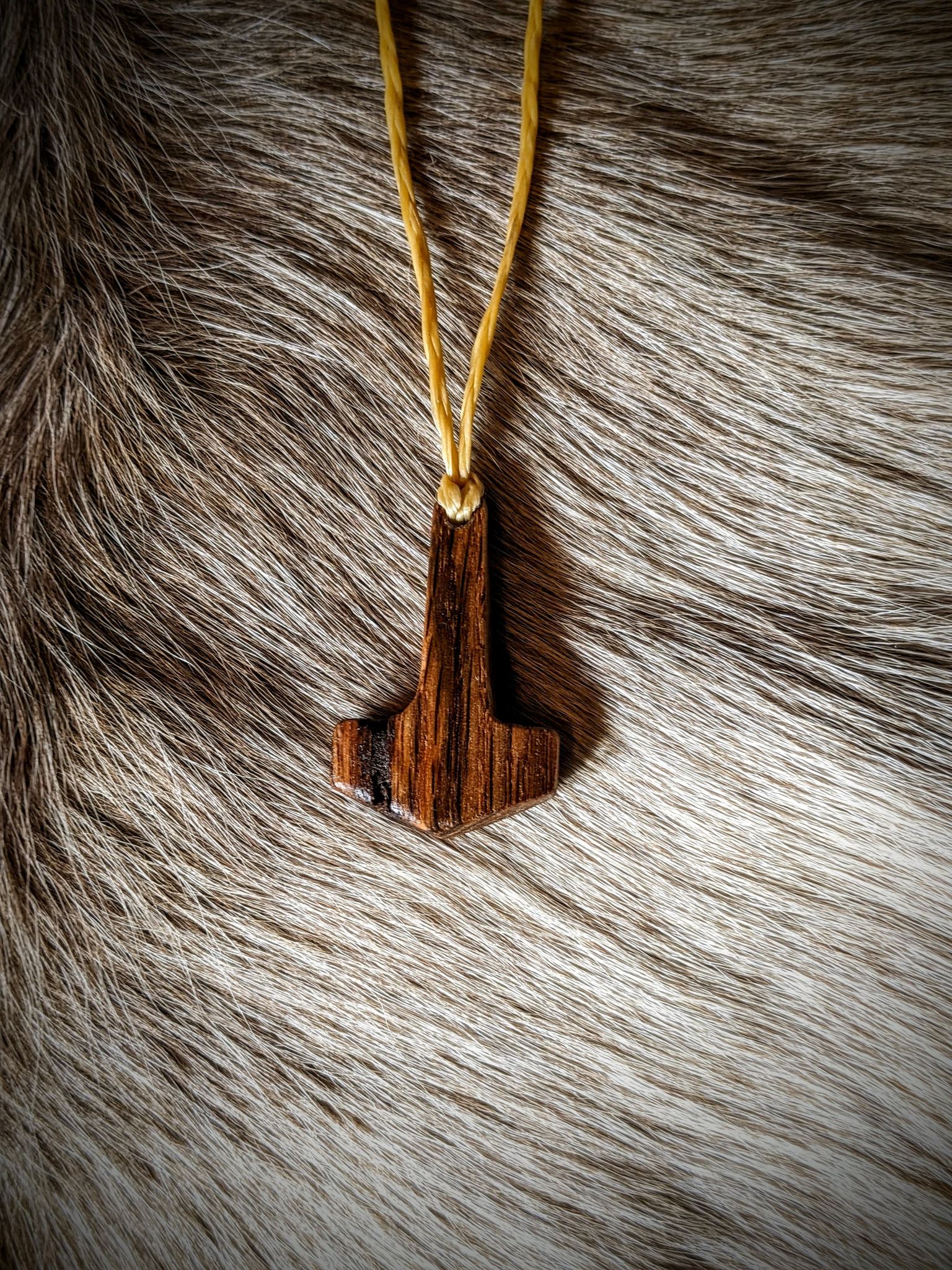 Hand carved mjolnir pendant, made from a piece of 100+ year old hickory wood. Hangs on a braided sinew cord you can tie to the desired length. Sealed for durability.