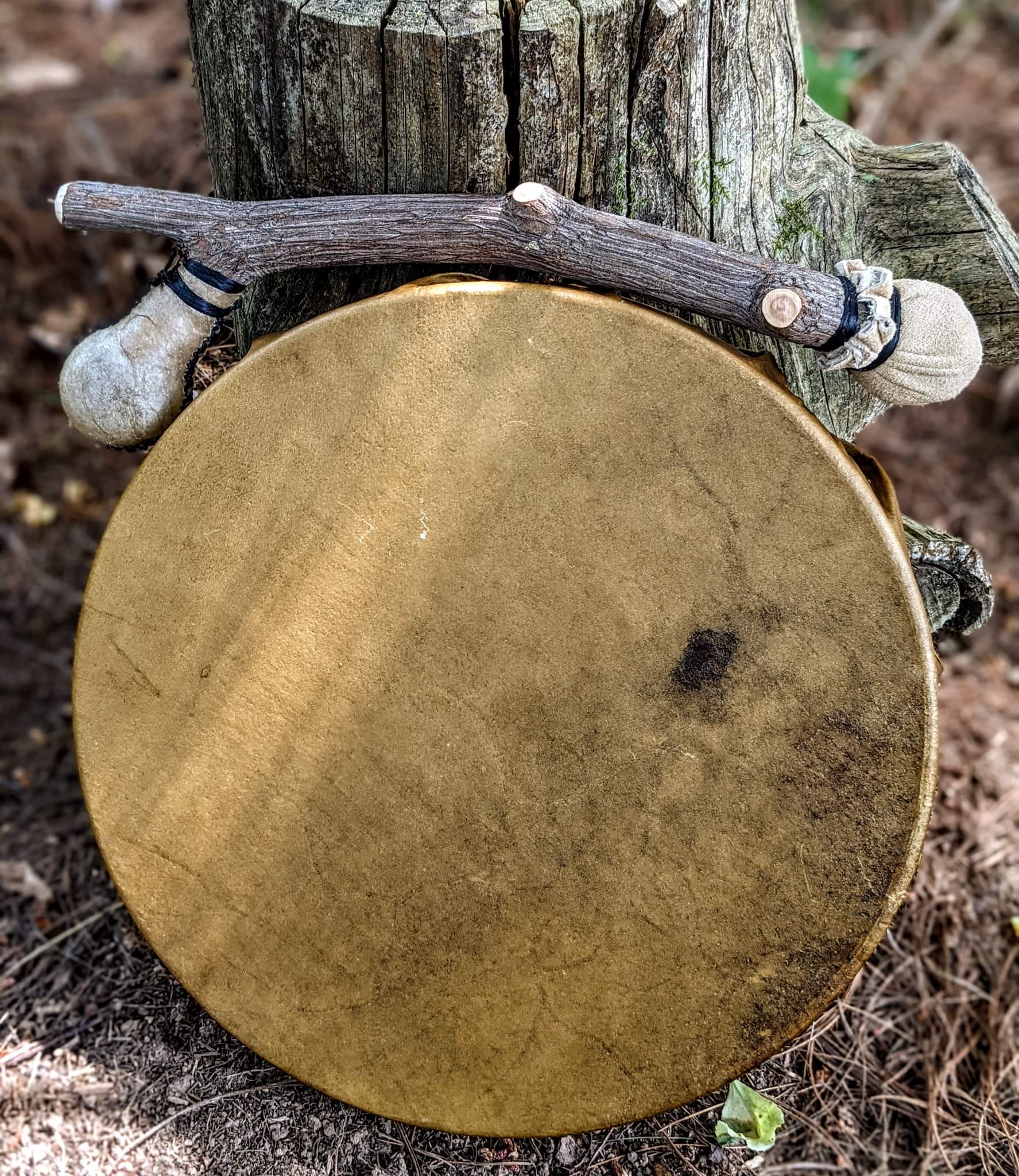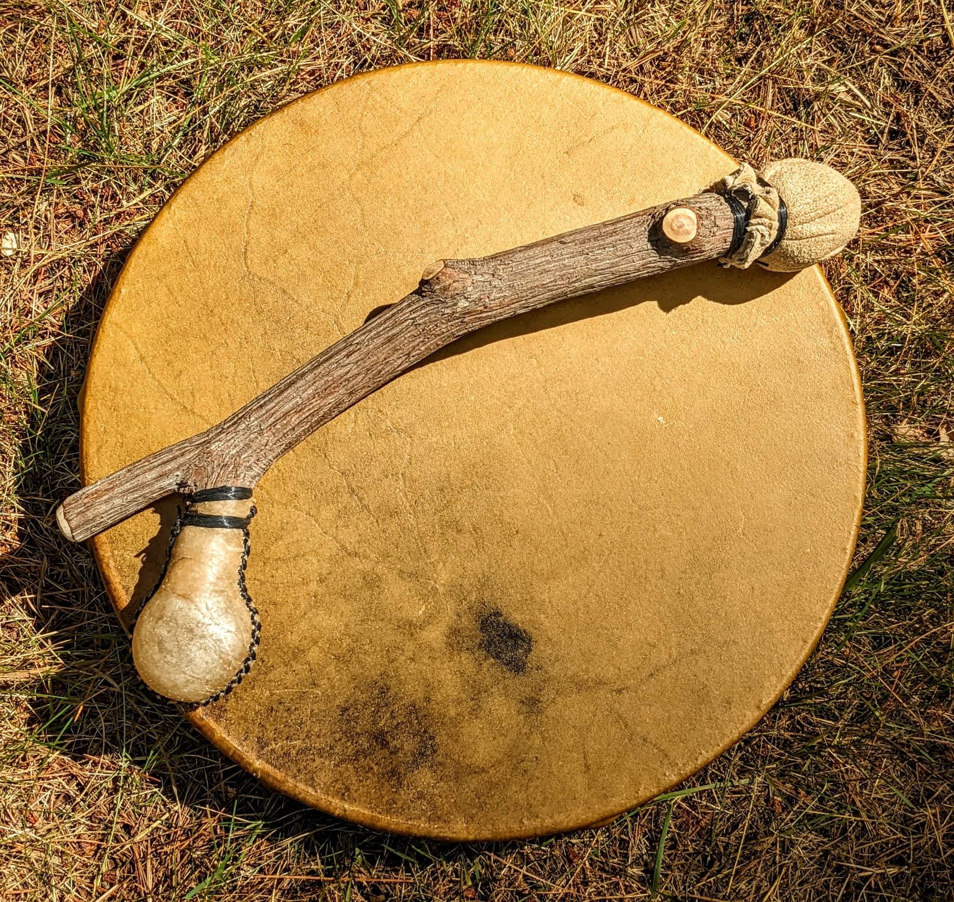 12" bison hide drum with a nice deep sound for its size. Buckskin wrapped hand hold area in back for comfortable grip. The beater features a mountain laurel wood body, bucksk head, and deer skin rattle on the opposite end. Video demonstration of use is on the Fjallvaettir Workshop Facebook page.