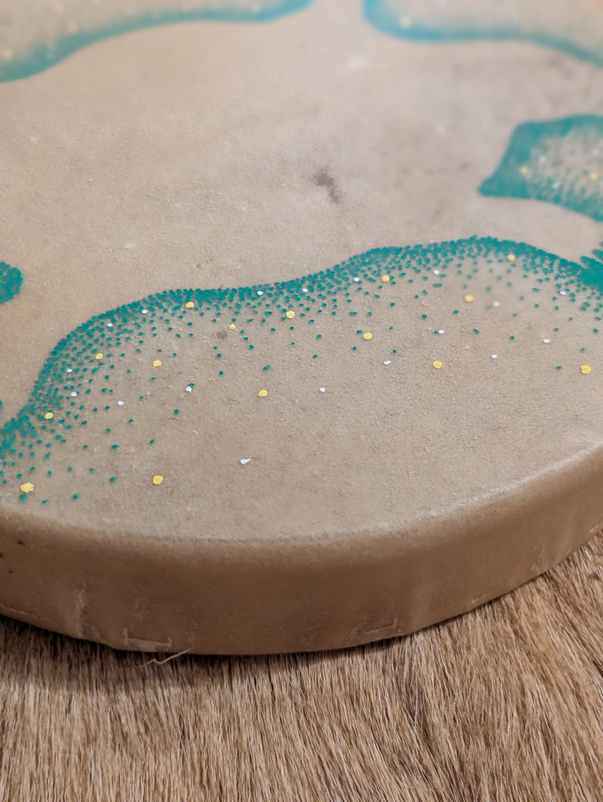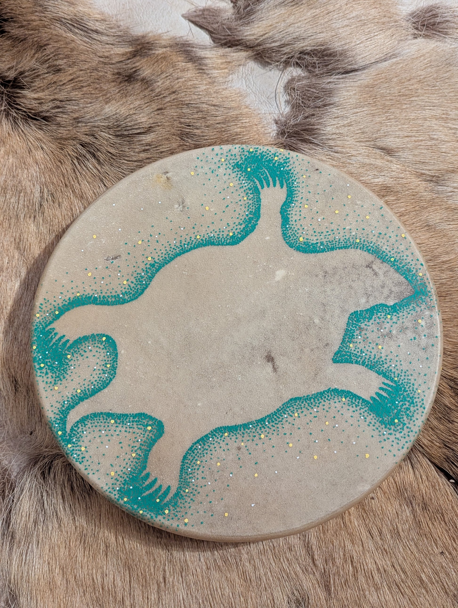 Handmade 12" drum in deer hide with a maple frame. Hand painted dot work turtle. Comes with felt fabric and willow wood beater.