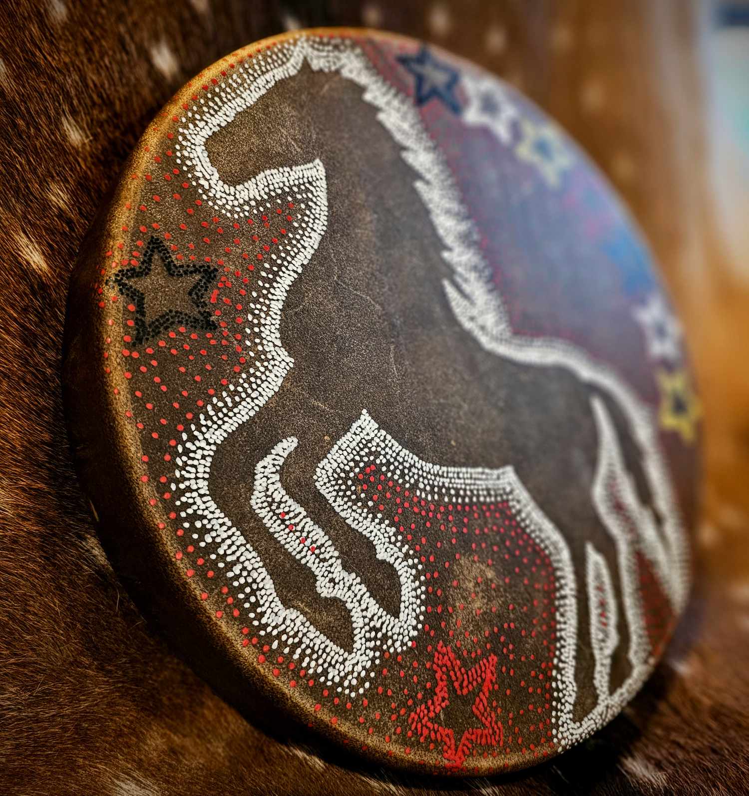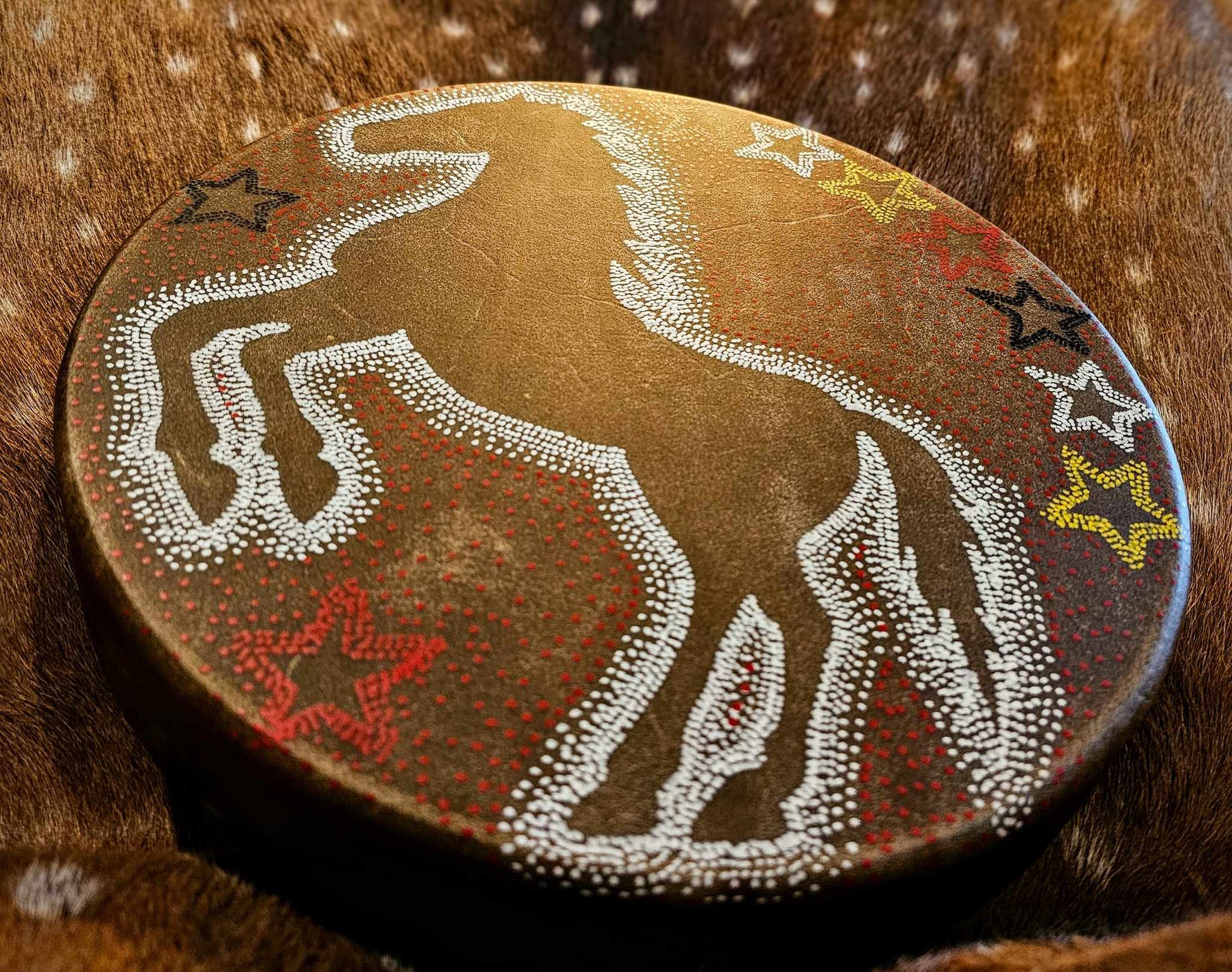 12" horse hide drum, with hand painted dotwork art featuring a white horse and black, yellow, and red stars. Beater is poplar wood with a buckskin head.