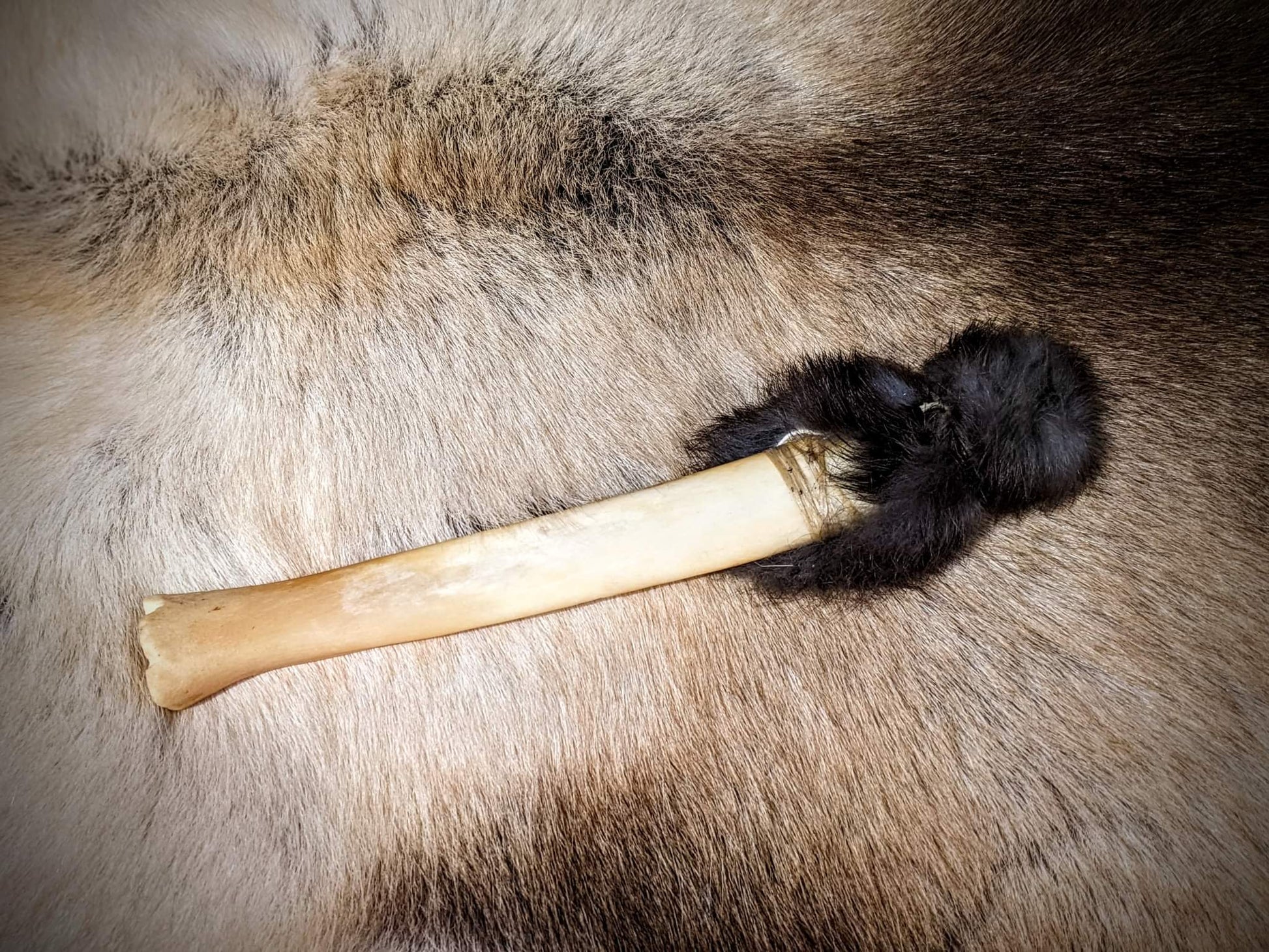 Handmade frame drum incorporating the Algiz rune which represents elk literally, and protection figuratively, around a central sunwheel. The beater is an elk leg bone with a boiled wool head covered in rabbit fur.