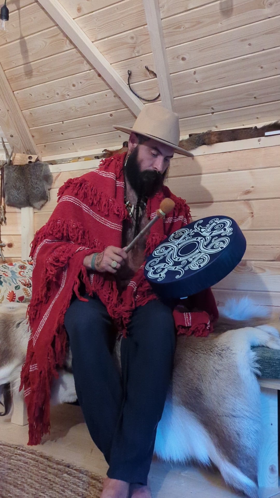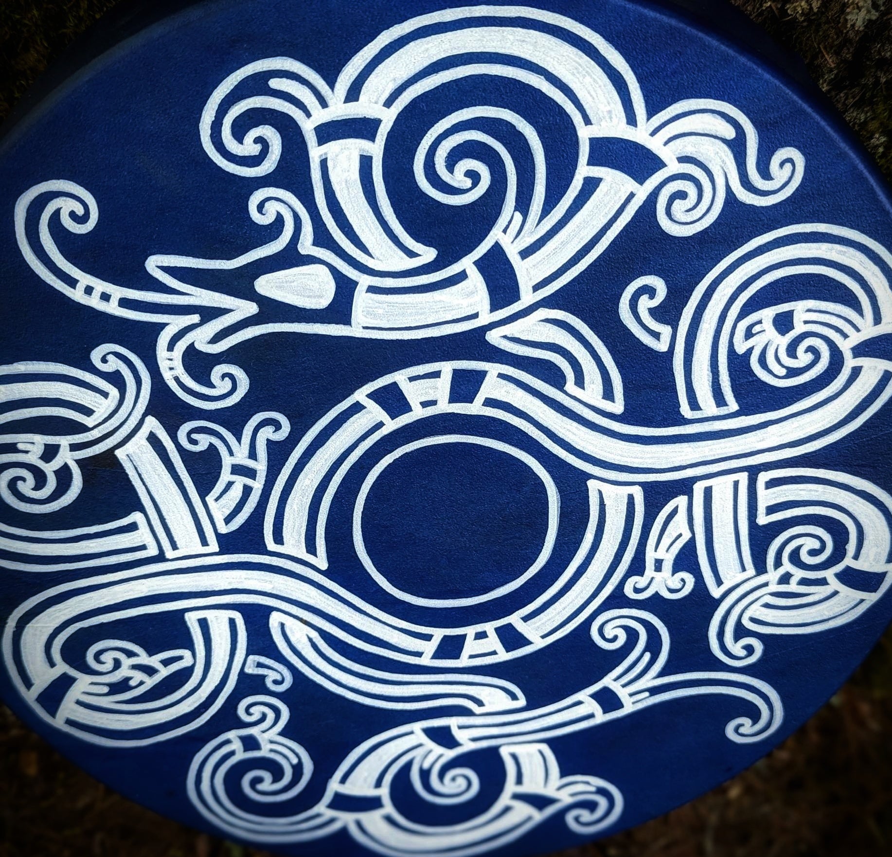 14 Inch Blue Deer Hide Shaman Drum. It features a high-quality, dyed blue deer hide, hand painted with an intricate design of Jormungandr. The included beater is crafted from alder wood and buckskin.