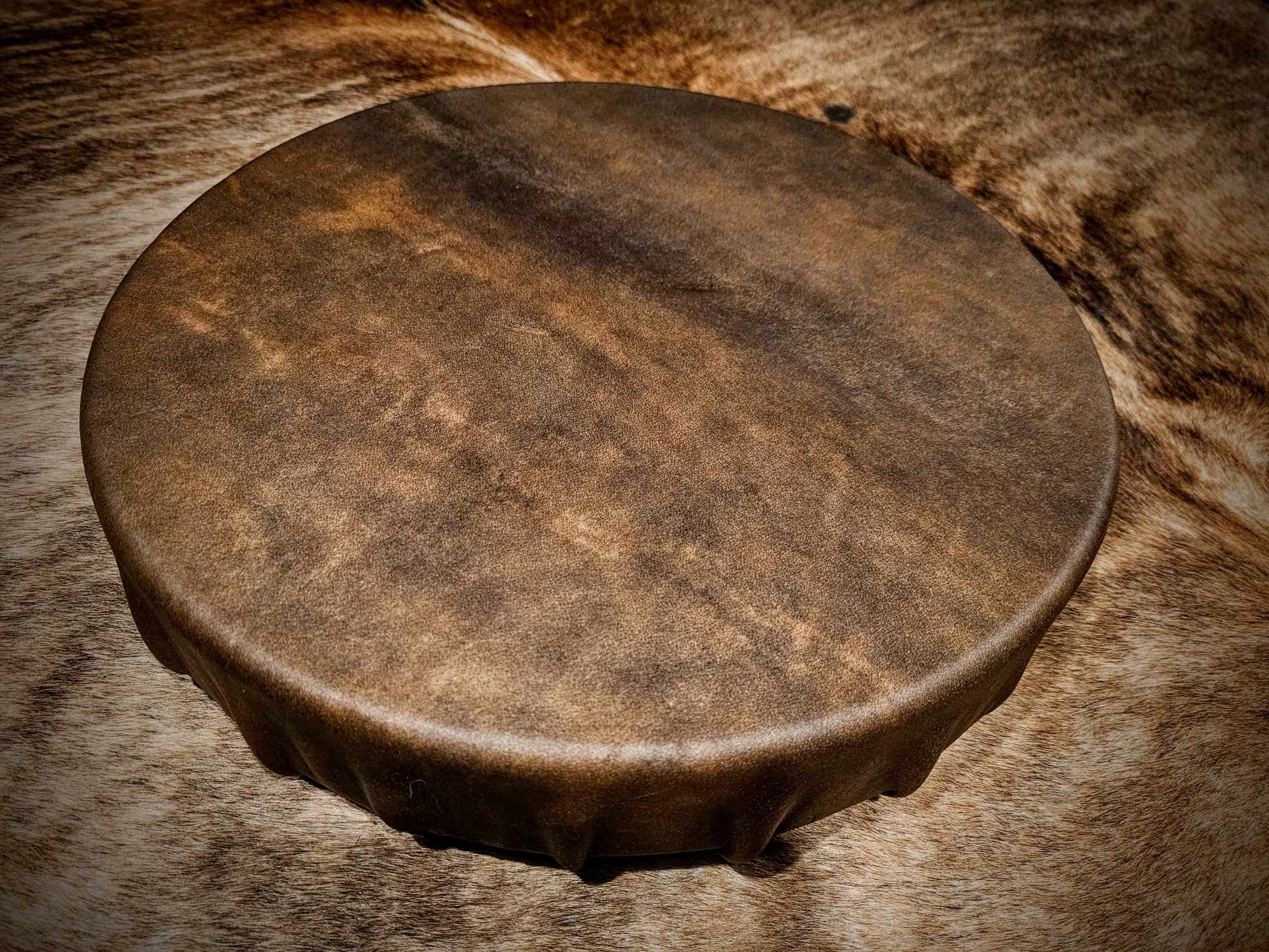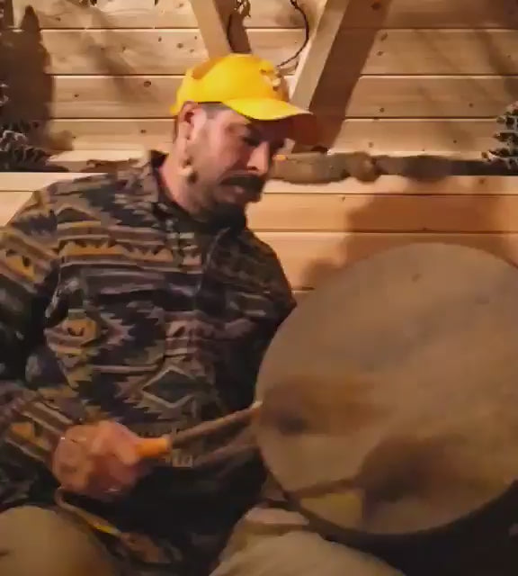 Powerful sounding 18" Bison Hide Drum. this drum produces deep and resonant tones. The beater is crafted from alder wood, with a bison hair head and handle wrapped in buckskin.