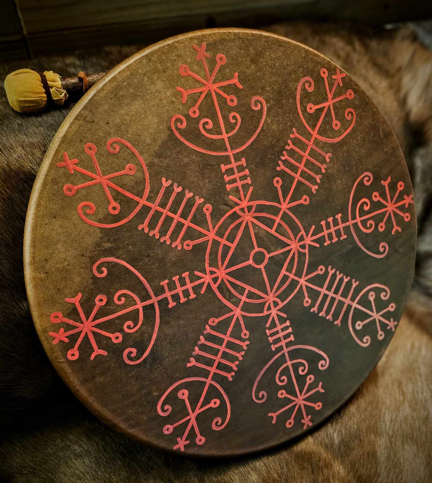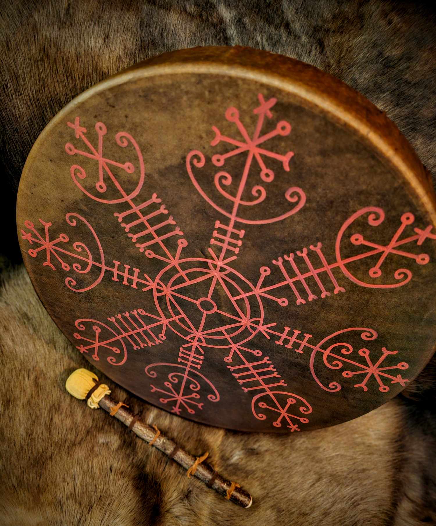 18 inch naturally dark horse hide on a maple frame. Beater is decorated with leather cord on alder wood, with a buckskin head. The Stave draws from Icelandic Galdrstafir traditions and is designed to aid in spiritual travel.