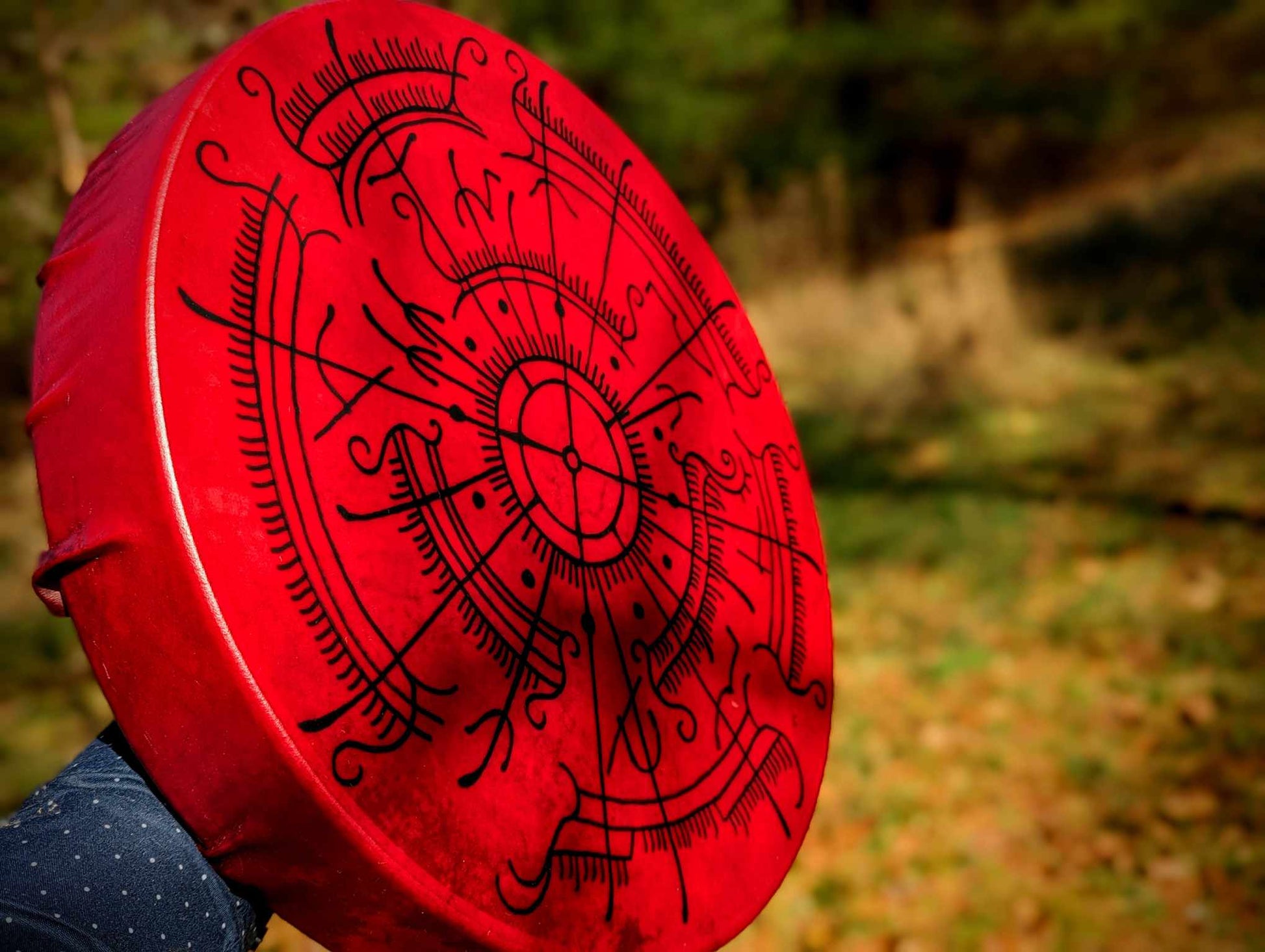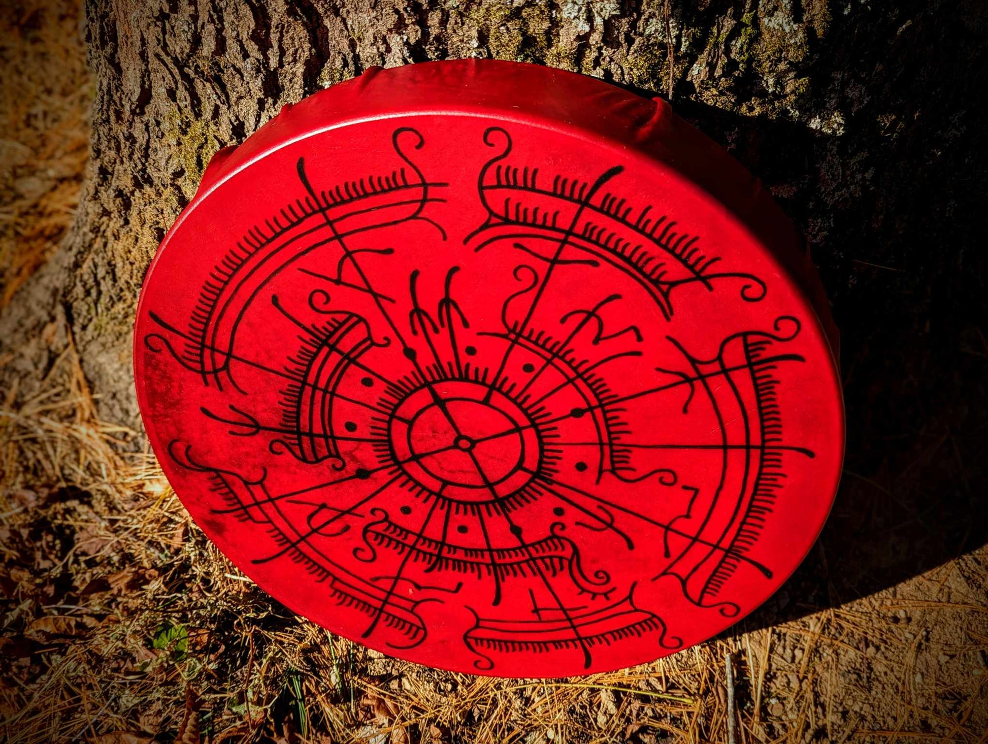 18 inch dyed red deer hide drum, with alder wood and buckskin beater. Hand painted artwork featuring Viking drakkar ships, with the drum itself representing the blood moon. Holding area is buckskin wrapped for comfort.
