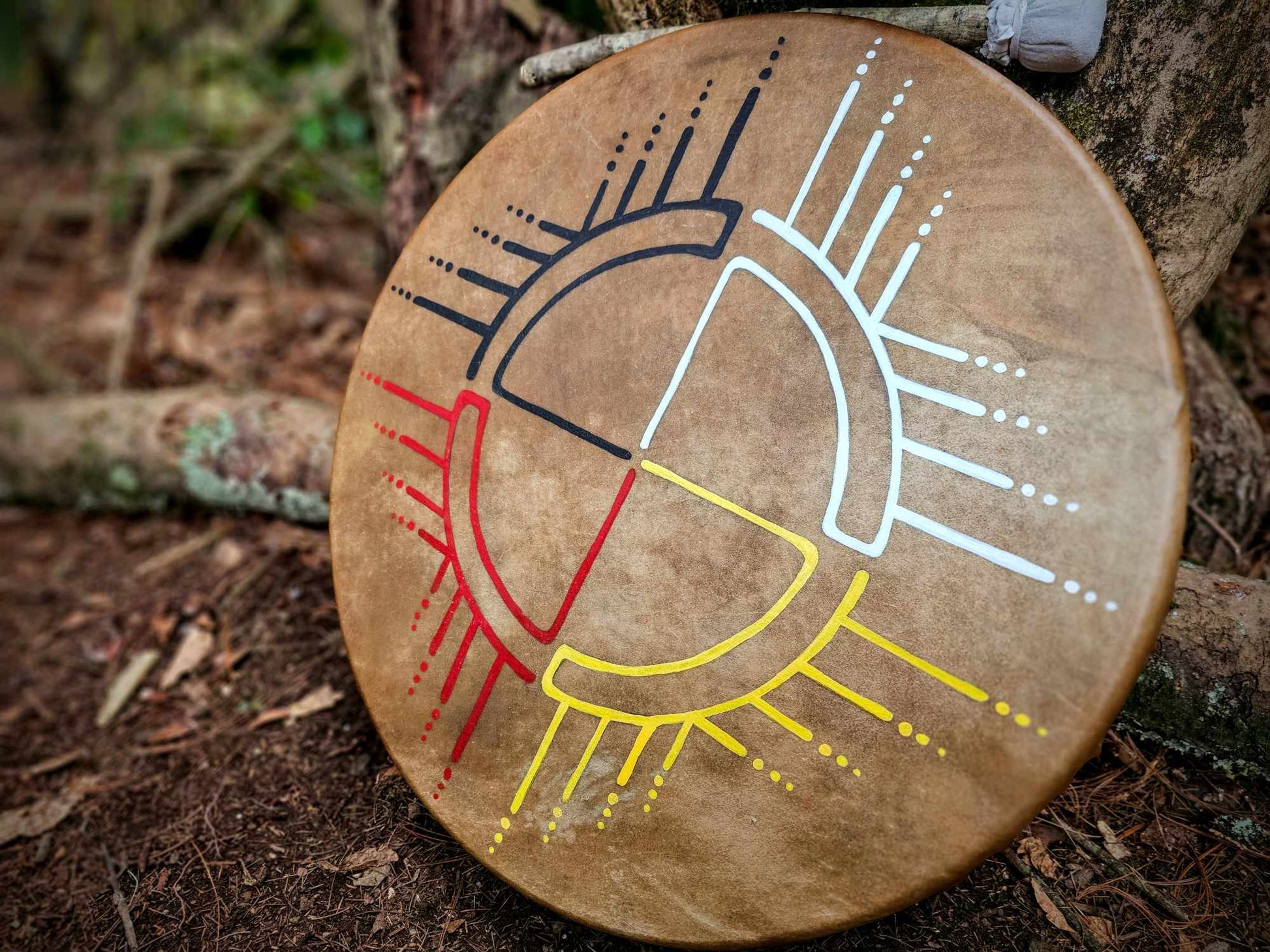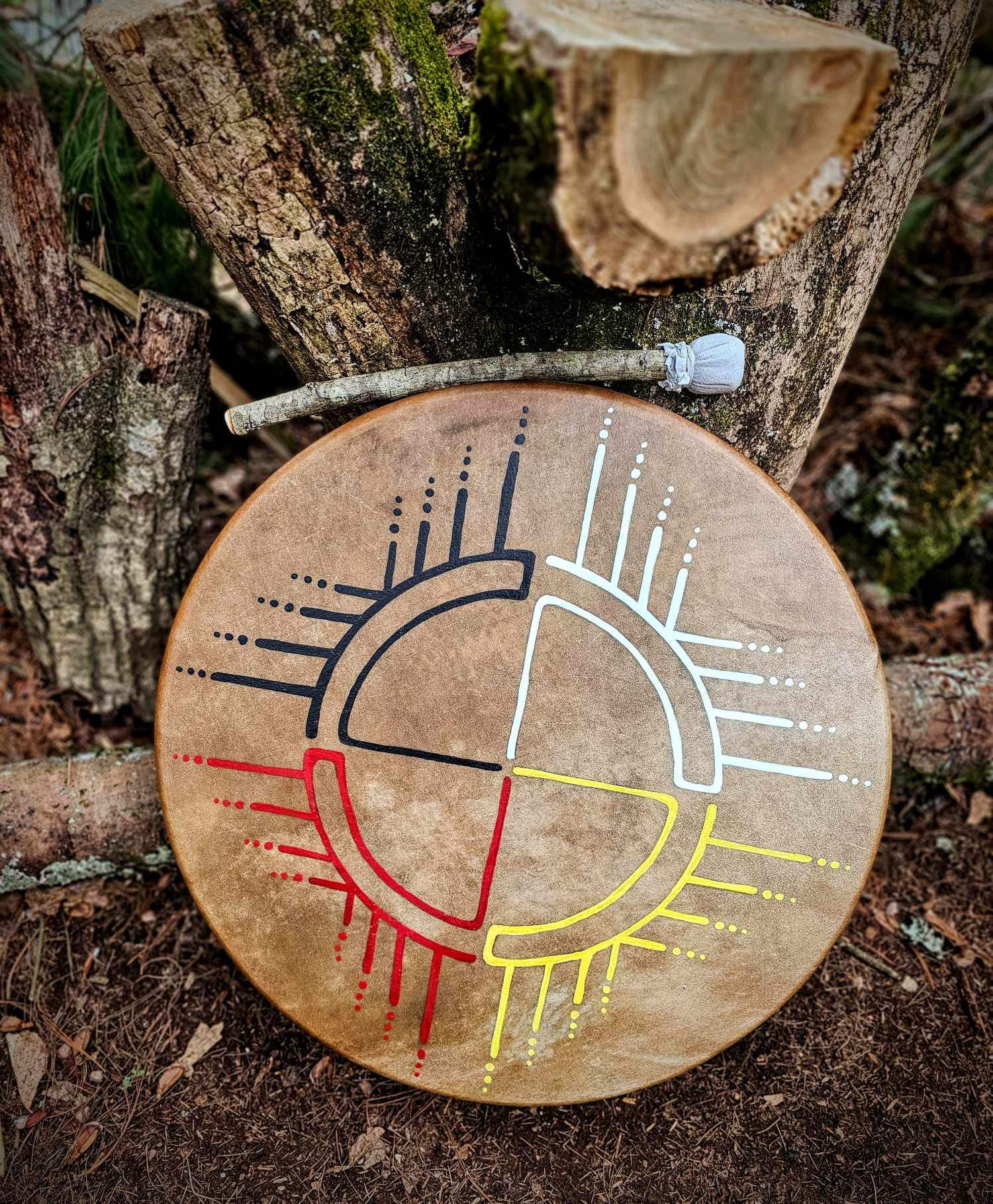 20" Bison Hide Drum With Beater | Hand Painted Four Directions Medicine Wheel Art