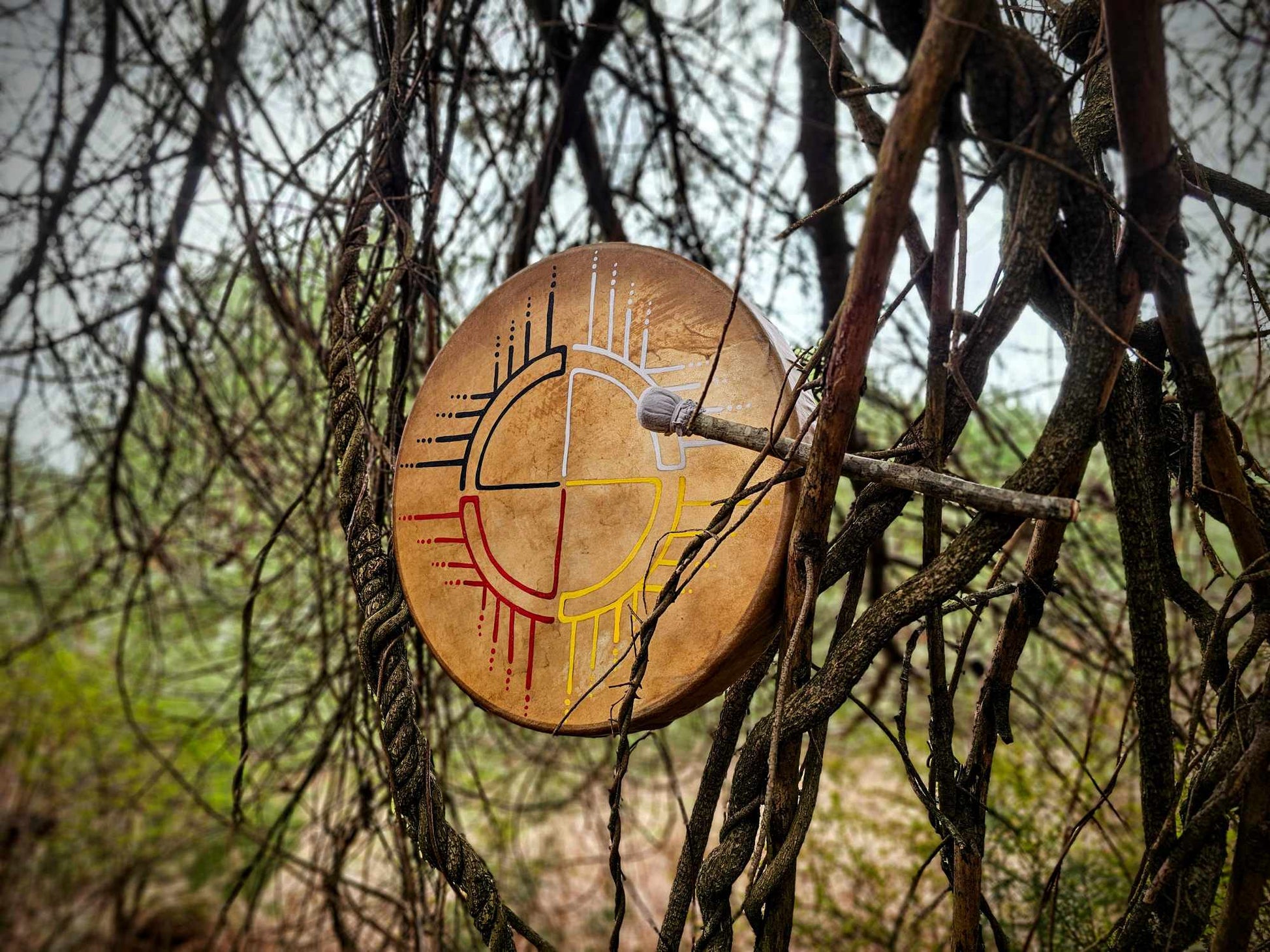 Colors painted representing the four directions and four elements. Natural bison/buffalo hide on handmade maple frame with an alder wood and buckskin beater.
