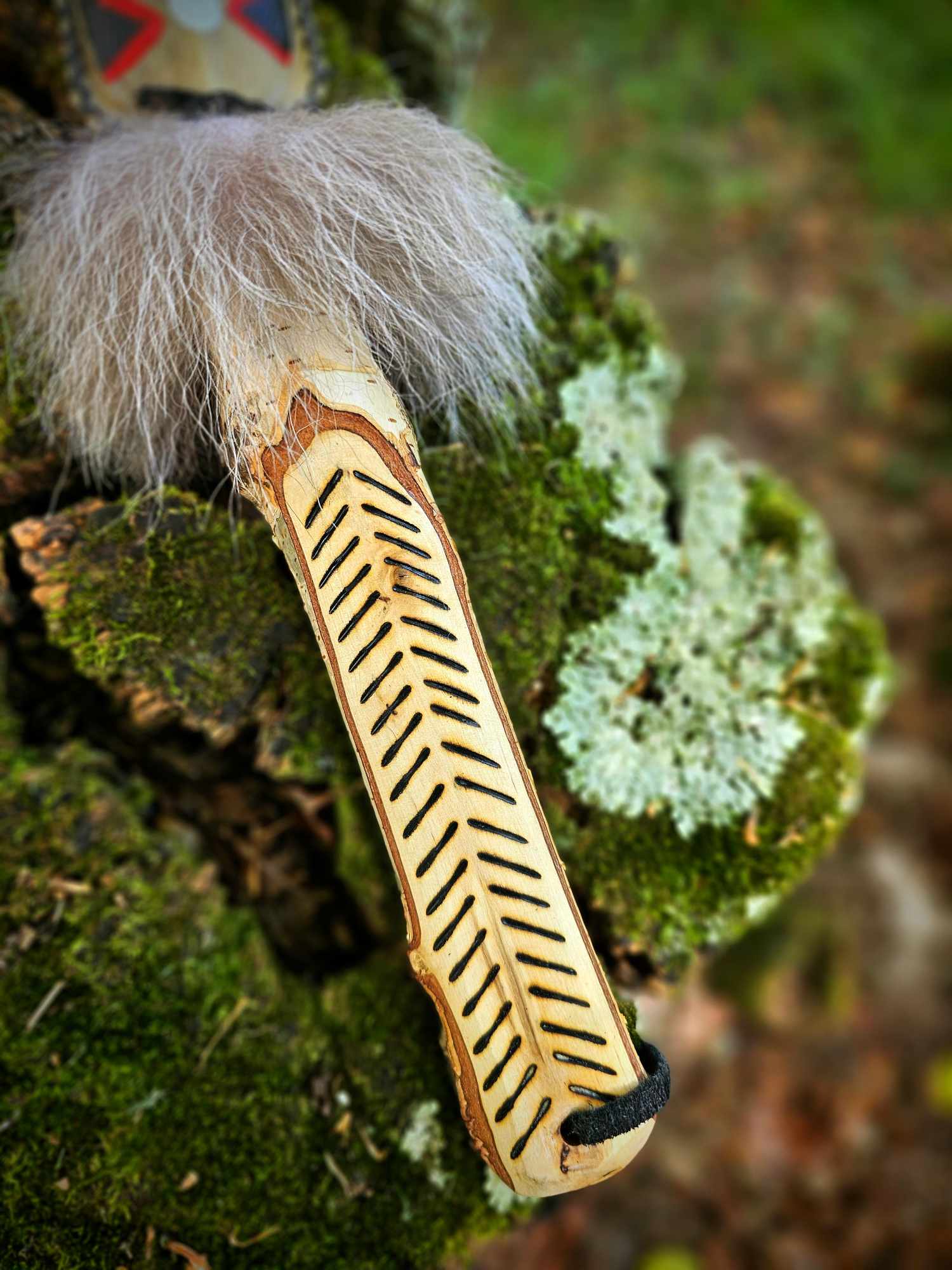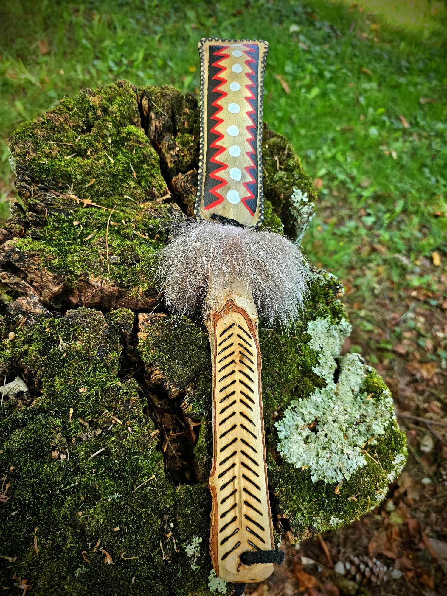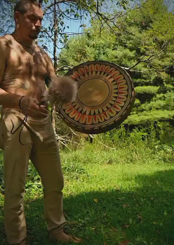 20" horse hide drum on a maple frame. Natural horse hide allows this animal to speak again in a new form. Hand painted artwork in concentric circles. Hand painted bear rawhide rattle head with buckwheat filler for a crisp, clear sound. Coyote fur skirt, hand burned and carved birch wood handle, and leather ties. Wolf fur head drum beater + weeping cherry wood handle with leather wrap and hanger.
