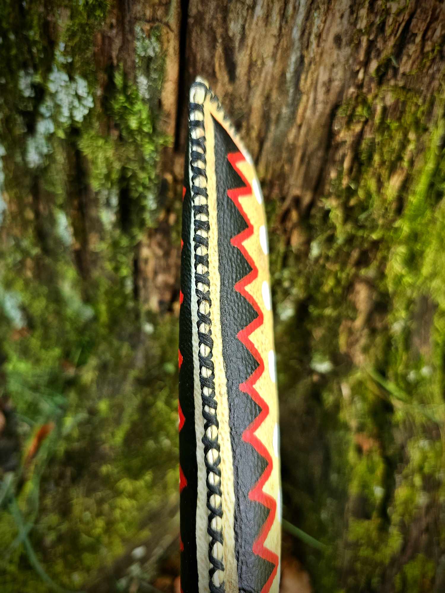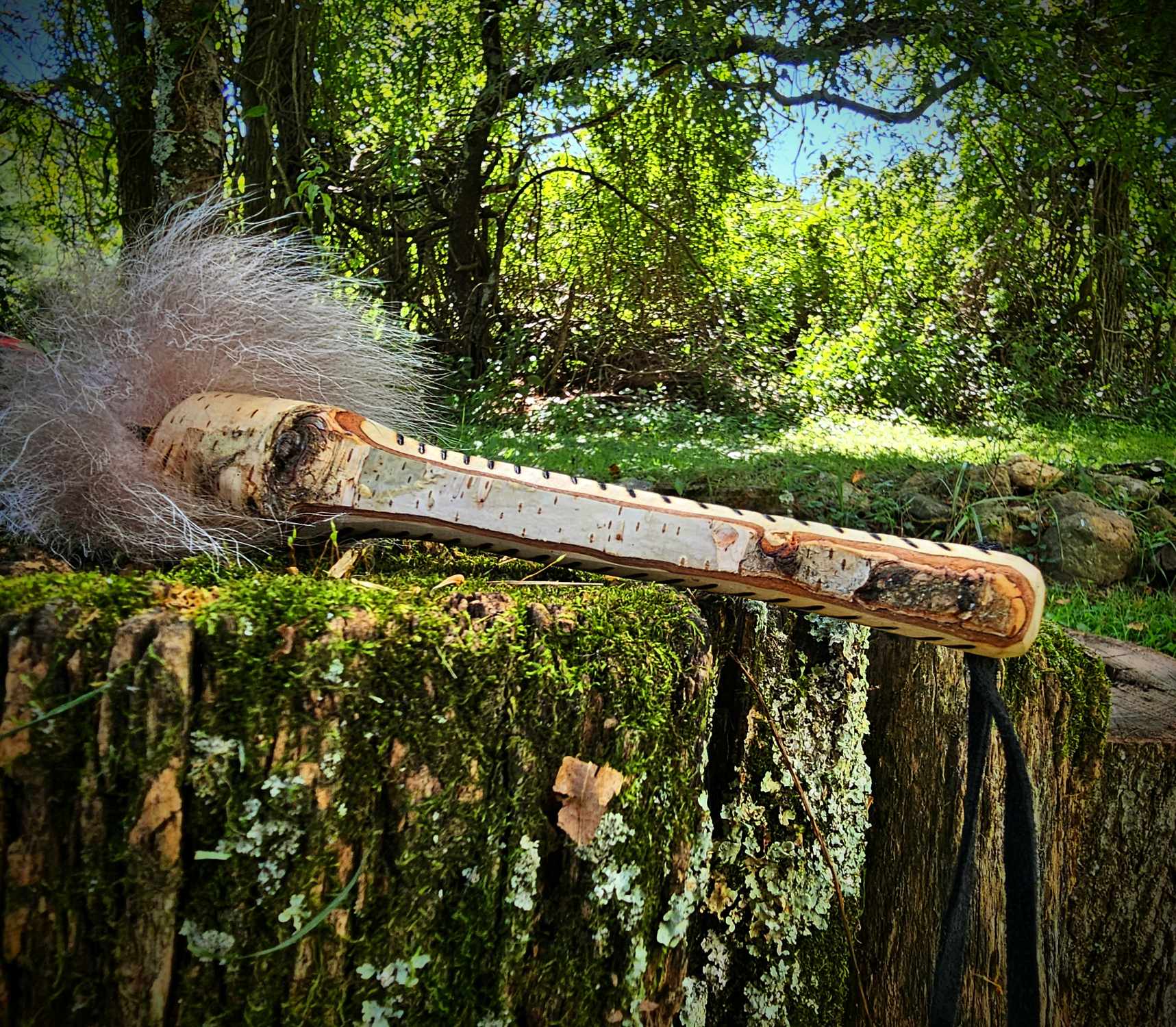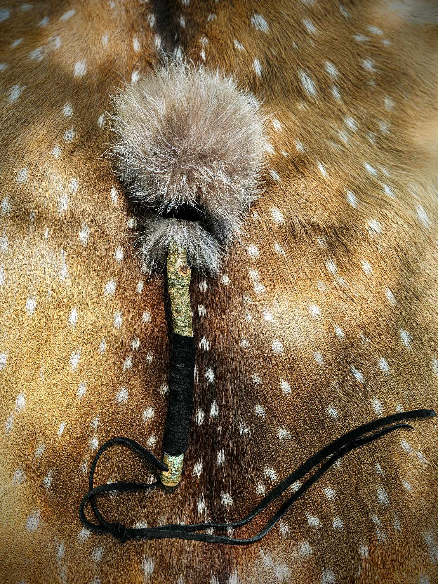 20" horse hide drum on a maple frame. Natural horse hide allows this animal to speak again in a new form. Hand painted artwork in concentric circles. Hand painted bear rawhide rattle head with buckwheat filler for a crisp, clear sound. Coyote fur skirt, hand burned and carved birch wood handle, and leather ties. Wolf fur head drum beater + weeping cherry wood handle with leather wrap and hanger.