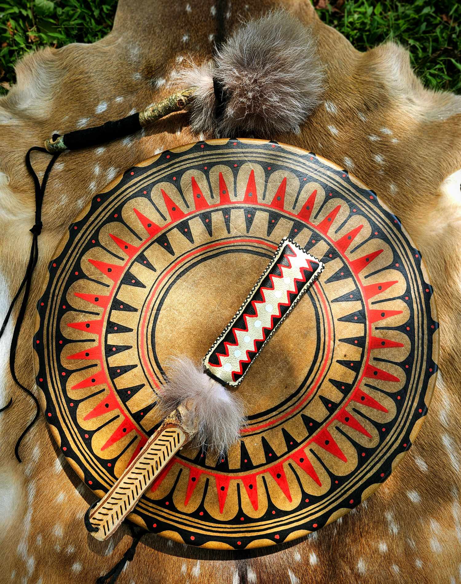 20" Hand Painted Horse Hide Drum + Coyote Rattle & Wolf Drum Beater