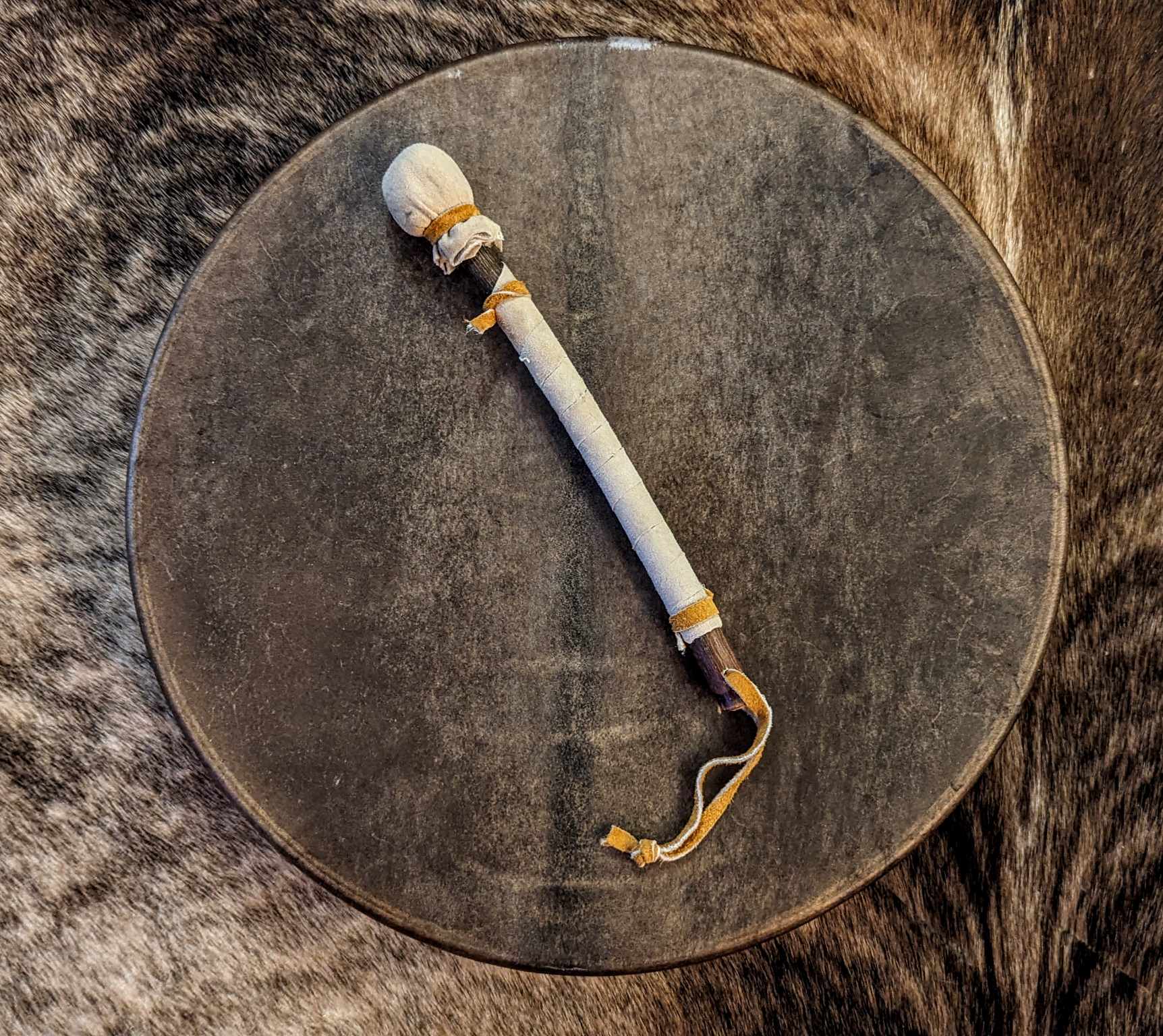 20" horse hide drum, featuring a naturally dark skin with central stripe on a maple frame. Hold has been wrapped with buckskin for comfort. Alder wood stick with buckskin head and wrap with incorporated hanger. Can be painted with oil based paint to personalize. If you would like me to add artwork inspired by you it can be done for an additional $50.