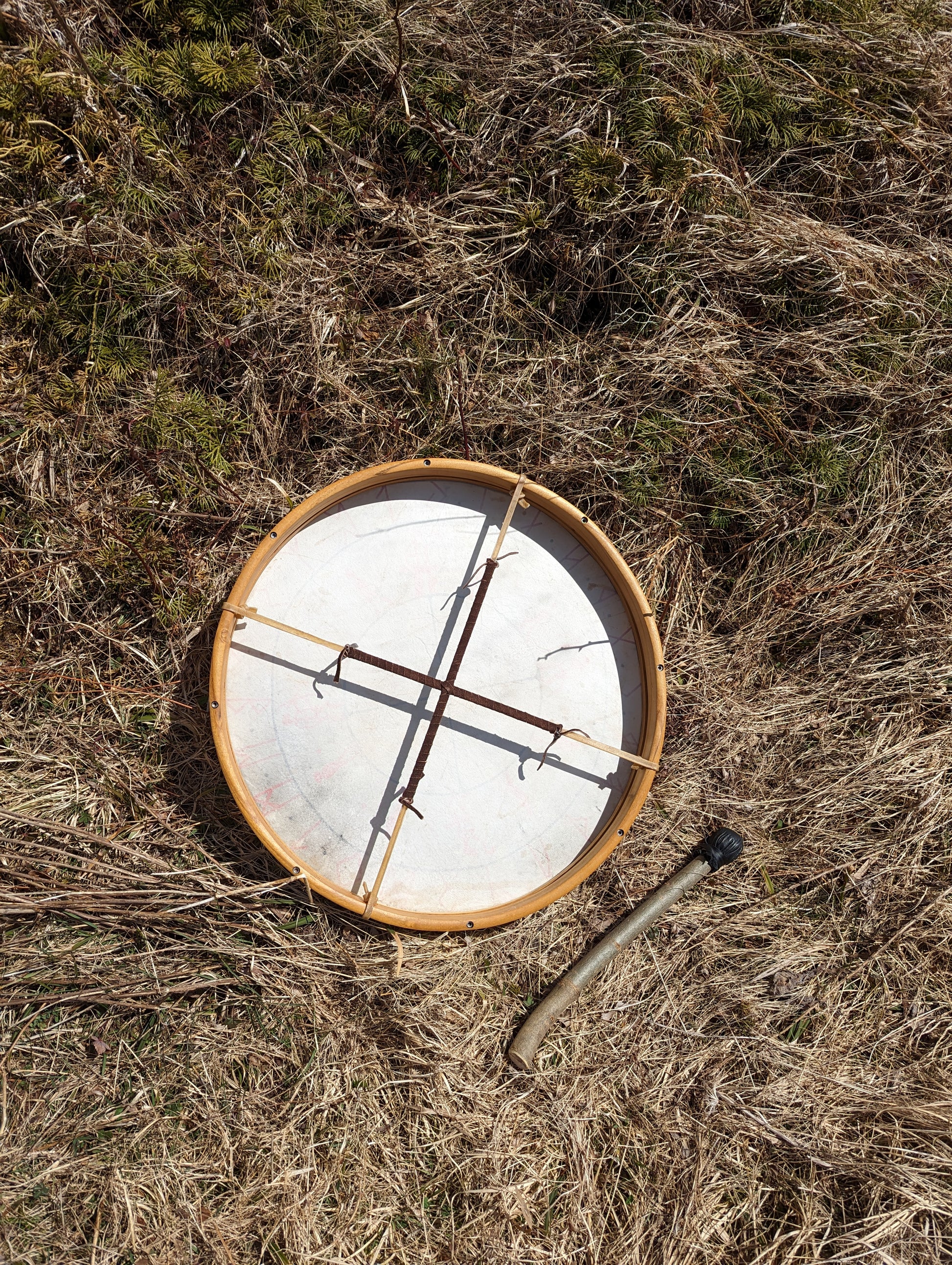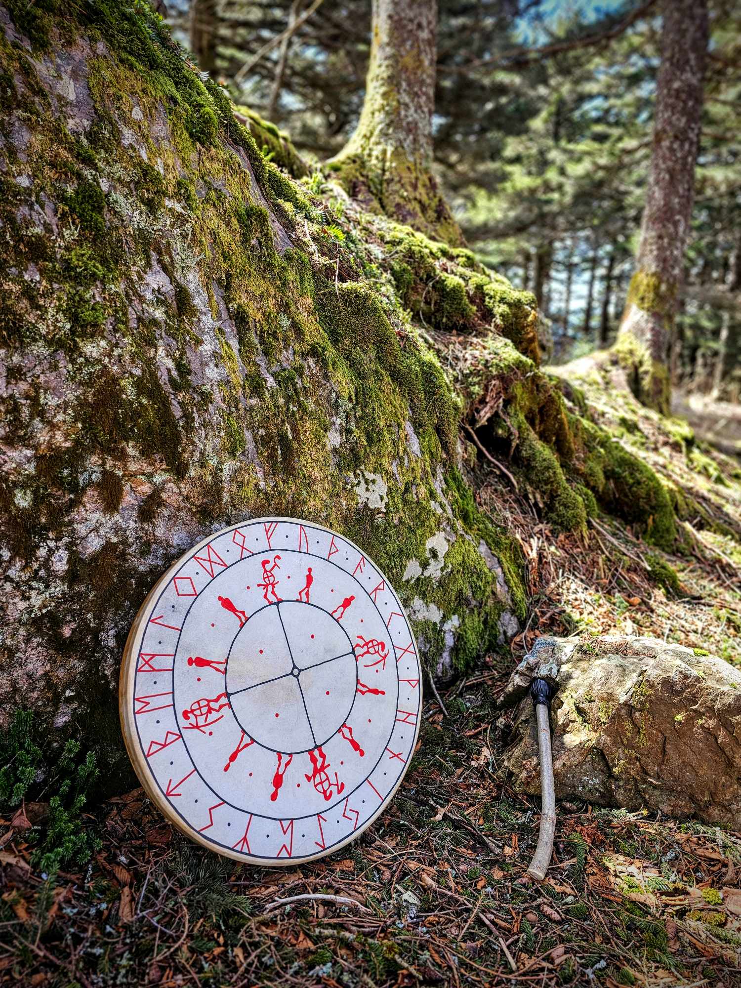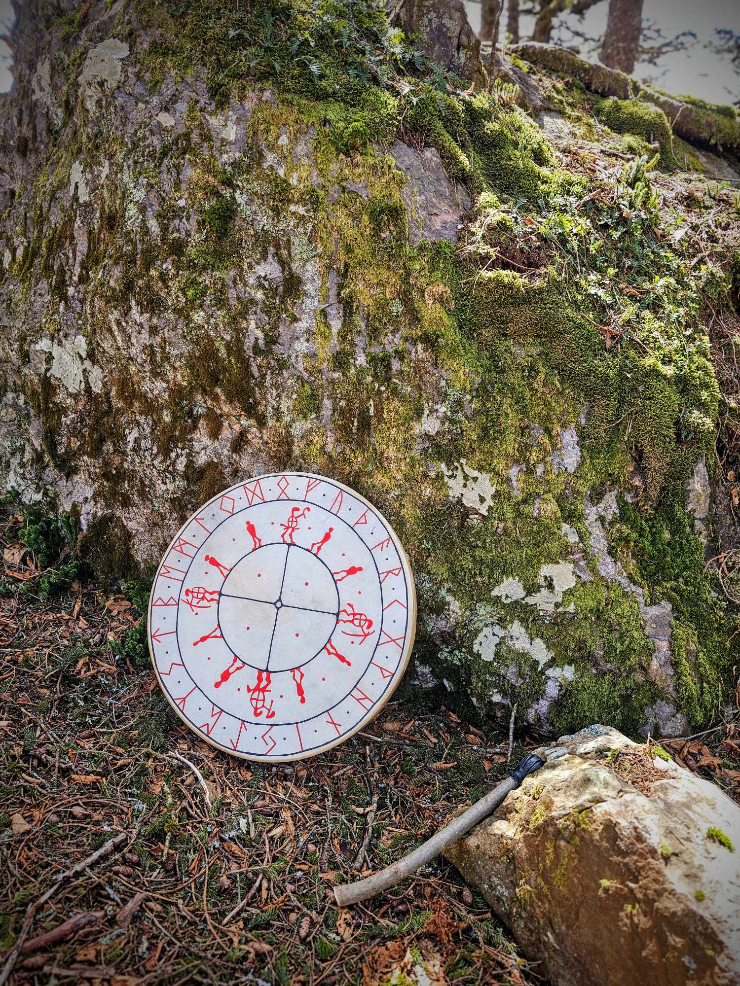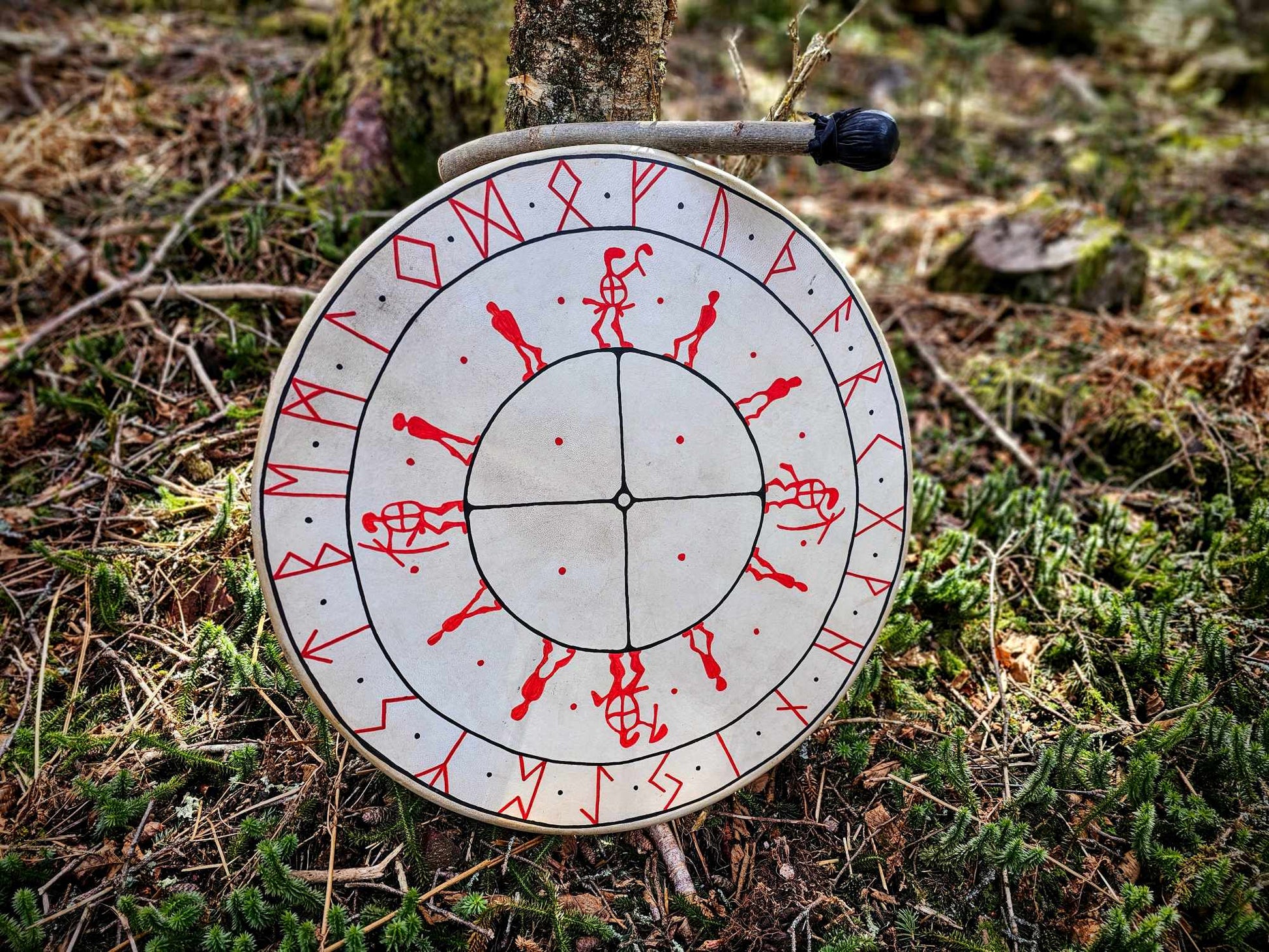 Tunable frame for ease of use in all humidity conditions. Artwork features the Elder Futhark runes and a circle of Nordic petroglyphs around a sunwheel. 22" and powerful.
