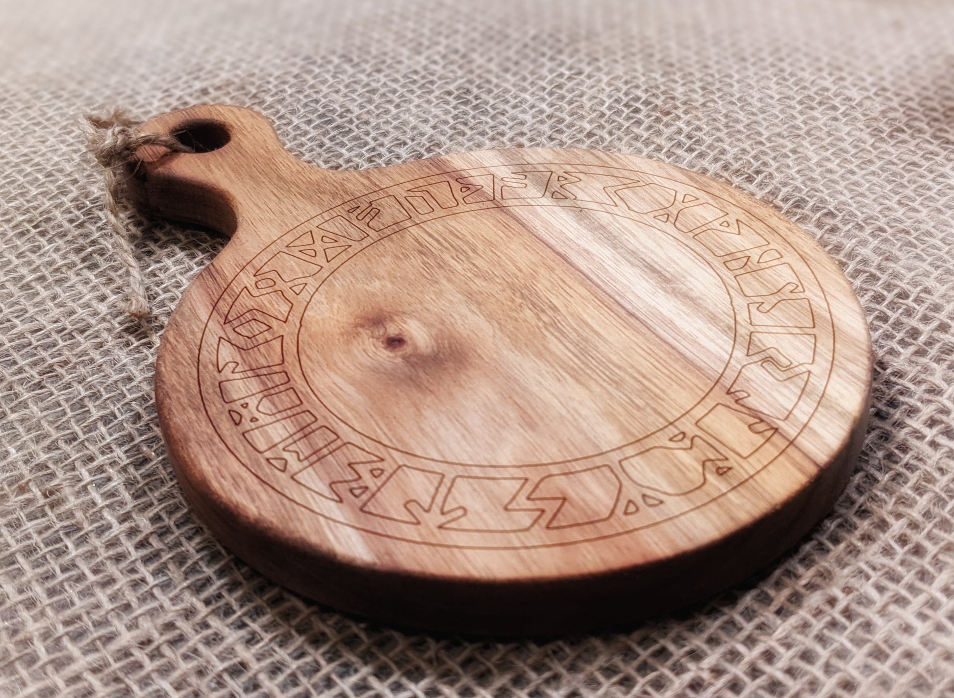 Acacia wood mini cutting board, engraved with an Elder Futhark Rune circle. Can be used as intended, or as a candle base, decor, anything you wish. It would make a thoughtful housewarming gift. Wipe clean.