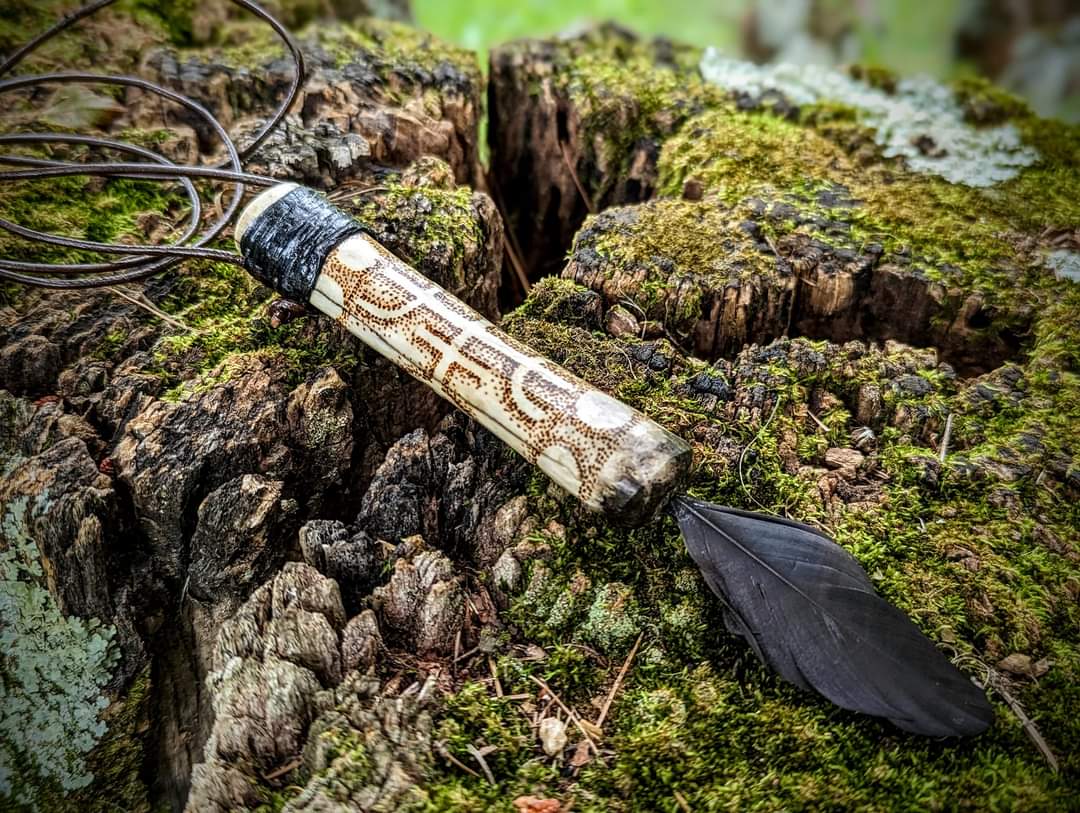 Hand burned 9 Moons Protection Stave Deer Bone Talisman with Crow Feather.