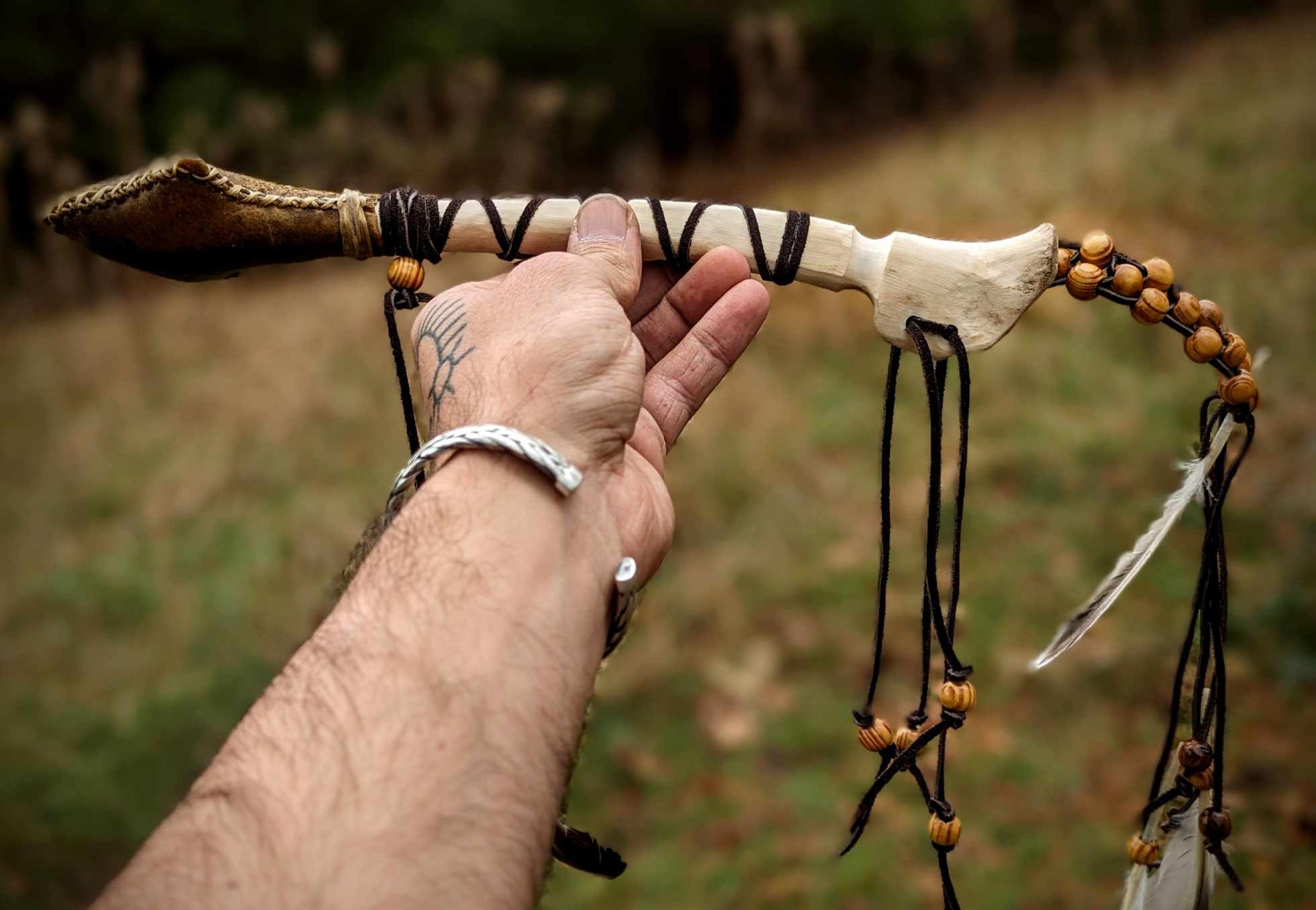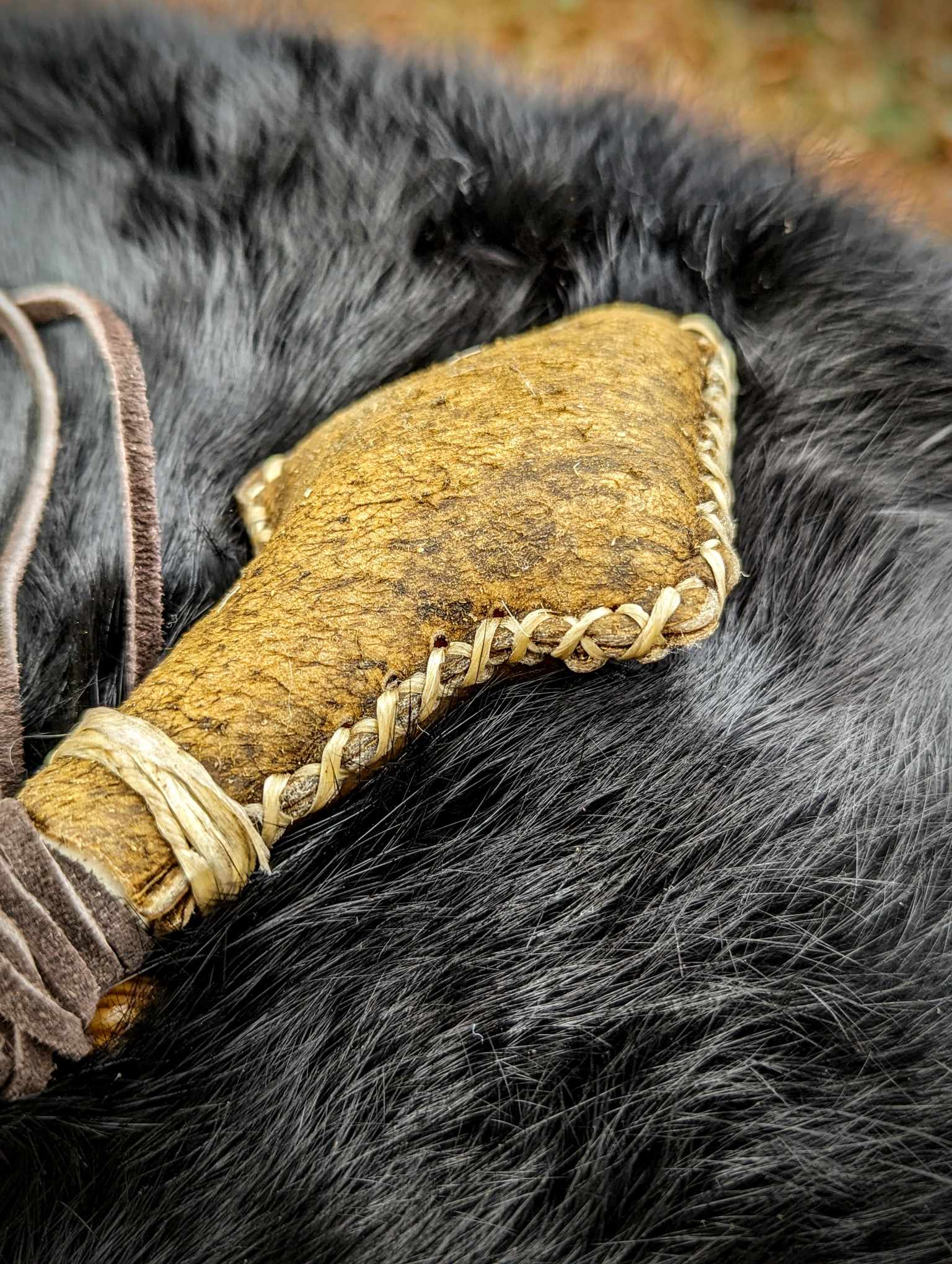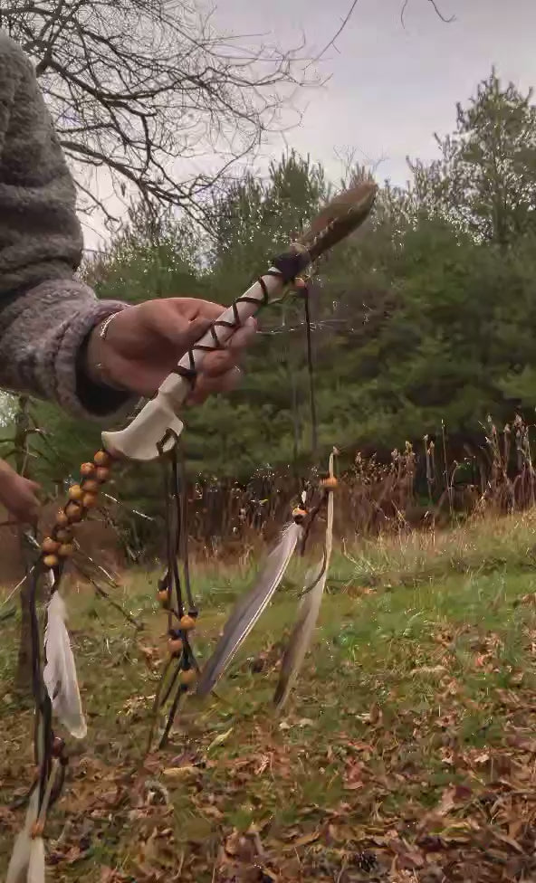 Bear Hide Arrow Shaman Rattle Deer Bone Handle Wood Beaded With Duck Feathers