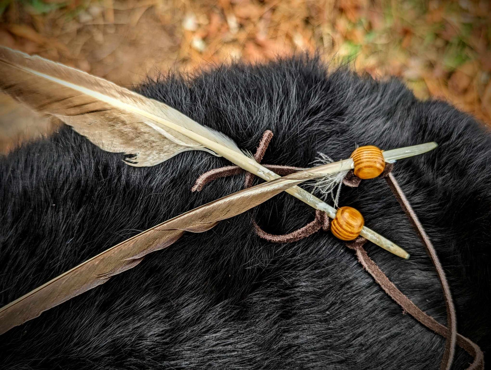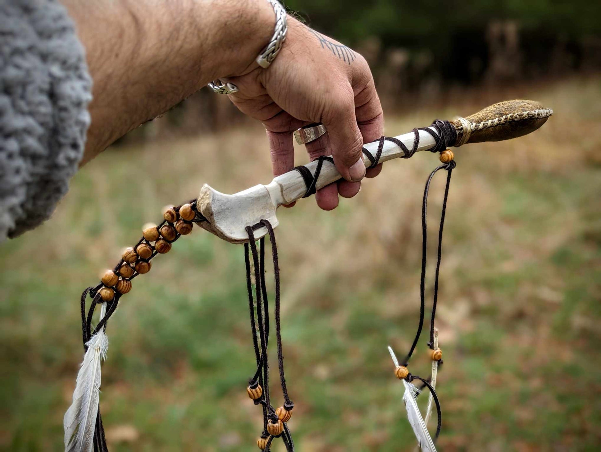 This traditional arrowhead rattle features a bear skin arrowhead, deer bone handle, duck feathers, suede cord wrap, and decorative wood beads.