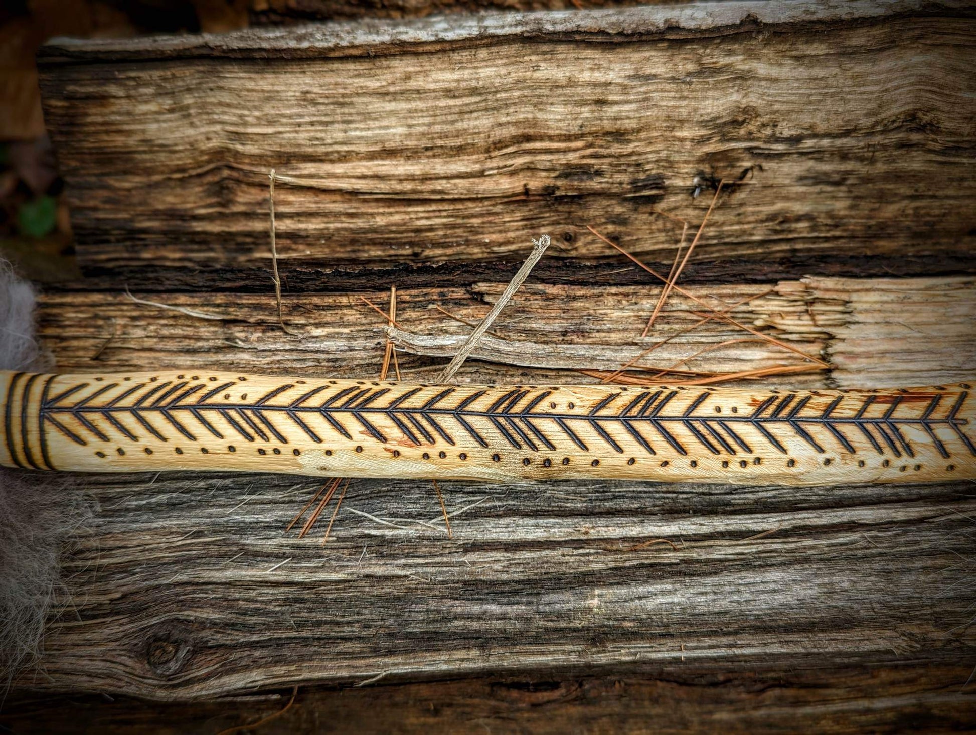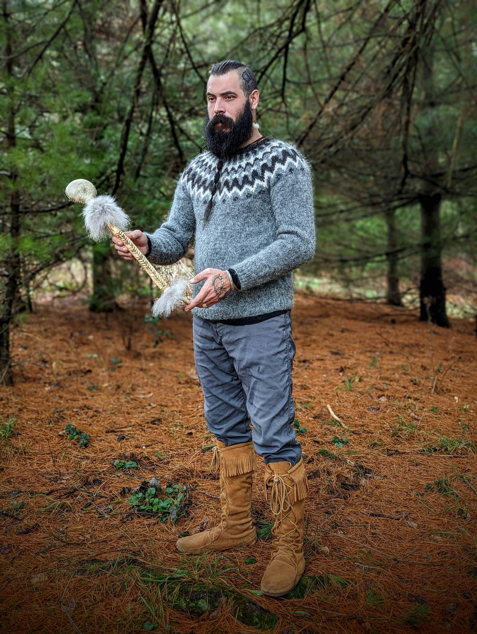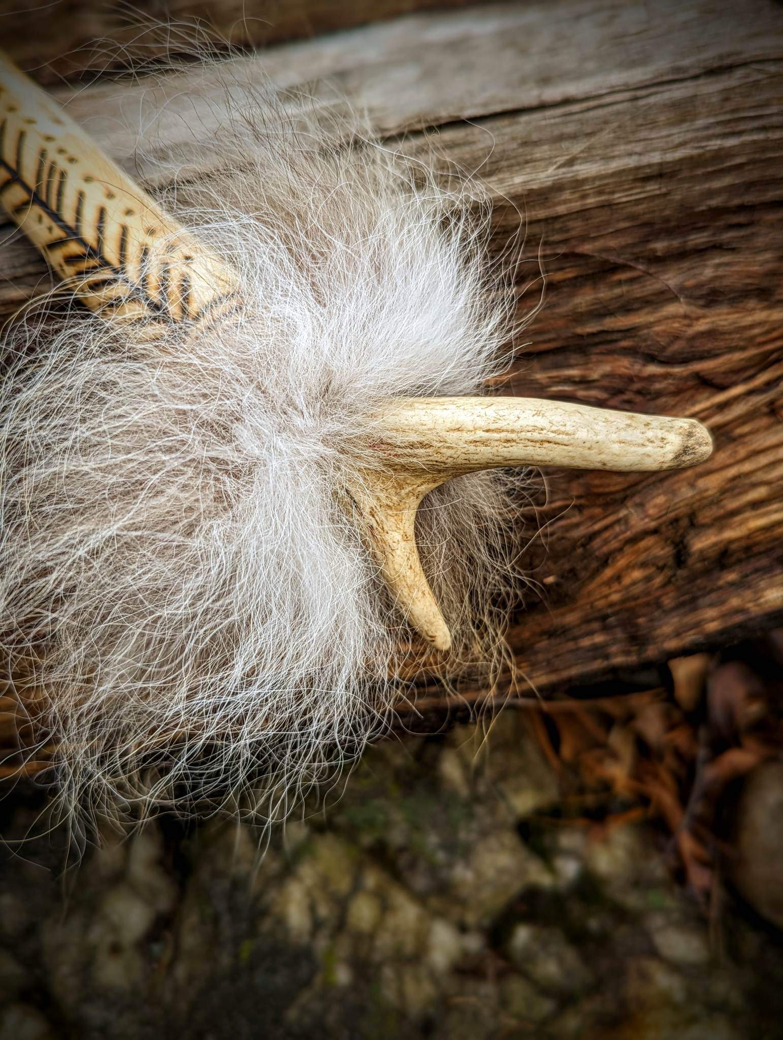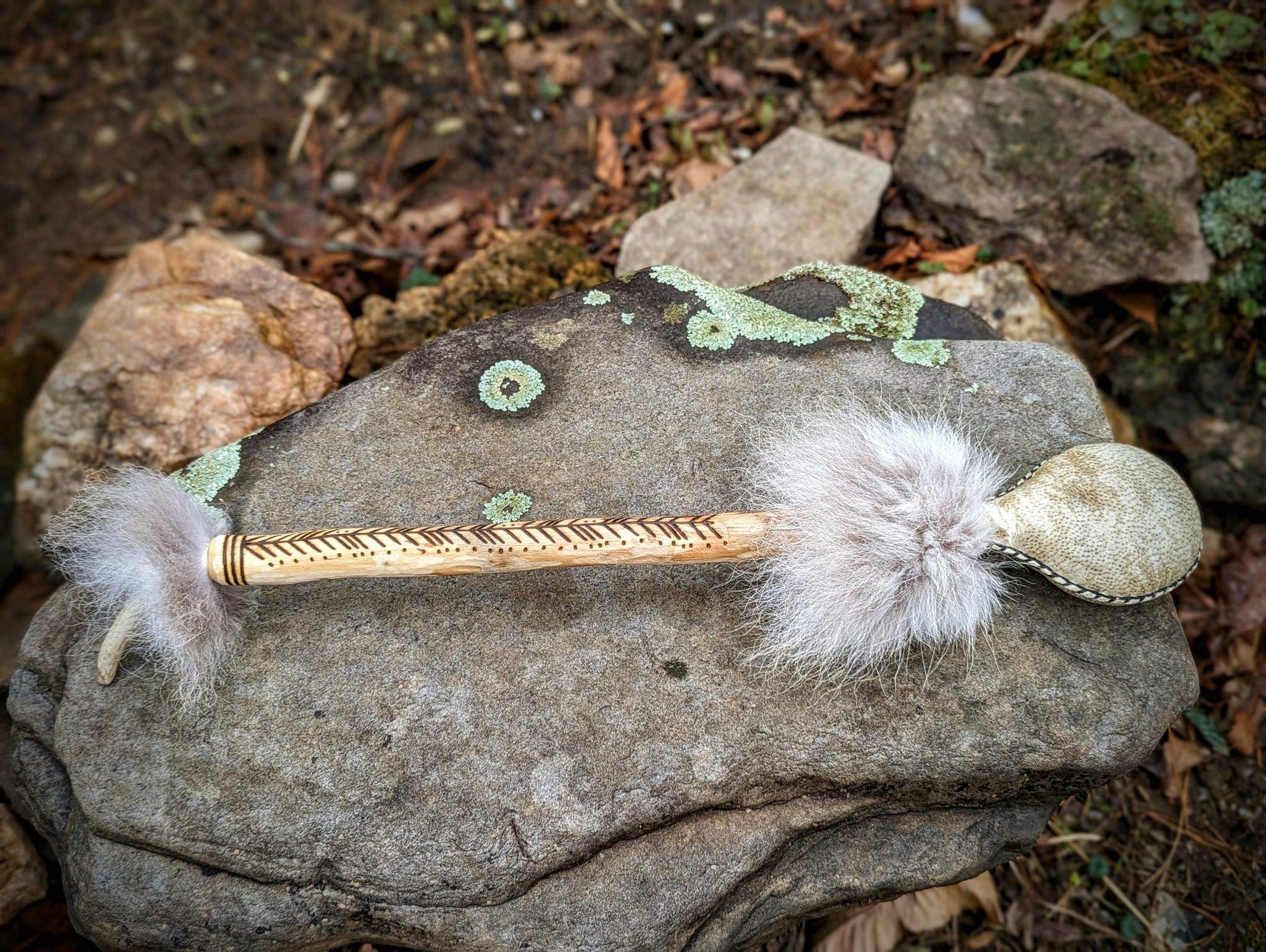 Bear skin head, Elk sinew, wof fur trim on pacific Arbutus evergreen hardwood, with a deer antler at the base. Filled with buckwheat for crisp sound. 24" long. Hand burned artwork on shaft represents the life of the forest.