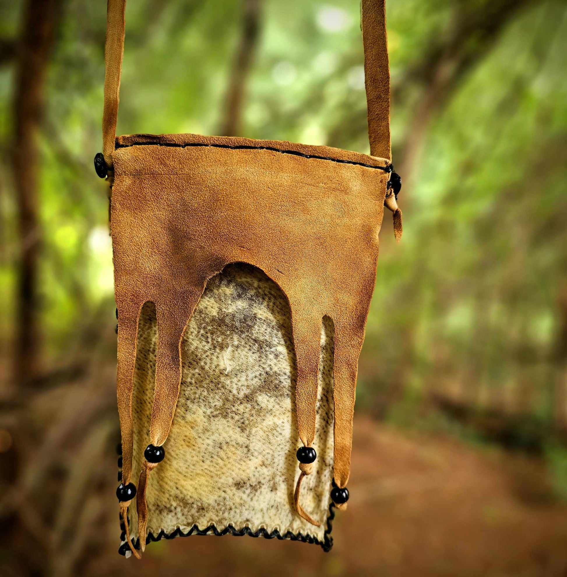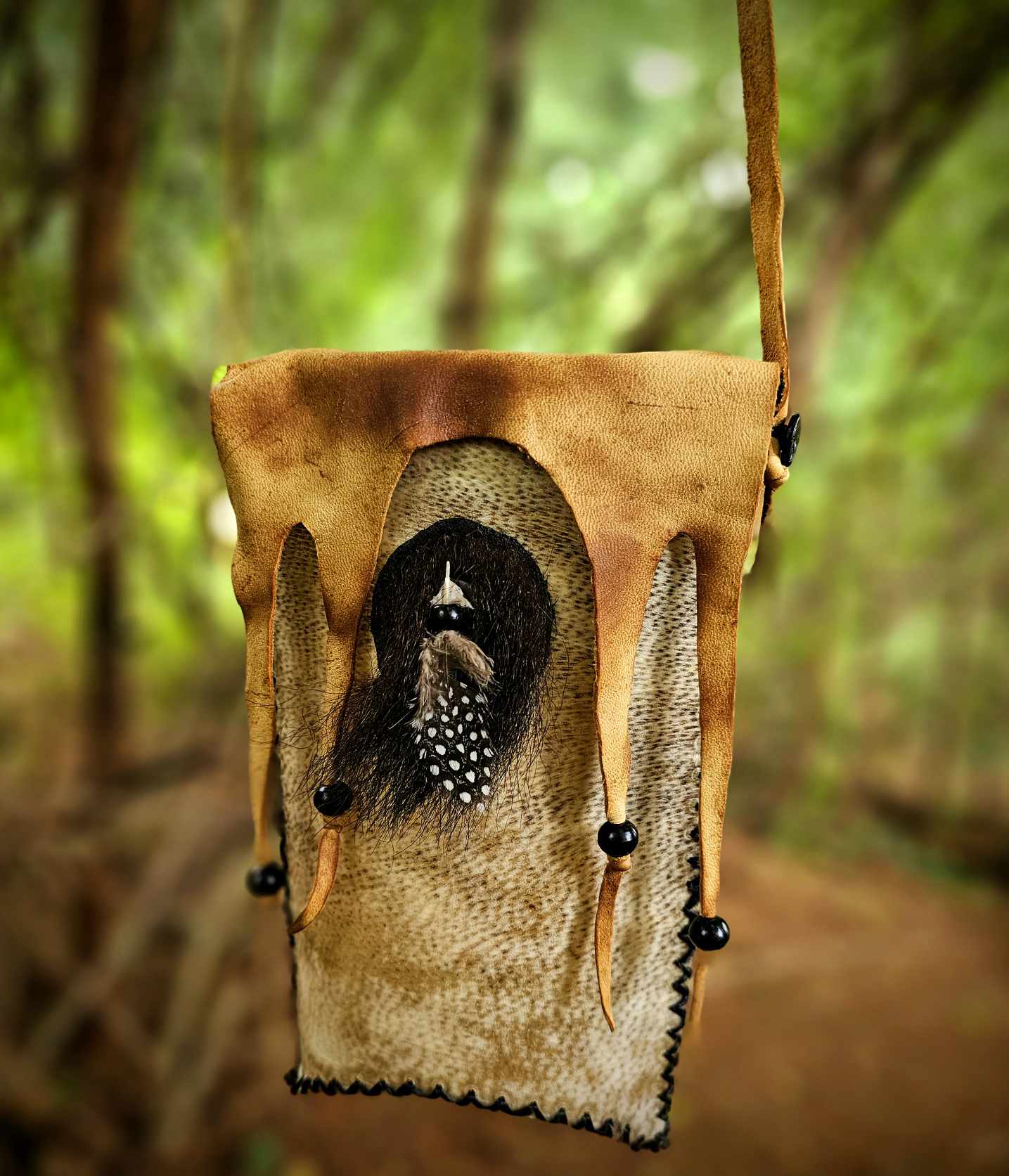 Hard-shell possibles/foraging bag. bear skin rawhide bag, medallion is hair-on bear hide, buffalo horn bead, and guinea feather. Trim, flap cover, and strap are oiled buckskin and buffalo horn bead. Measures 9" tall, 5" wide. 25" strap. See photo of me wearing it for size.