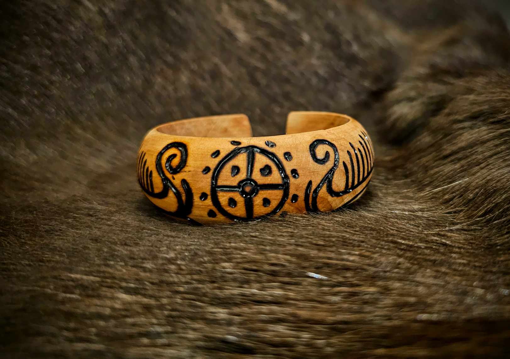Beechwood Hand Burned Petroglyph Viking Ship And Sunwheel Bracelet