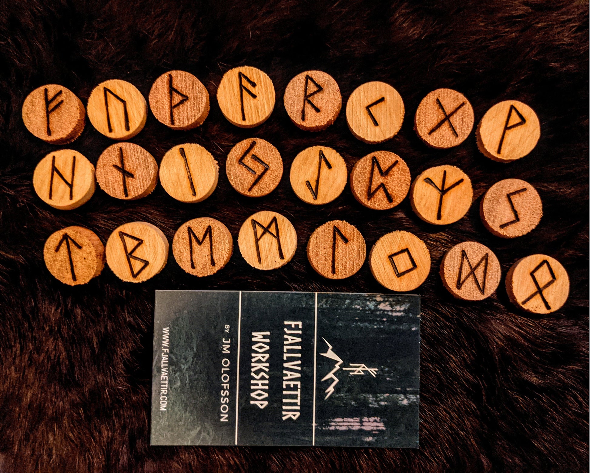 Complimentary varying shades of natural brown, in cherry and mahogany wood, burned with the Elder Futhark runes. Great set for someone that wants something different from what there is out there. 3/4" inch. Comes with a natural cotton bag.