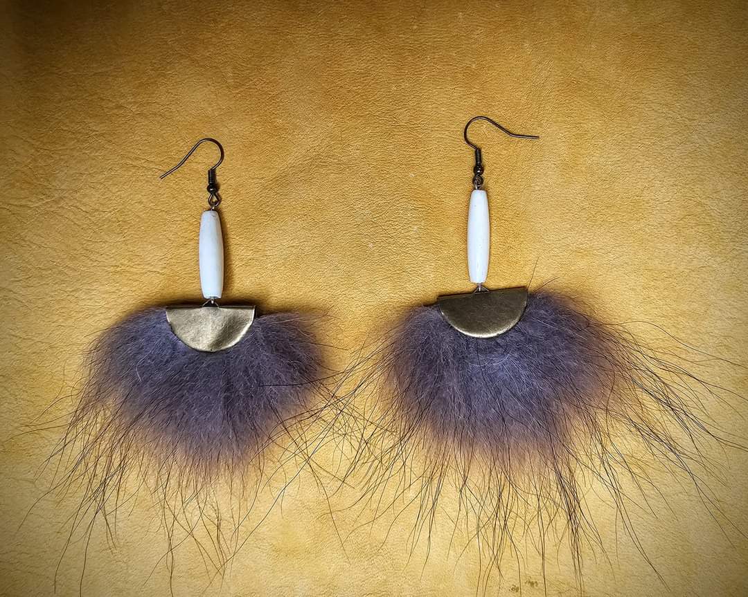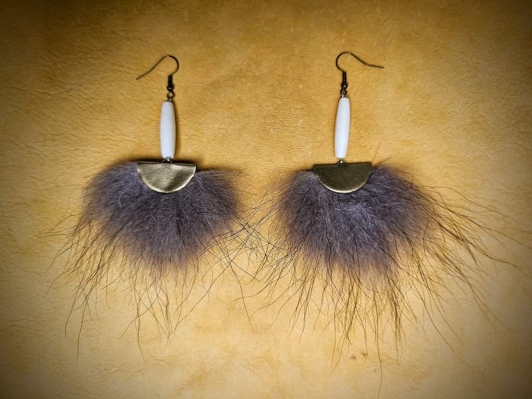 Bison bone bead and wolf hair earrings, handmade and one of a kind. Nickel free earwires.