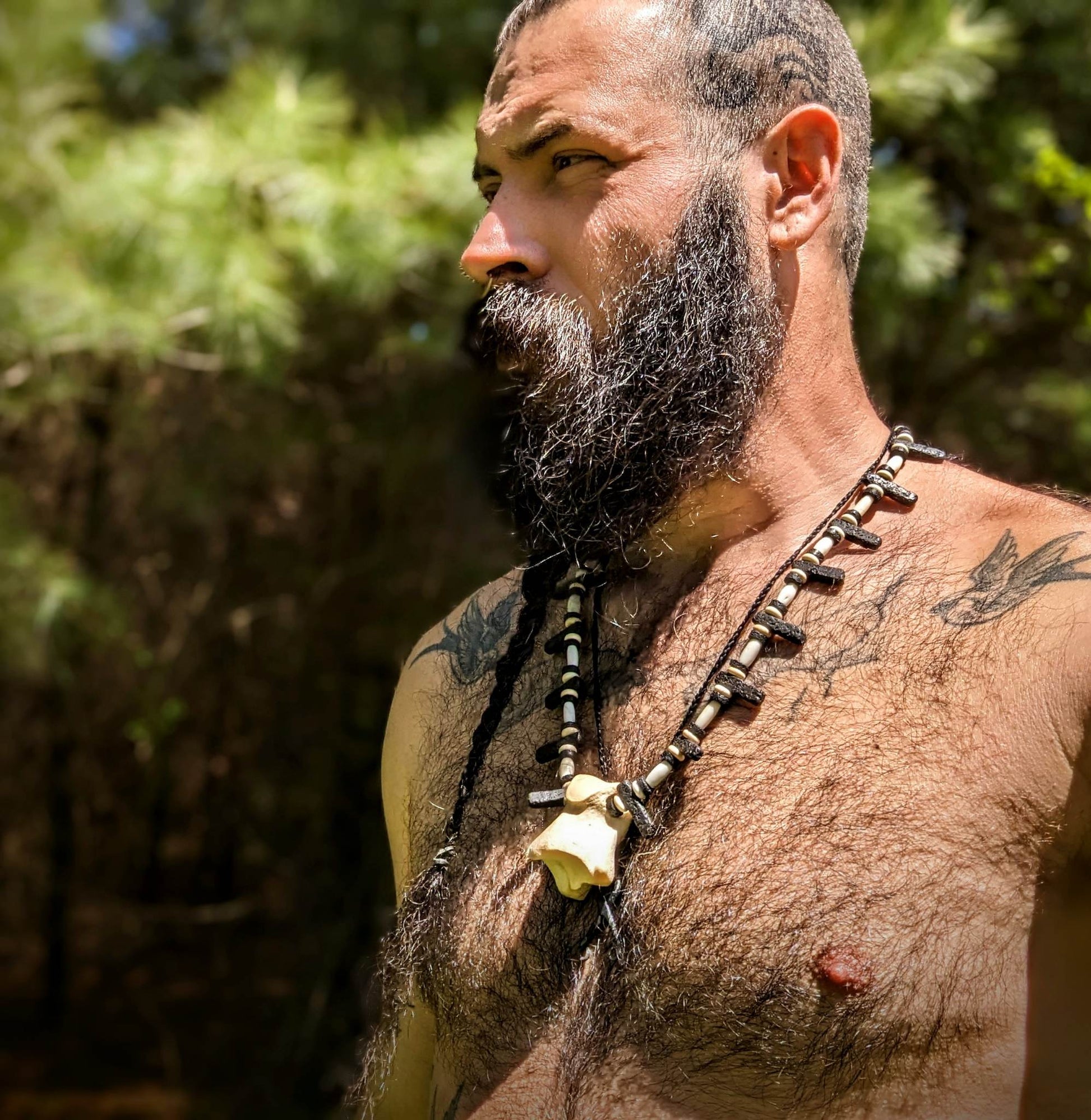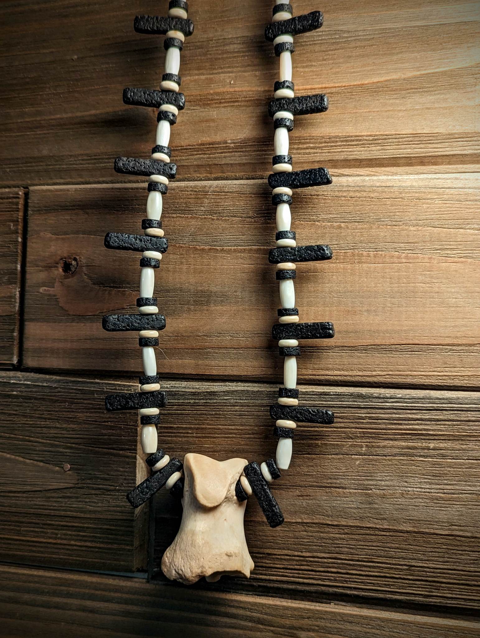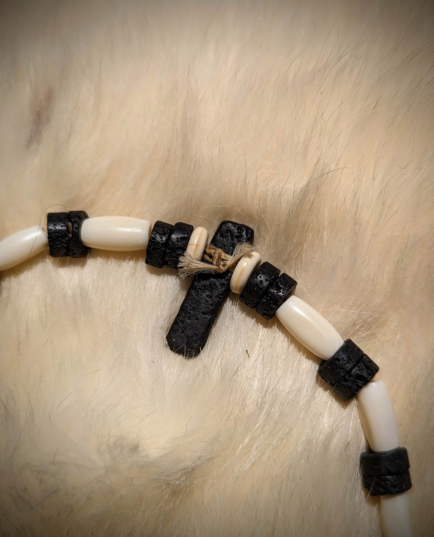Elk knuckle pendant, on a sinew cord strung with lava beads and bison bone beads. Add dot algiz.