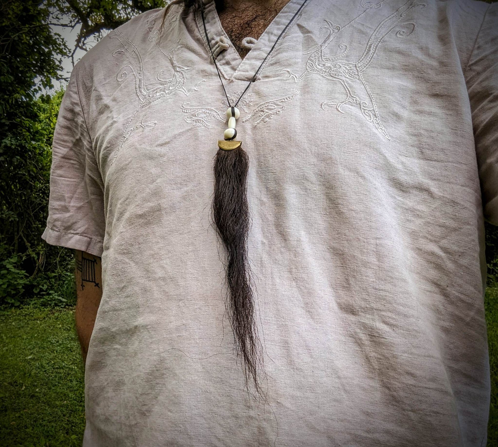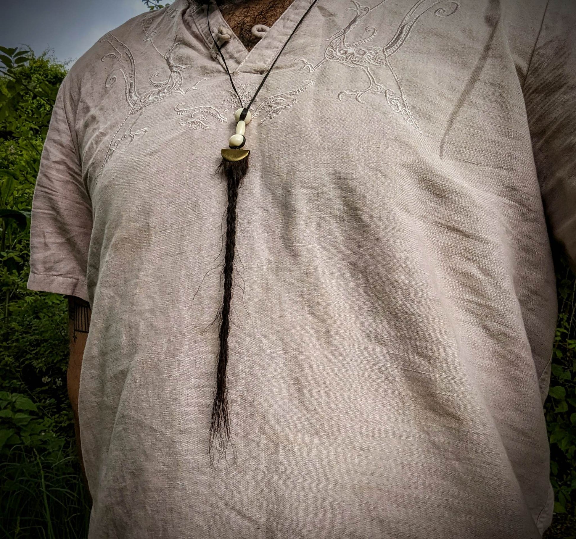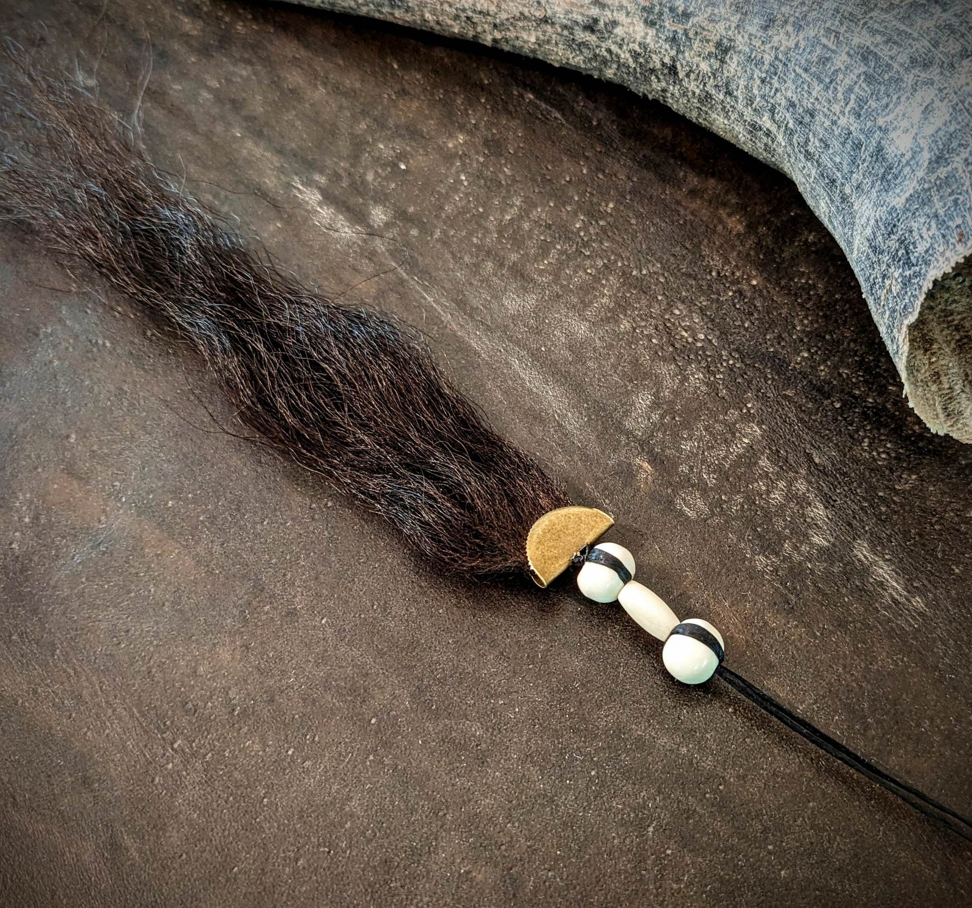 Created with the ritual of calling or petitioning ancestors for courage, strength, and will in times of need. I chose Bison hair as it can be braided (a bonus if you incorporate the sacredness of braiding in your personal practice, and to decorate or personalize by adding your own beads to) and bovine bone beads as all domestic cattle are descendents of the Aurochs (ᚢ); one to represent the ancestors, one to represent the self, and connected or bridged by a bison bone tube. Strung on waxed black cord, brass hardware. Can be worn around the neck, carried with you, or hung anywhere.