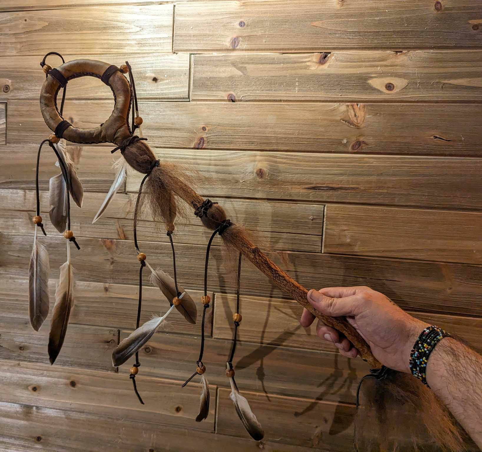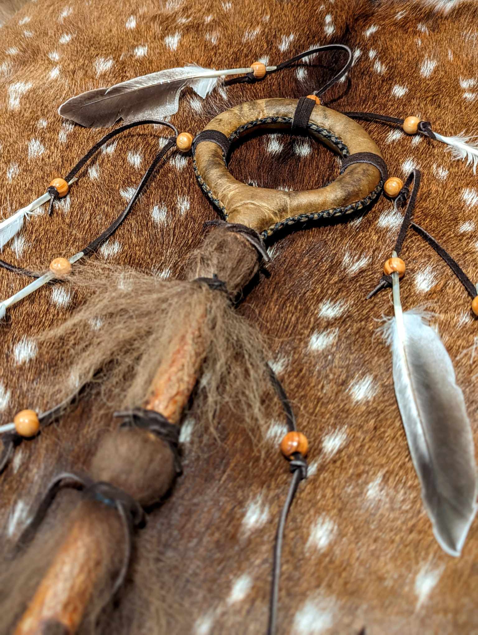 Bison Hide Loop Shaman Rattle Hand Crafted from Birch Wood Duck Feathers and Buffalo Hide | Meditation Rattle | Sound Healing