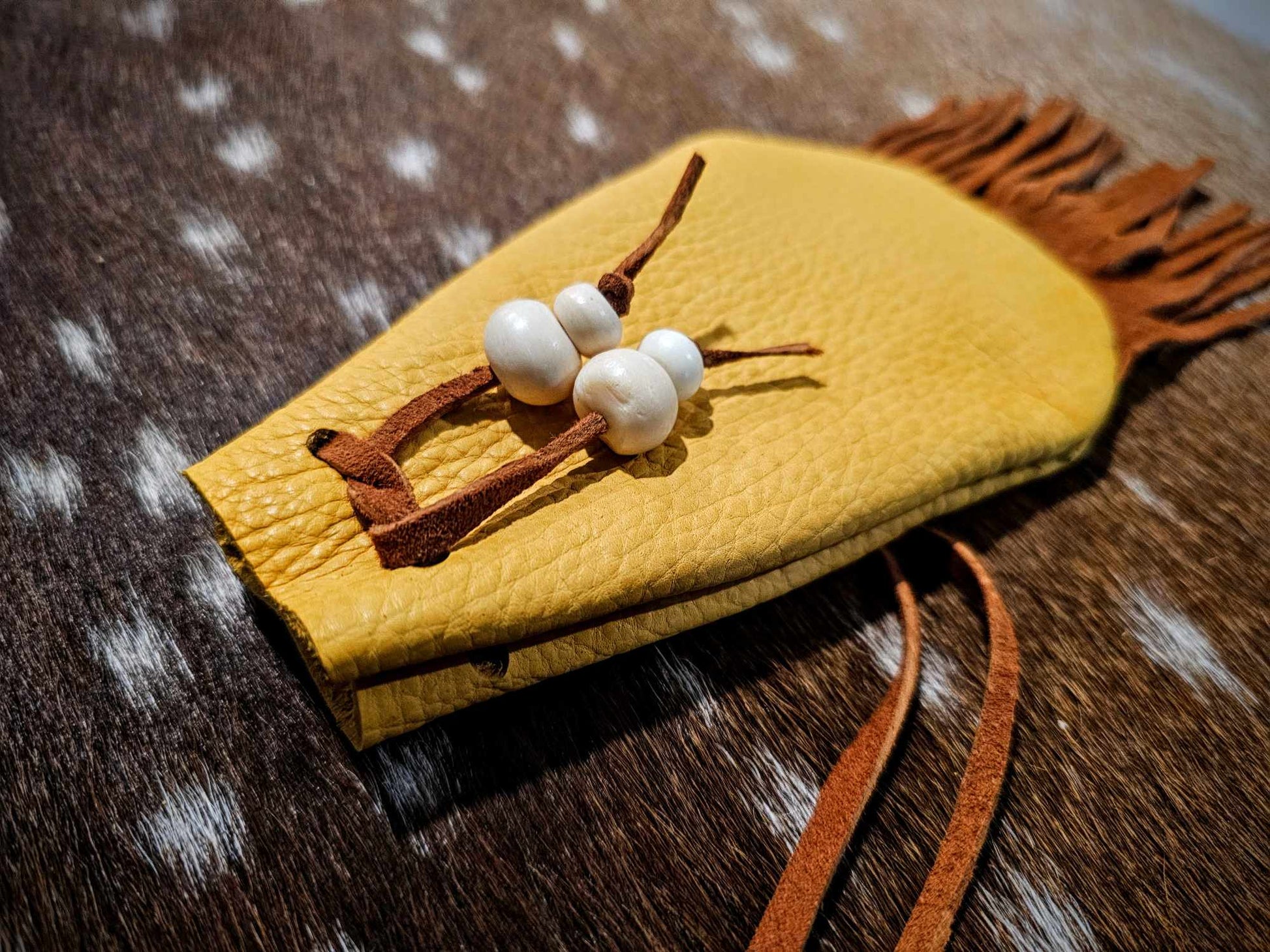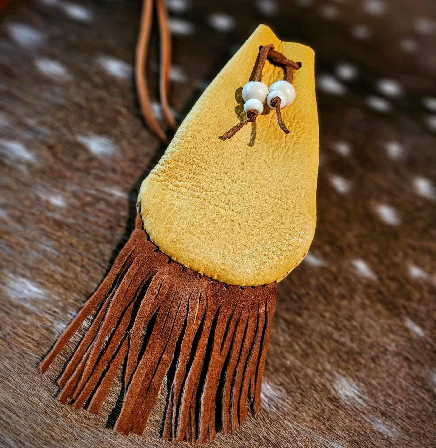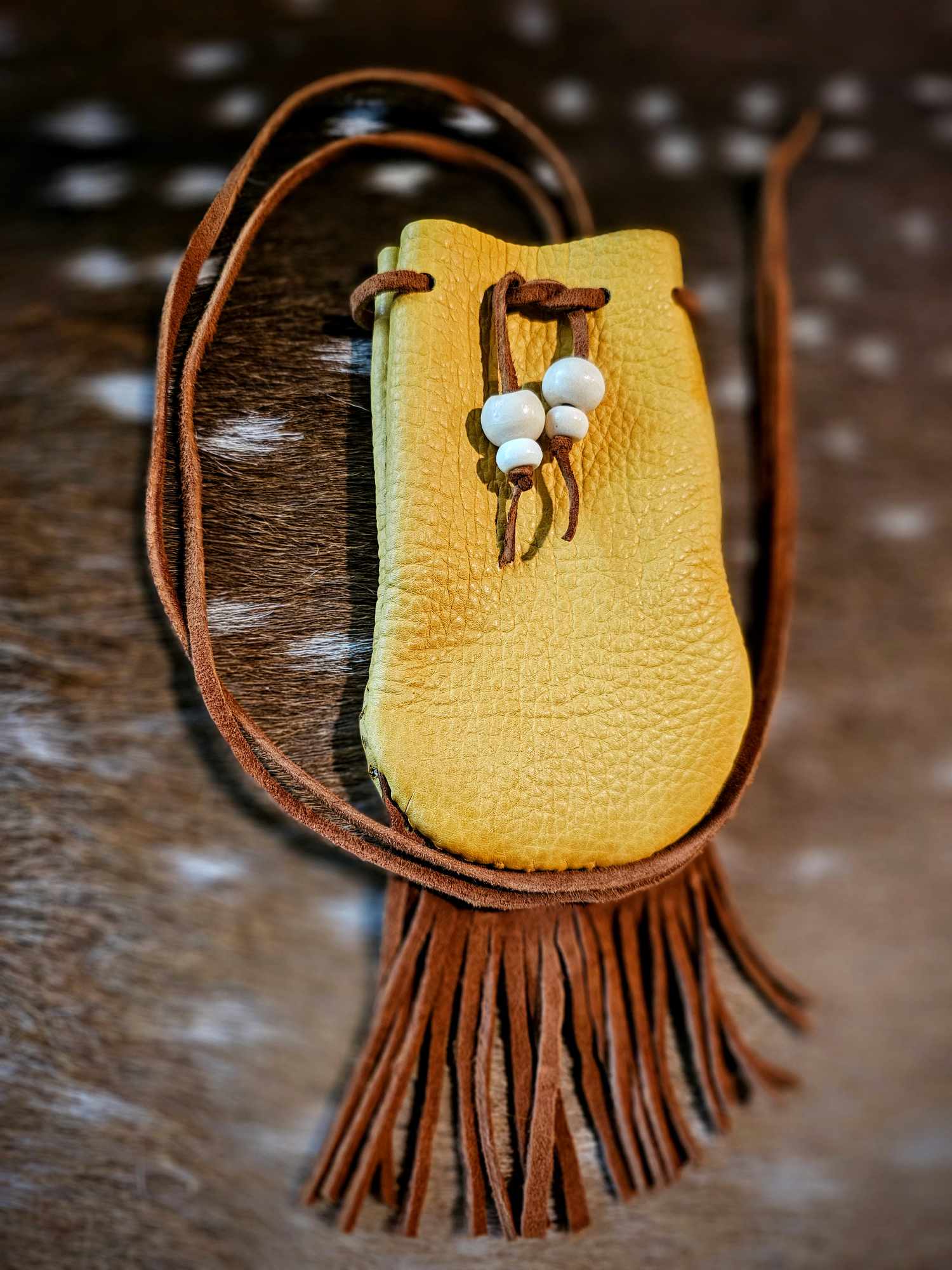 Bison Hide Medicine Bag with Cow Bone Beads and Buckskin Fringe