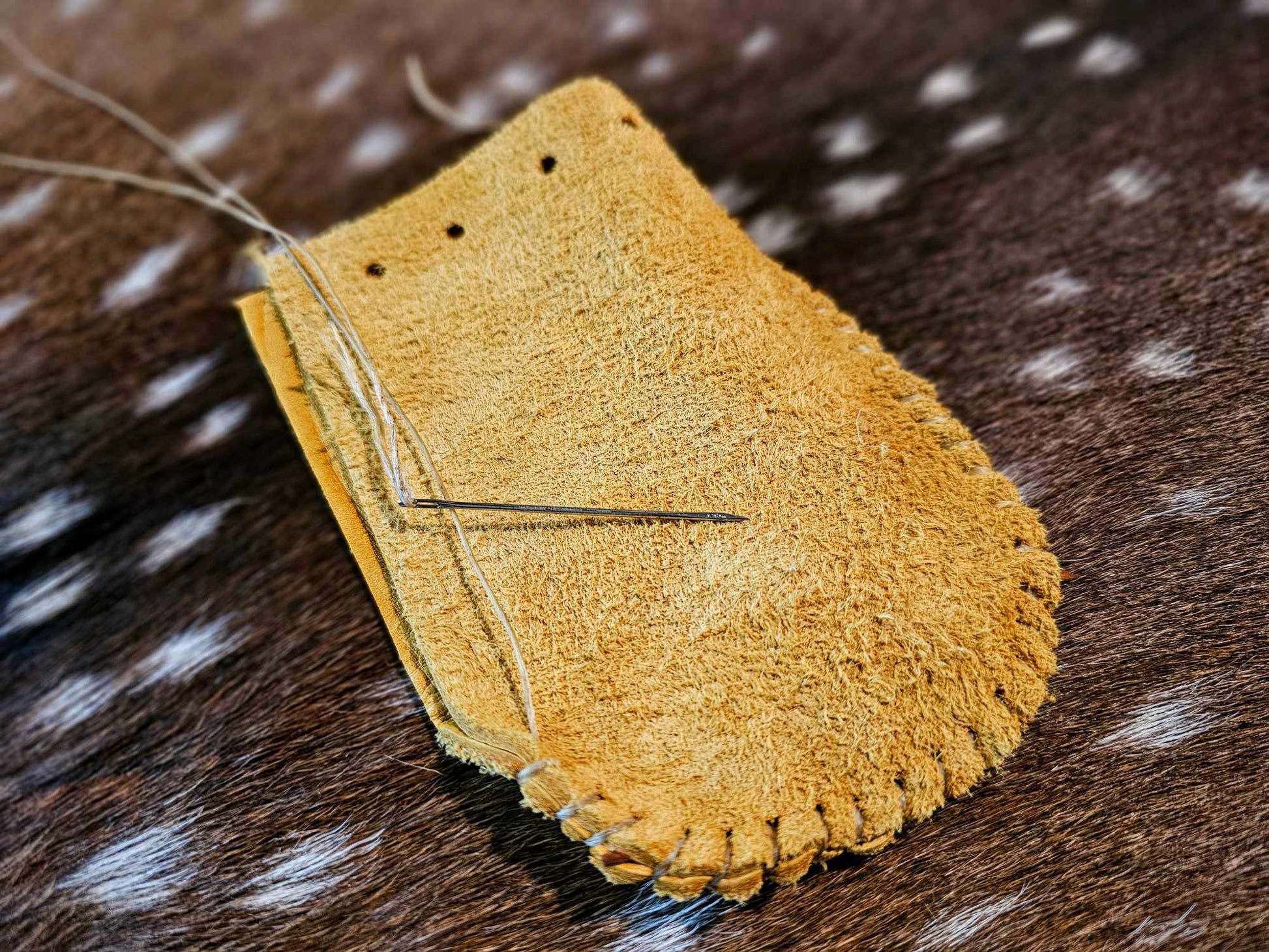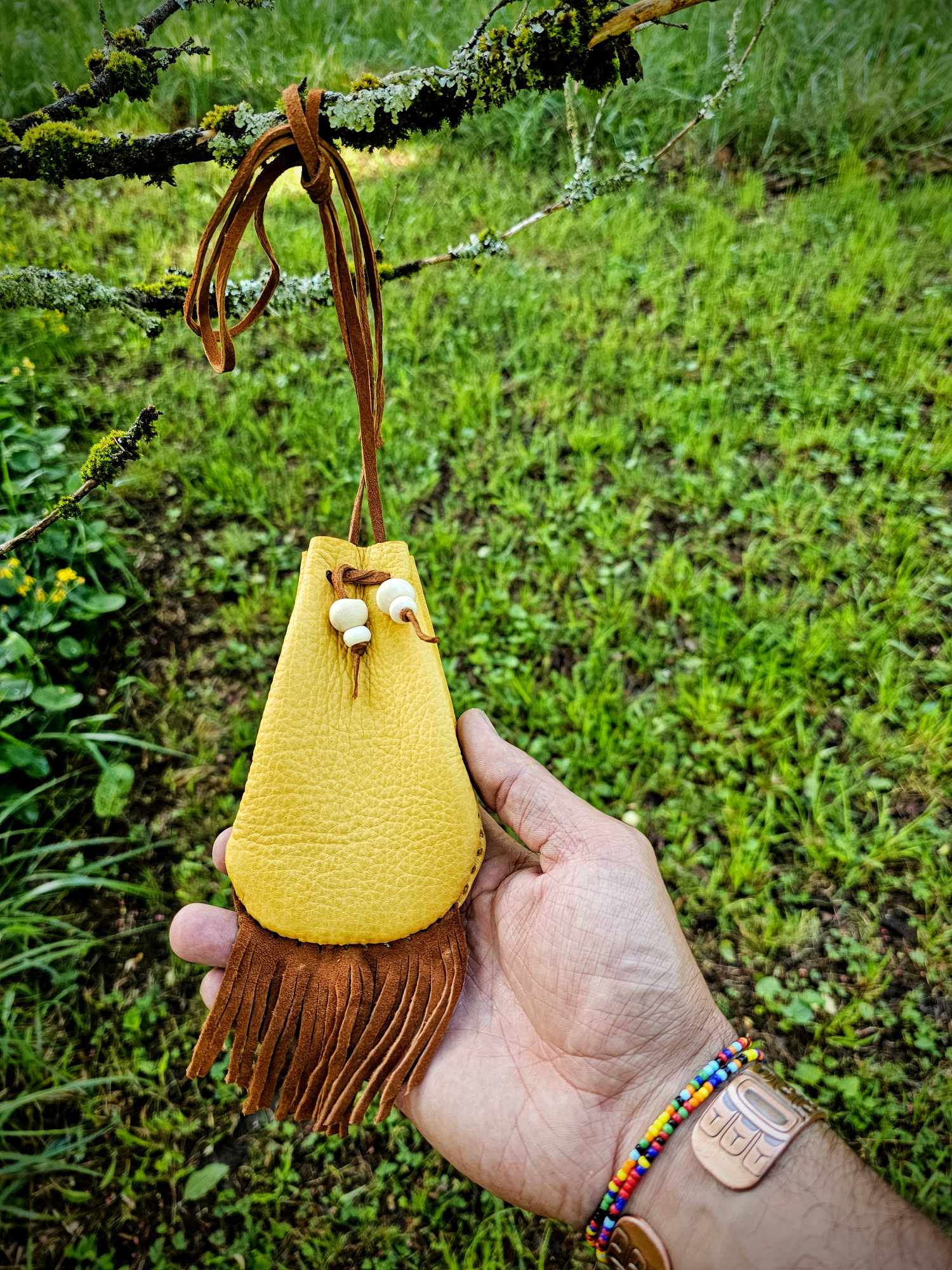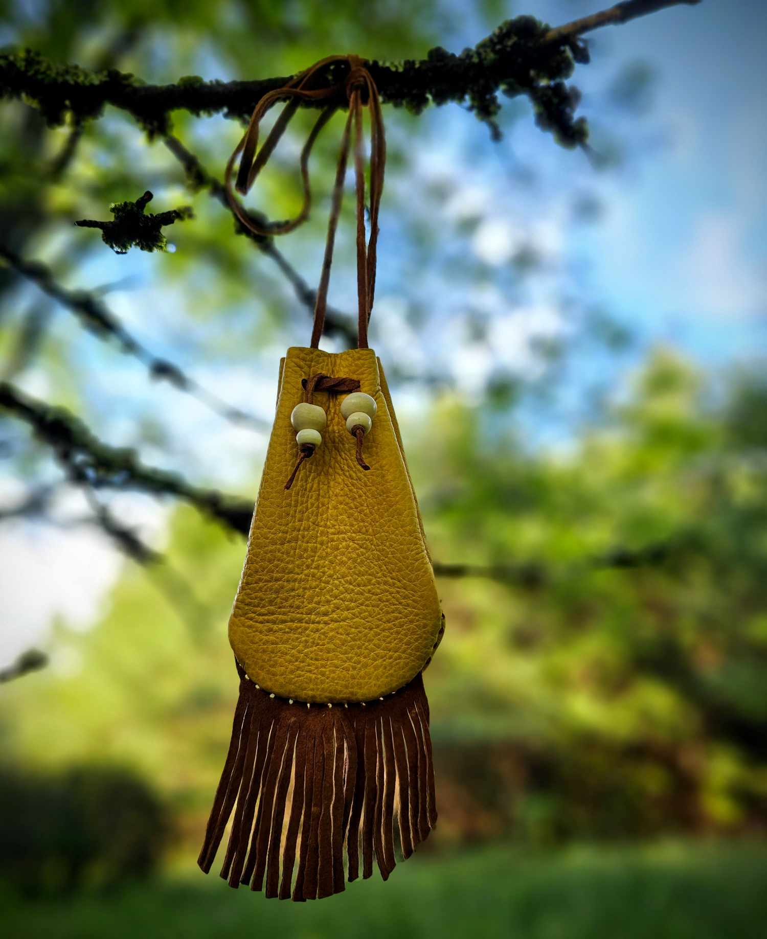 Bison Hide Medicine Bag with Cow Bone Beads and Buckskin Fringe