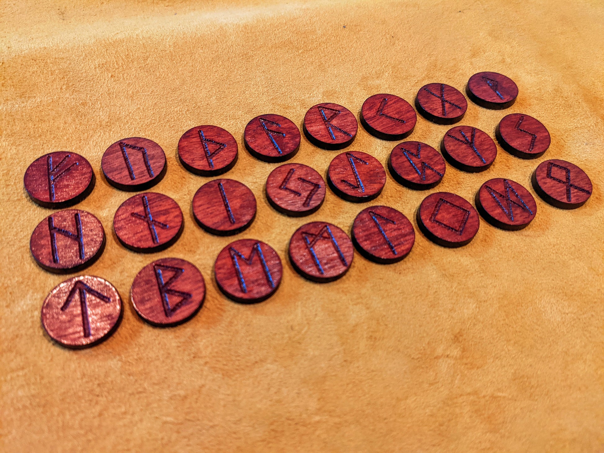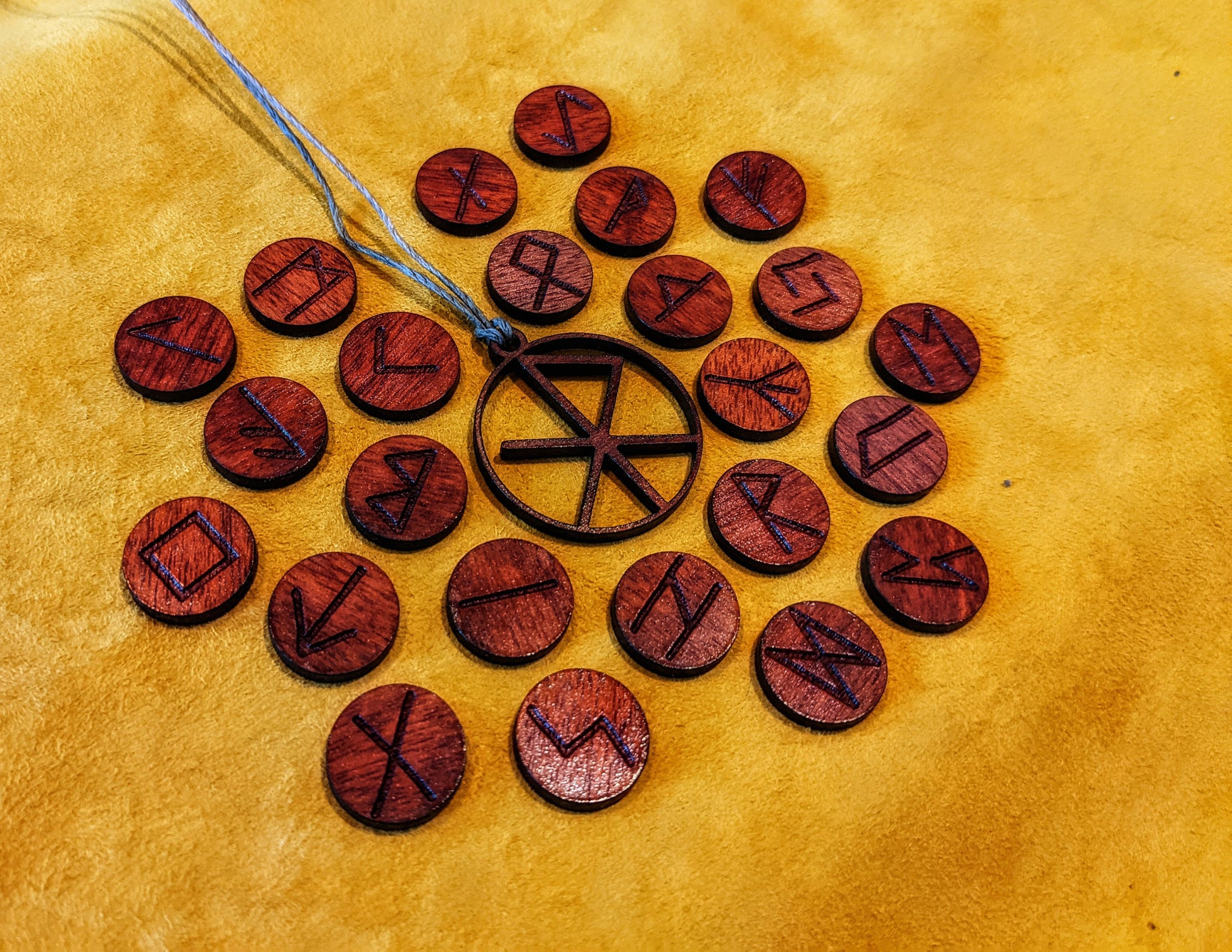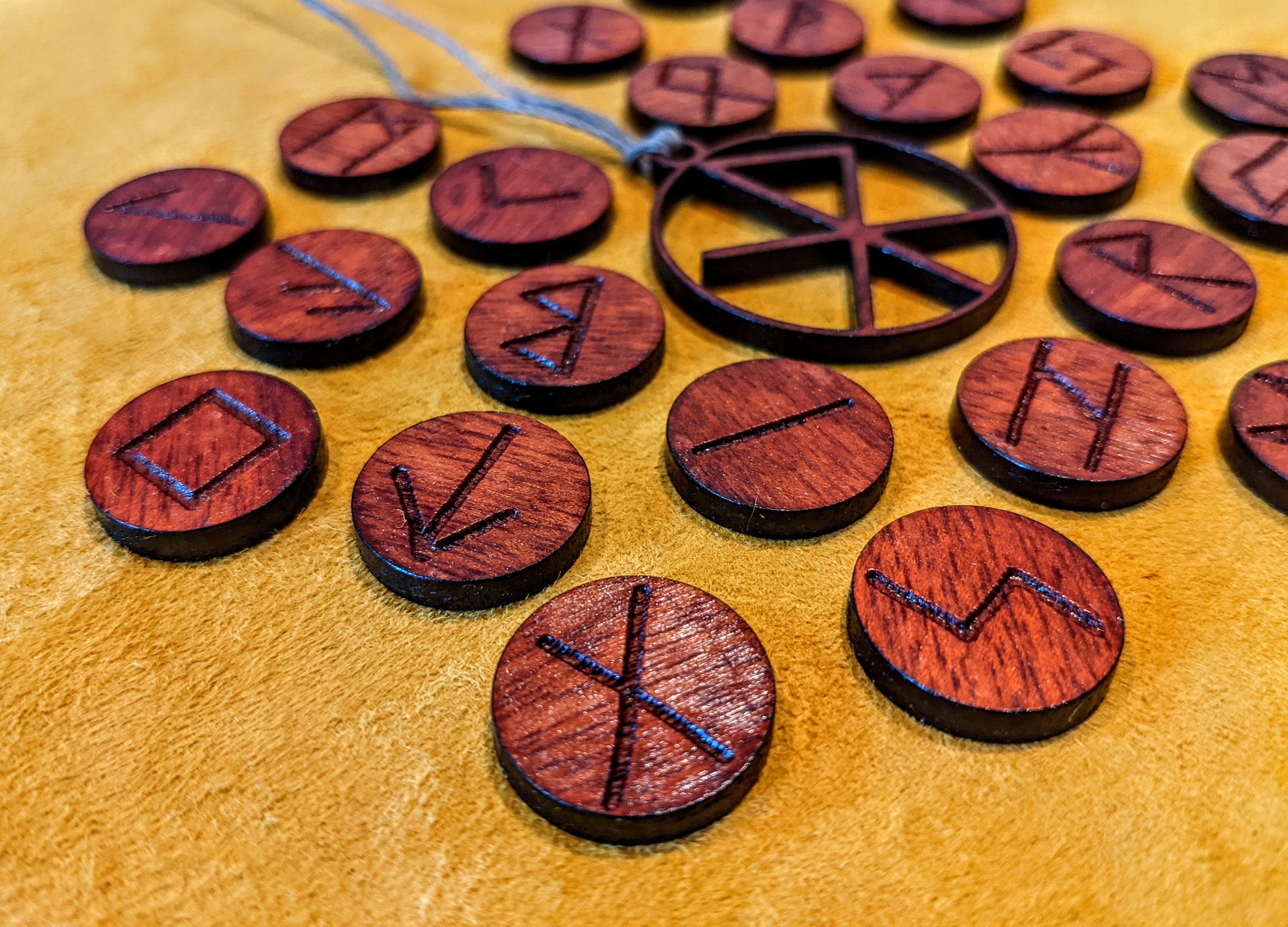 Set of 24 Elder Futhark runes, and a love bindrune pendant that can be worn, hung on your car mirror, at your altar, or used in any way you want. Cut from beautiful naturally red bloodwood - a hardwood twice as hard as oak. Runes are 3/4", pendant is 1.5".