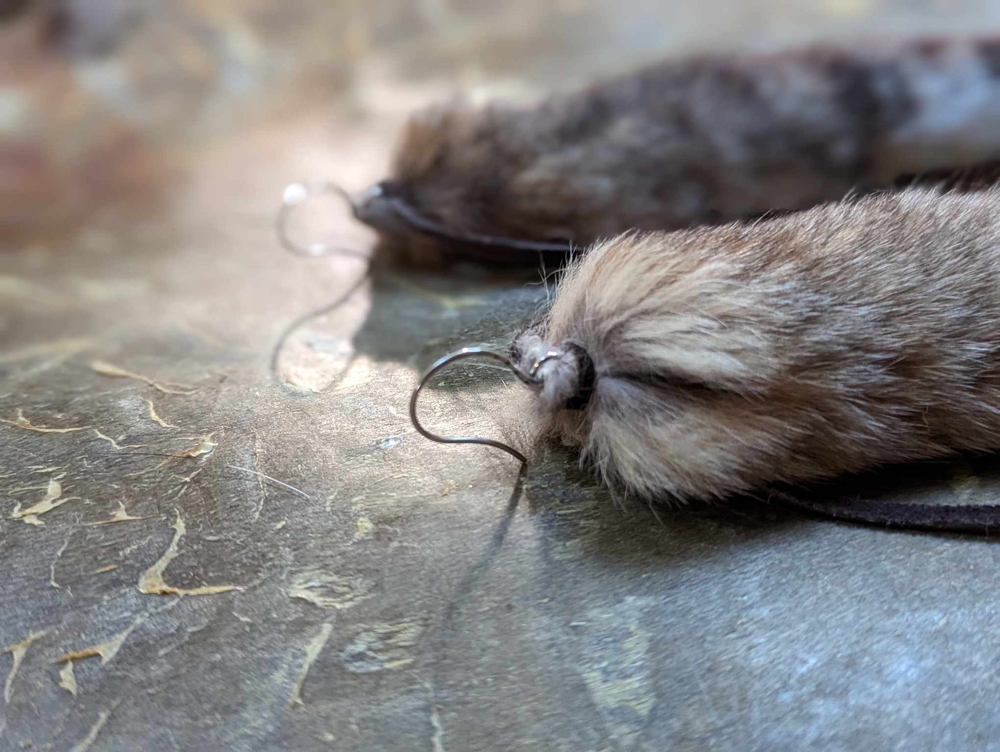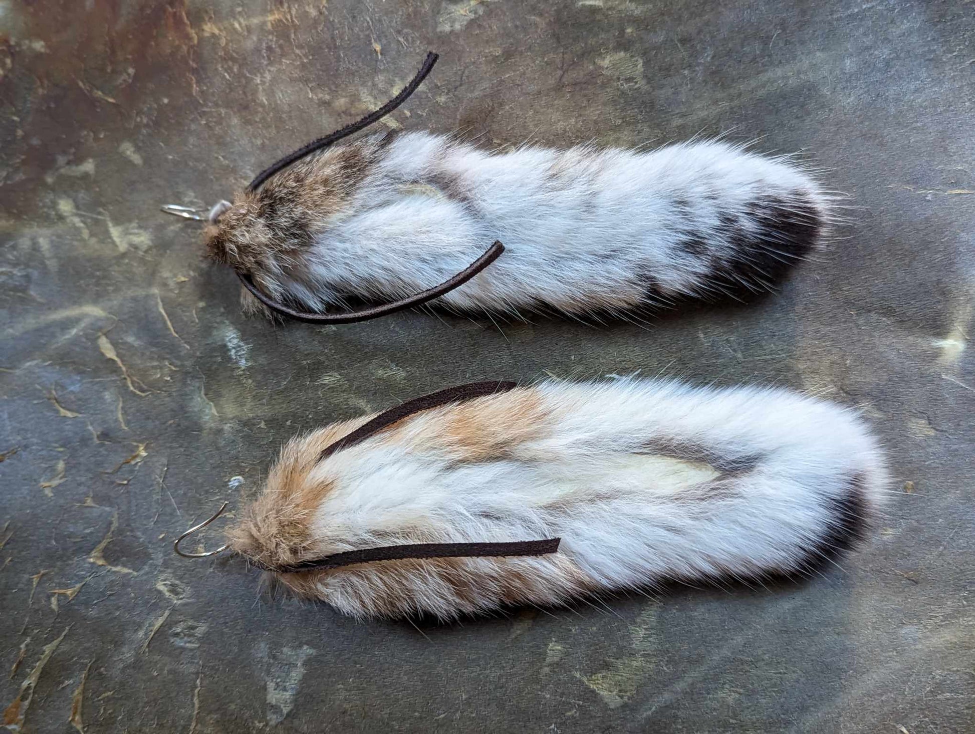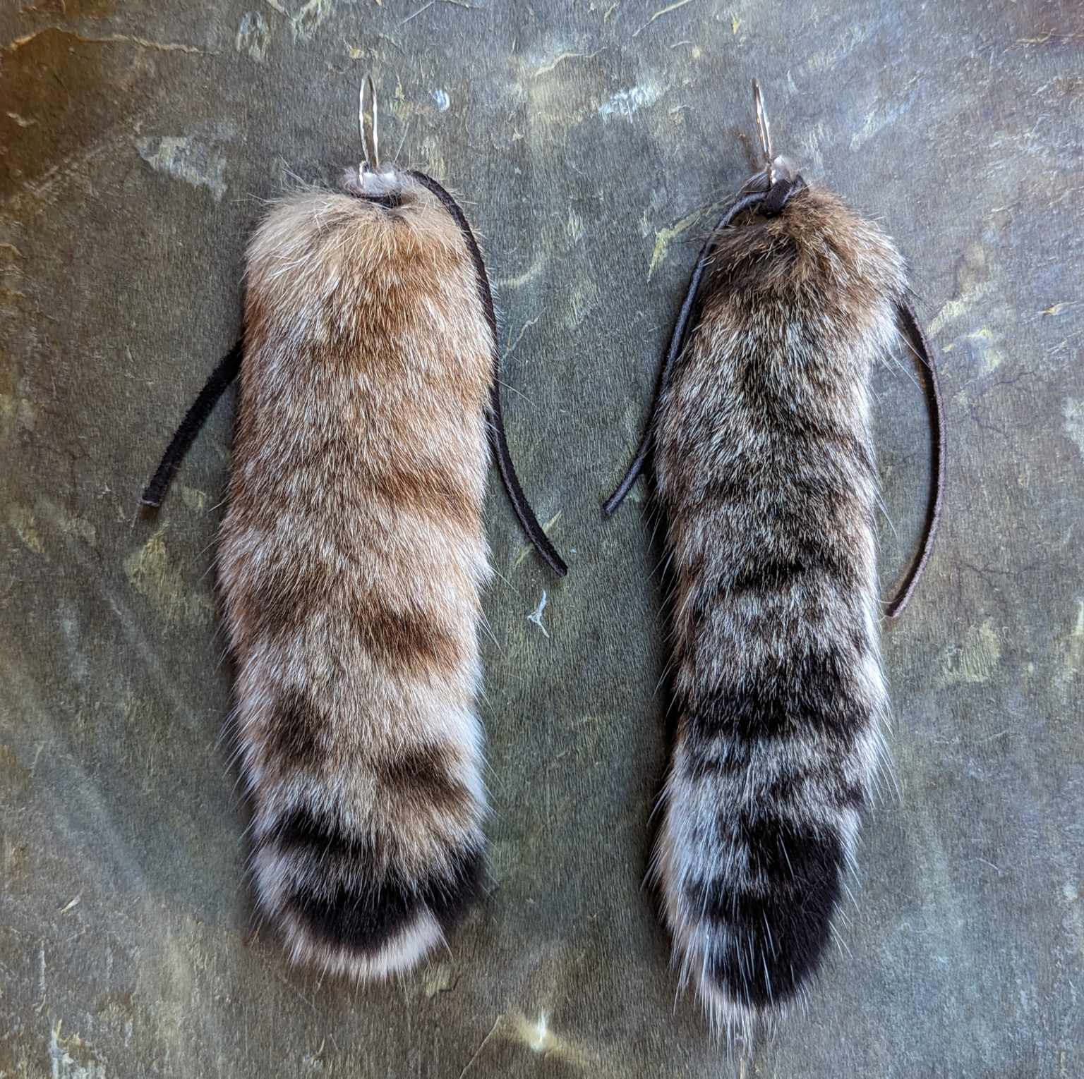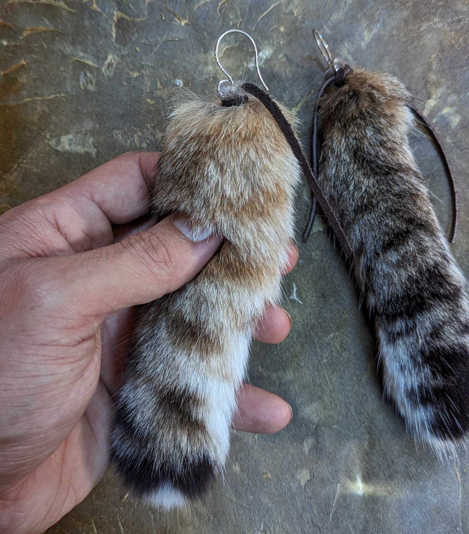Natural Bobcat tail earrings on sterling silver ear wires with a suede tie. Approximately 5 inches long.