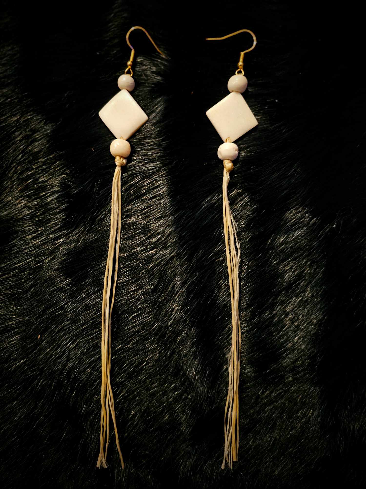 Earrings featuring diamond shaped bone beads, with two round bone beads above and below. Decorated with sinew dangles on gold toned nickel free hardware. Lightweight and versatile.