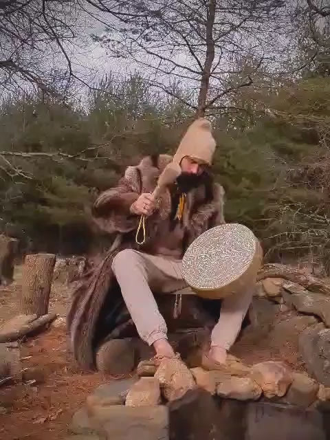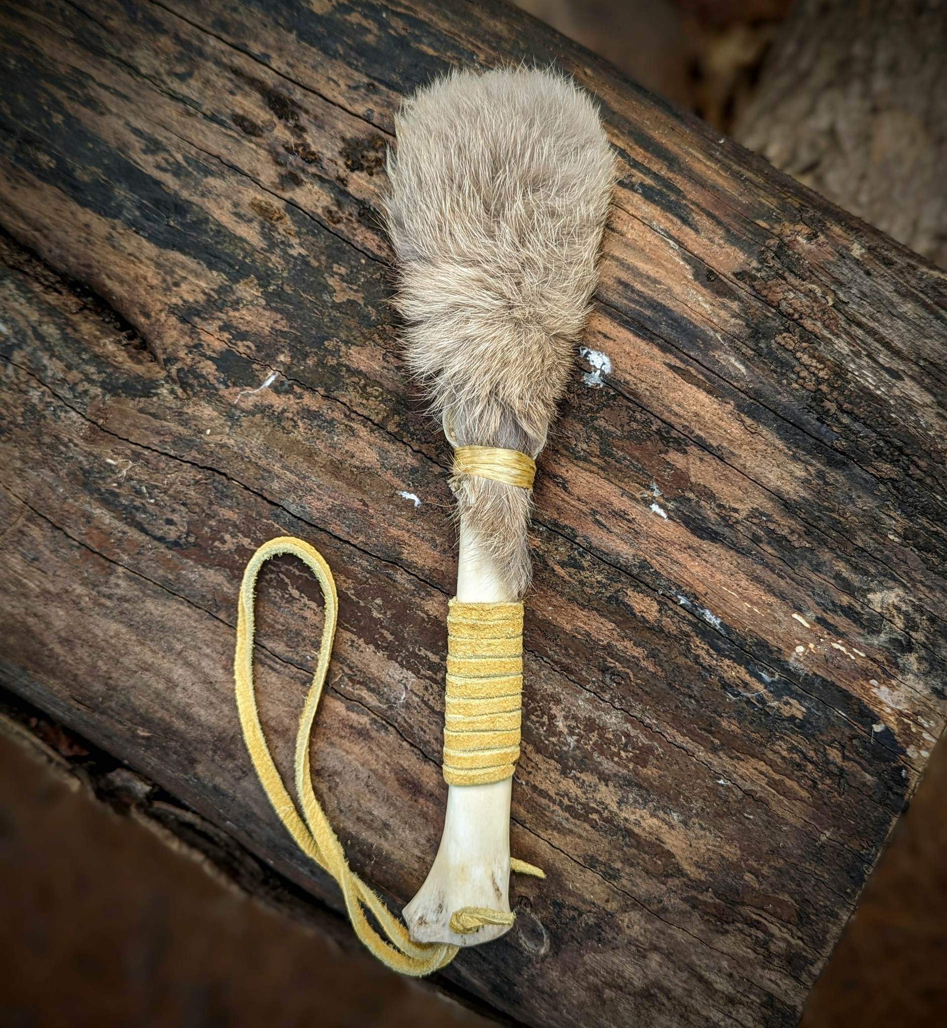 Dual use drum beater and rattle. Made with a deer bone handle and rawhide sewn with sinew. Rabbit fur on one side of head. Finished with elk leather cord wrap and loop.