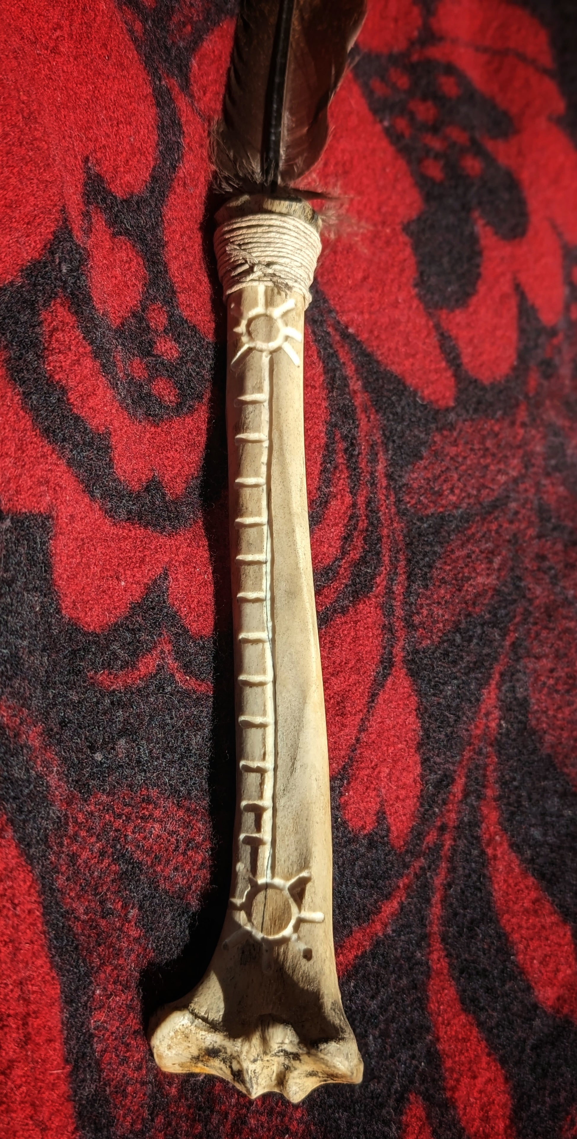 Hollow deer bone rattle (glass bead filled) with large turkey feather, both sourced right here in the Blue Ridge Mountains of Appalachia. Total length about 30".
