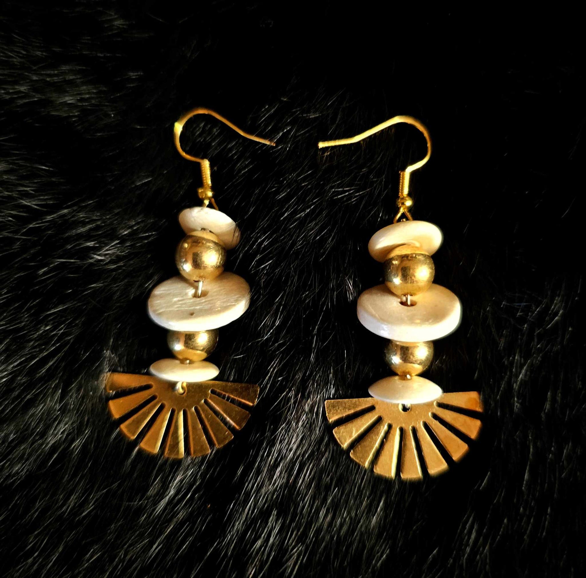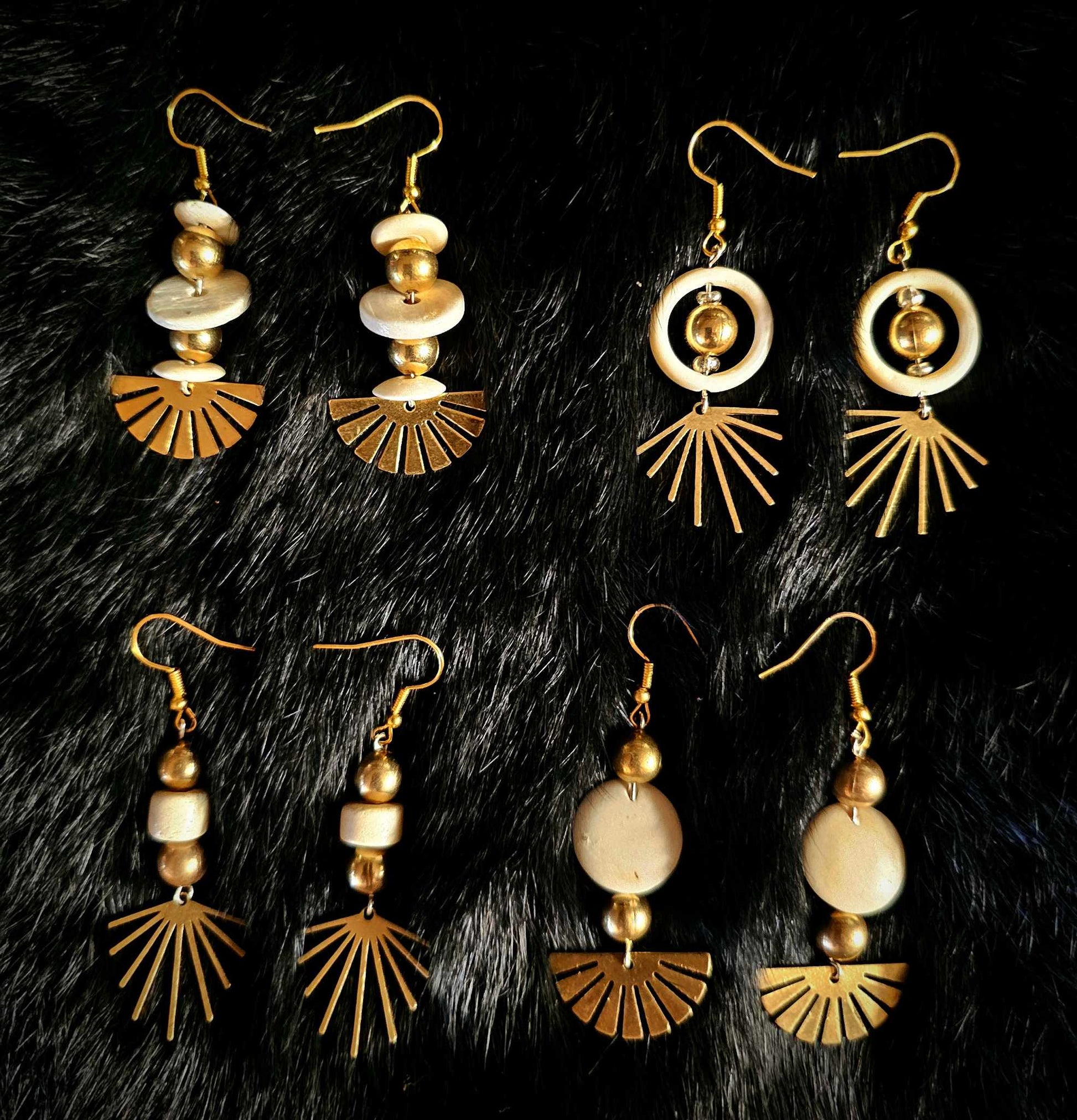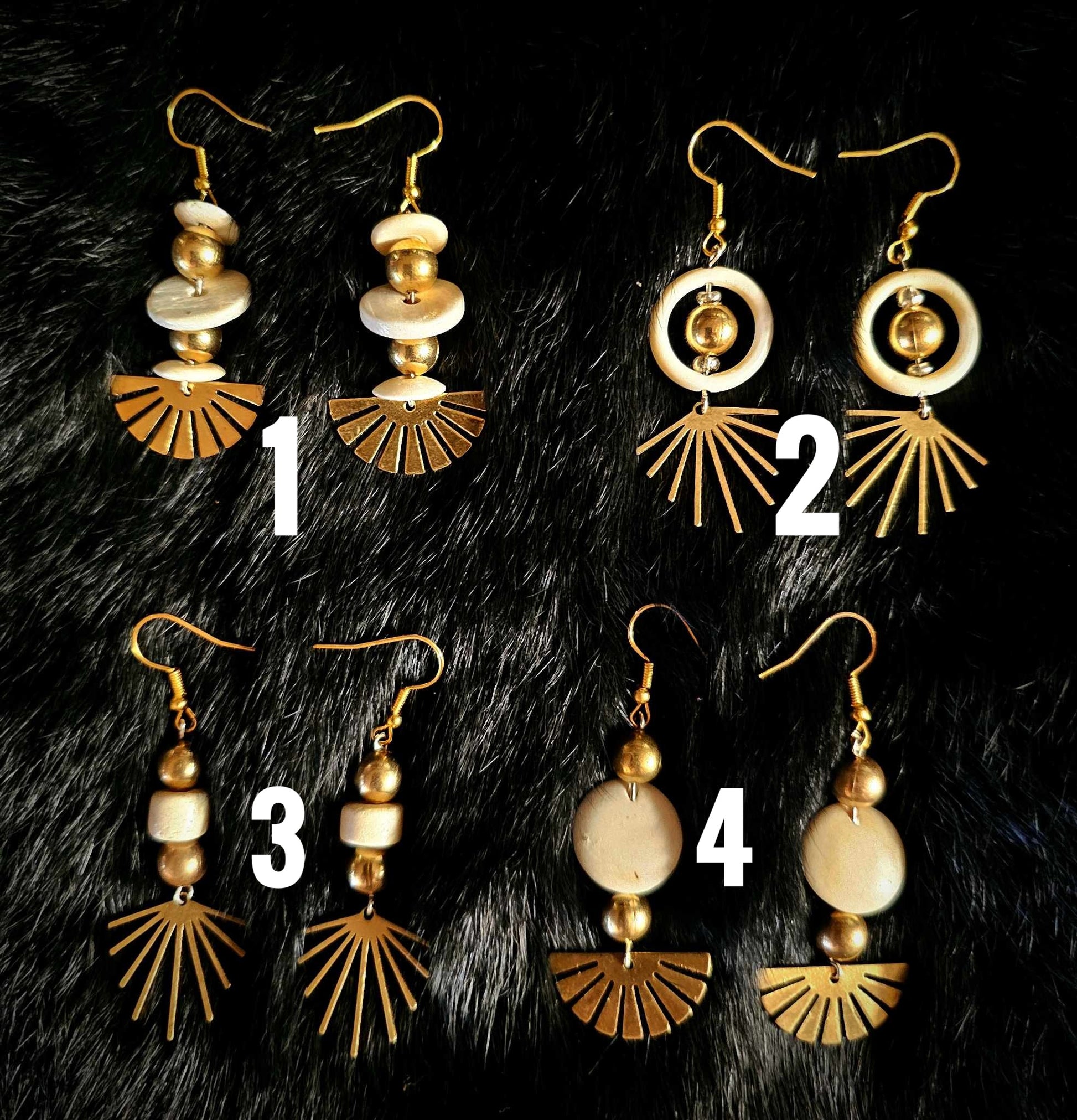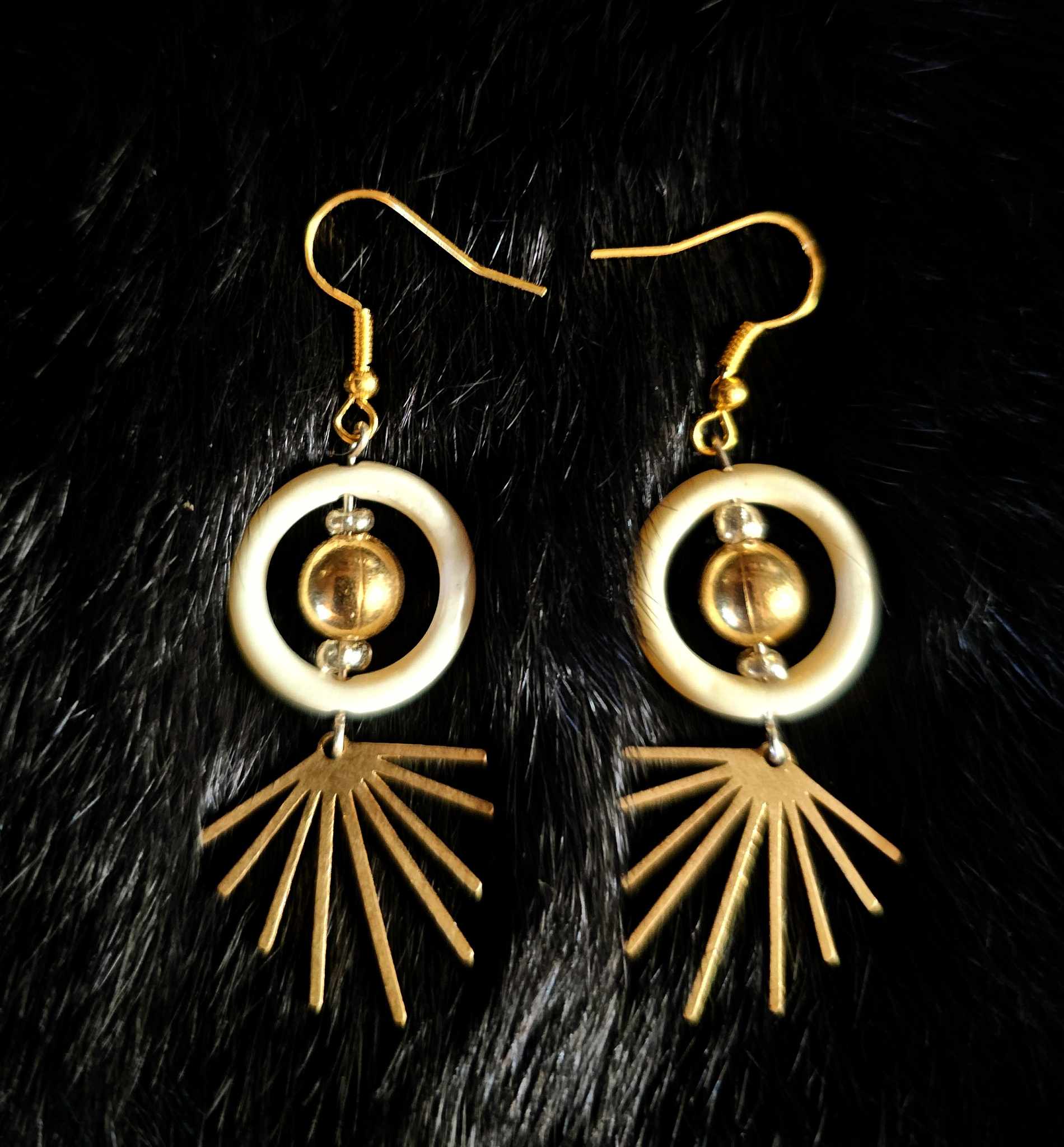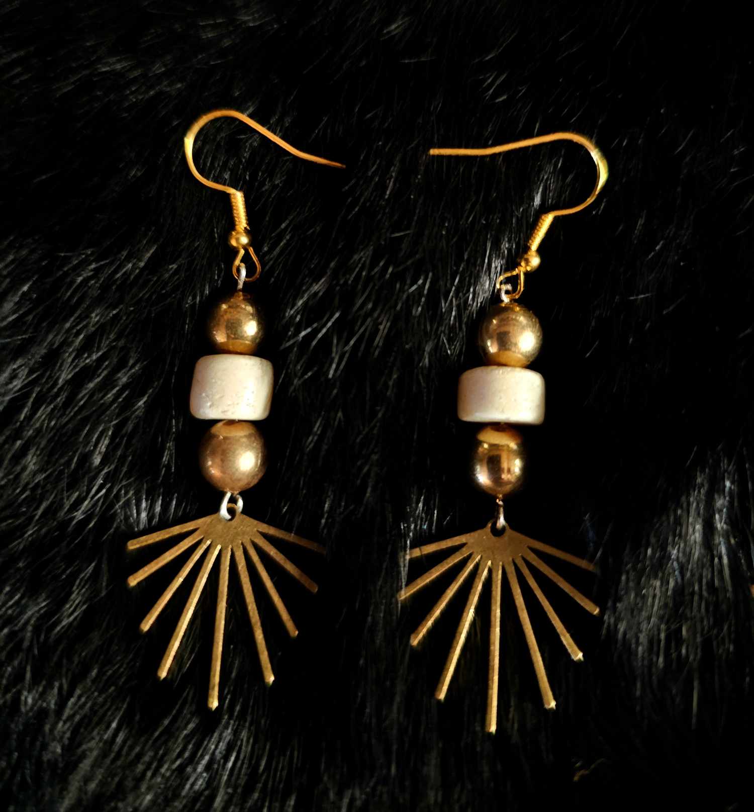 Handmade bison bone, brass bead, and metal earrings. Made in honor of the rising sun, Mihu in proto-Siouan.