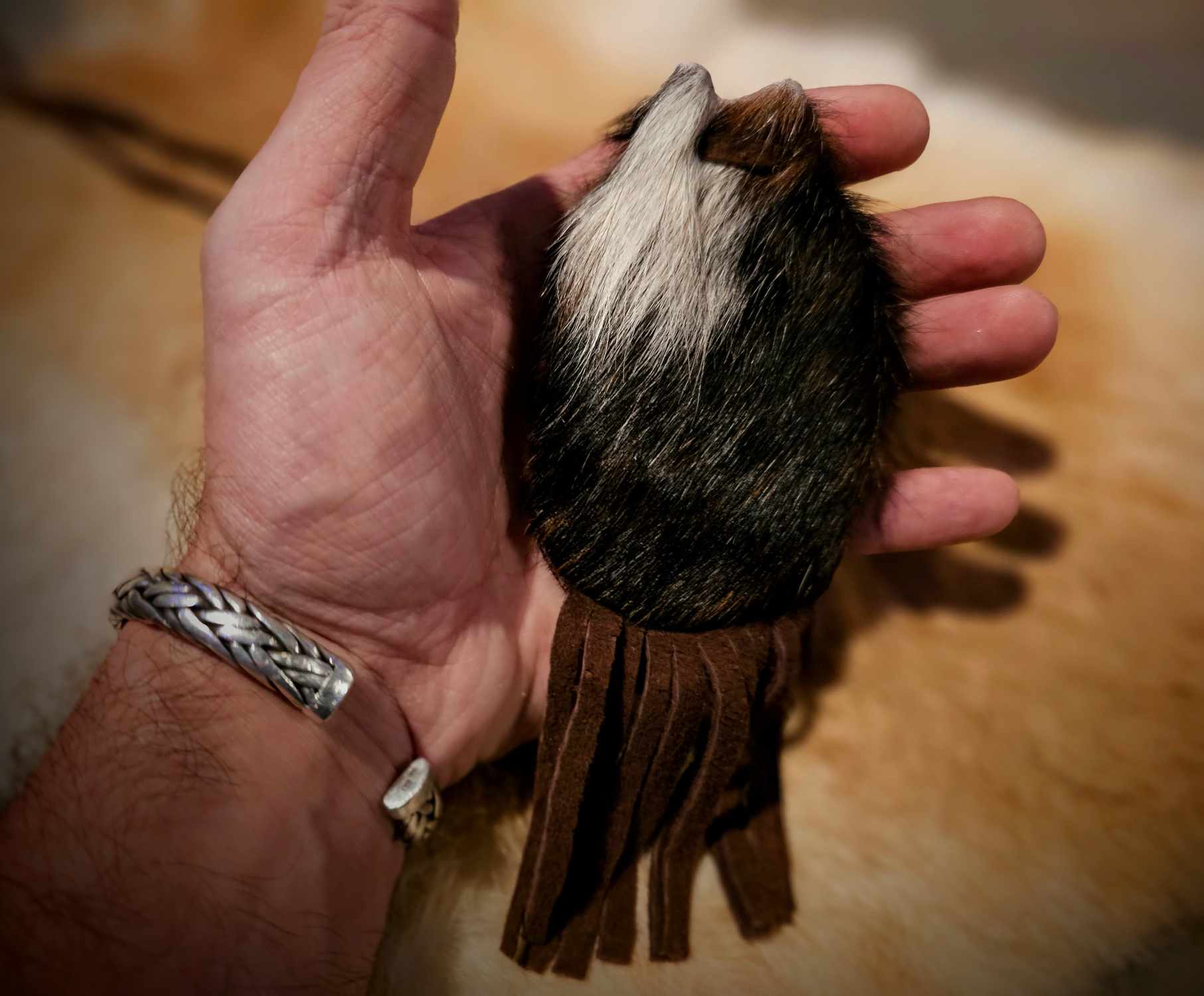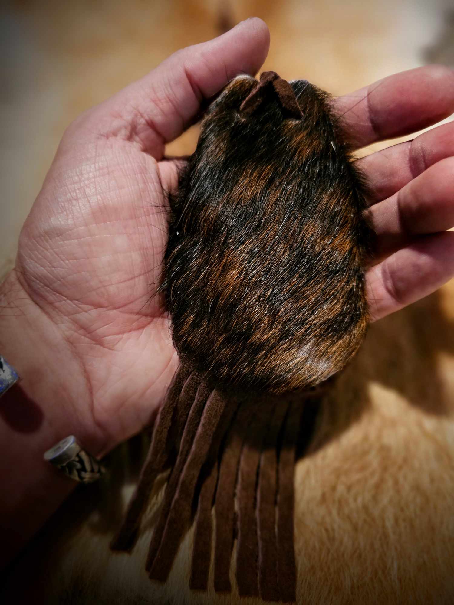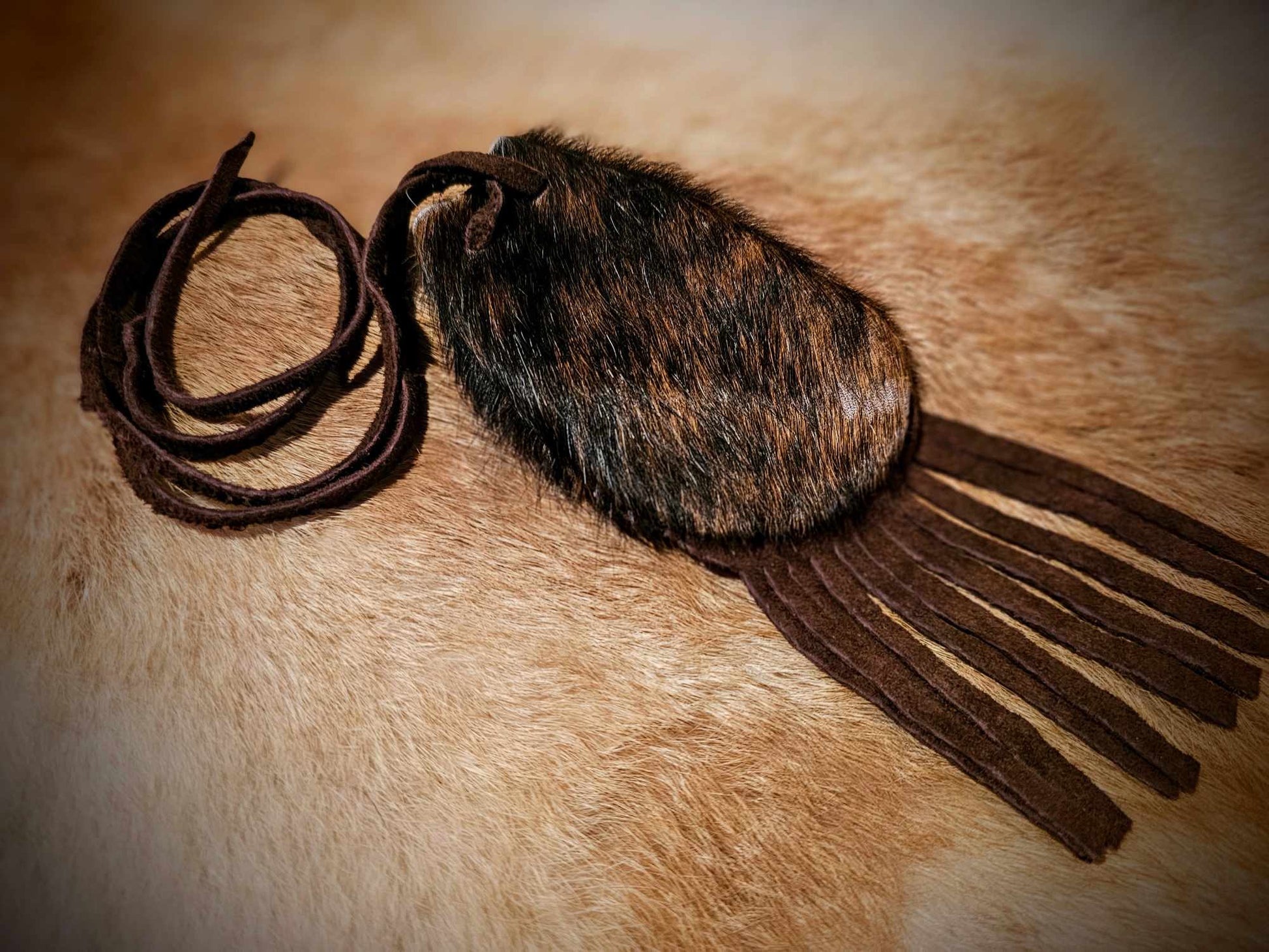 Drawstring wearable medicine bag, handmade from brindle cowhide. Use as a rune pouch also, or for other important small objects.