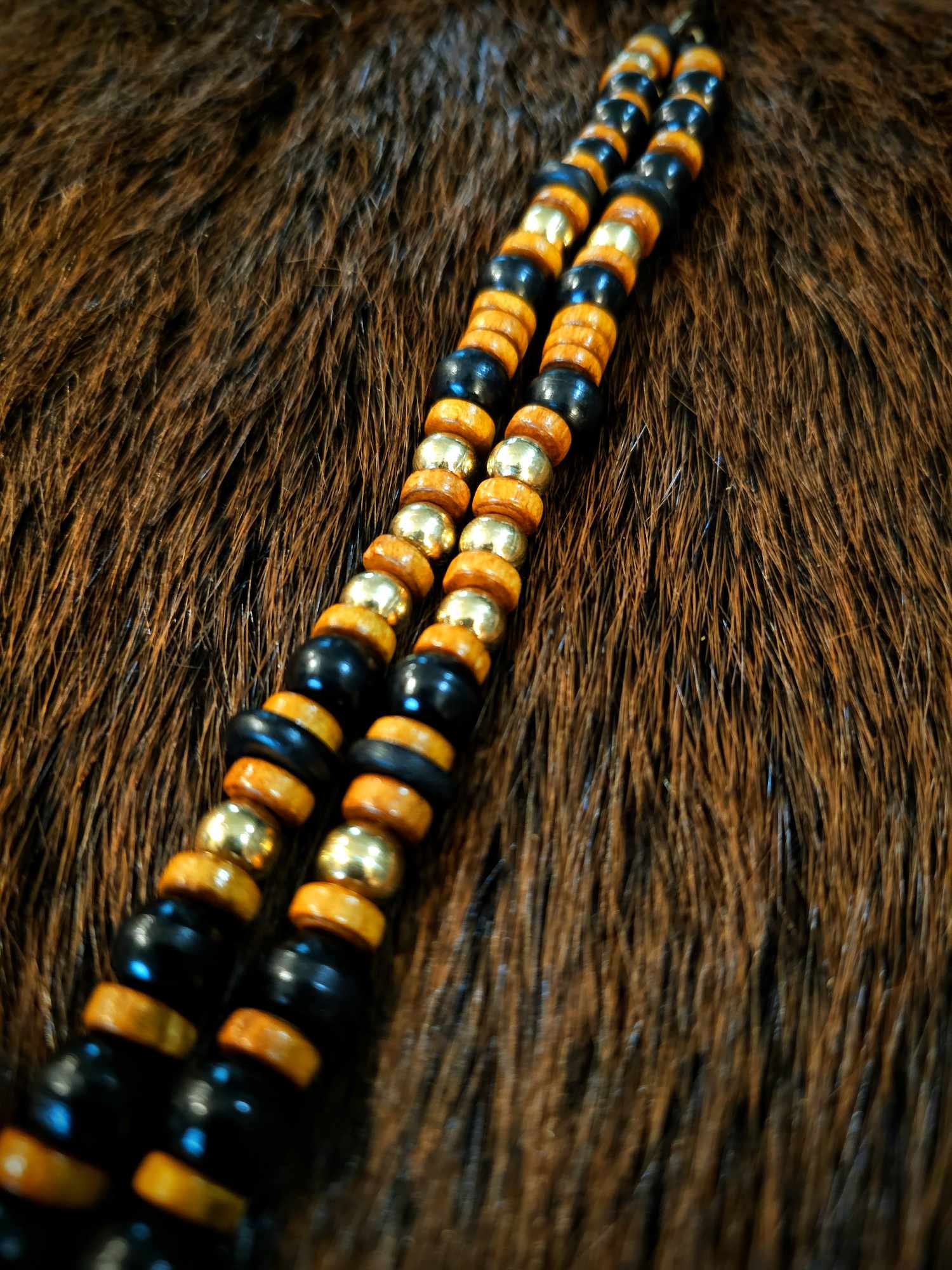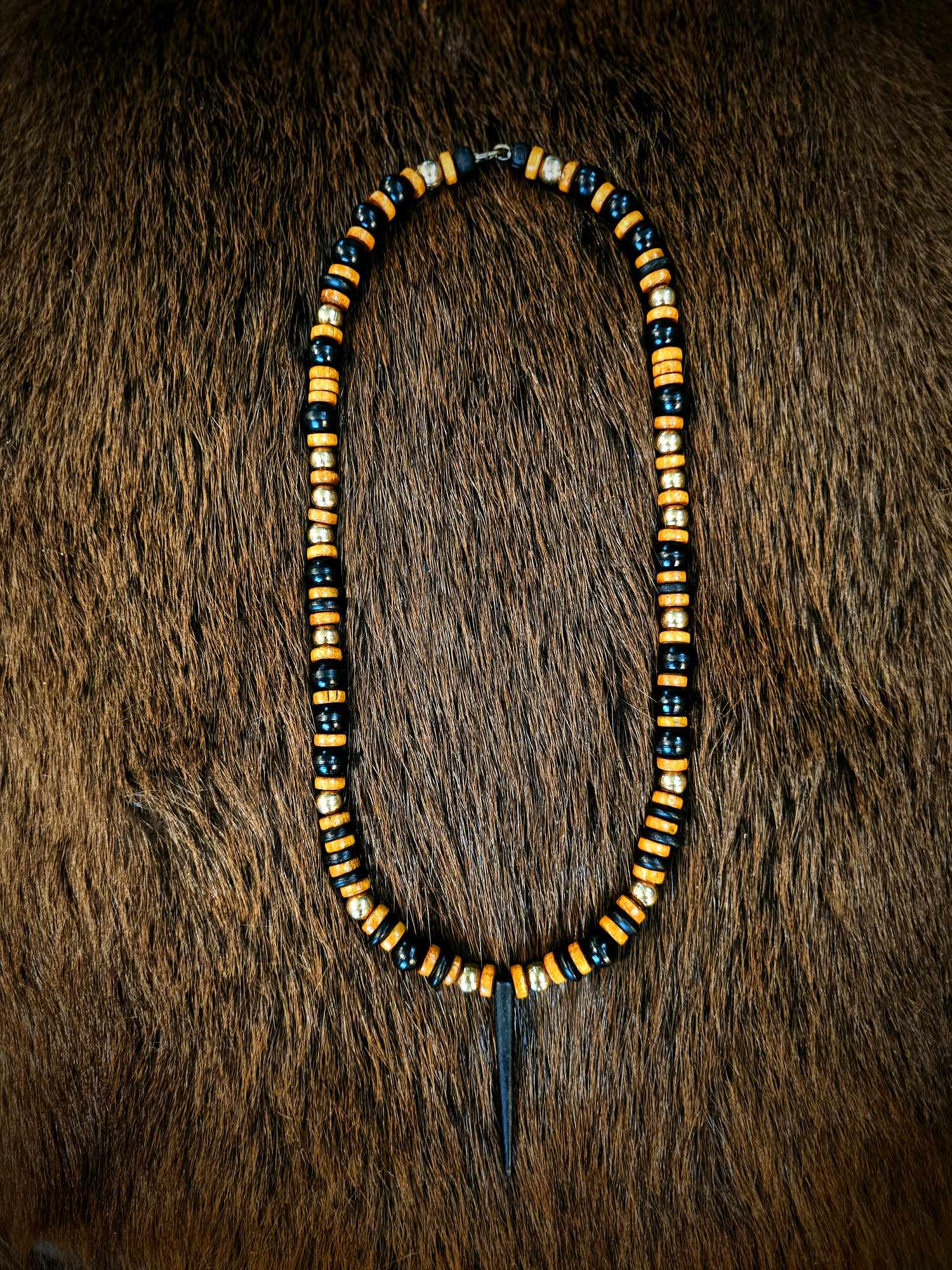 Handmade buffalo horn spike necklace, made of buffalo horn beads, brass beads, and wood beads. 23" length. Lobster claw closure.