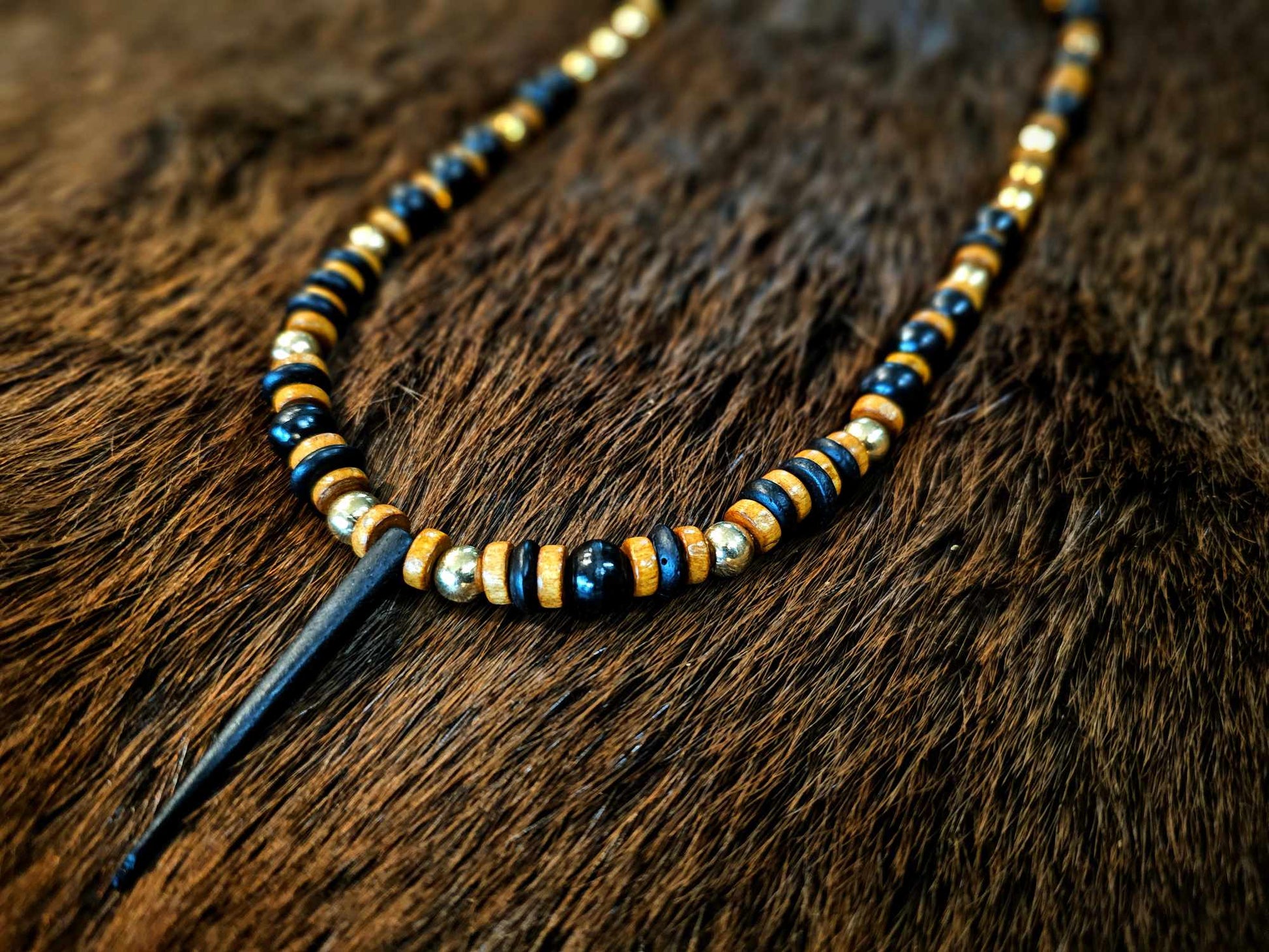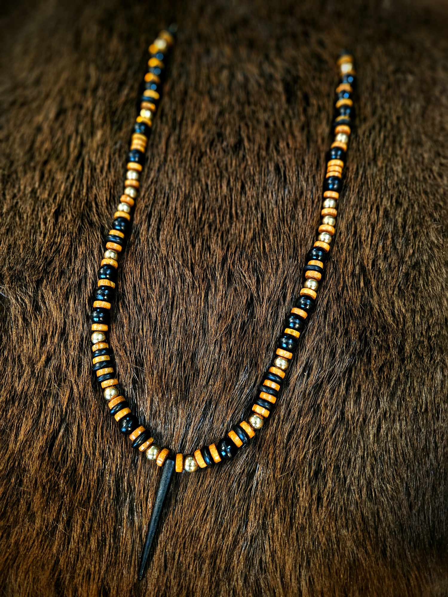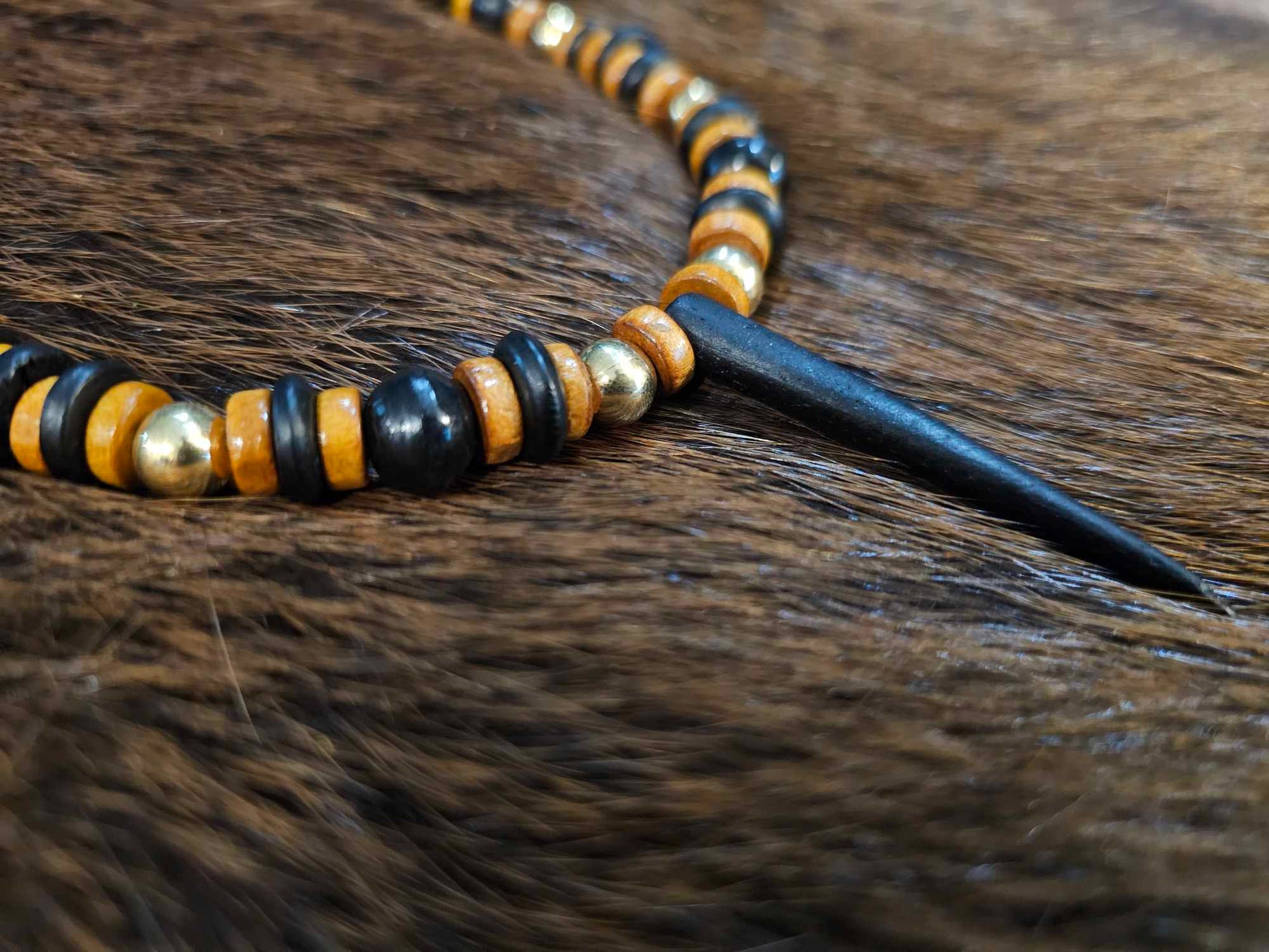 Buffalo Horn Spike Necklace With Brass And Wood Beads