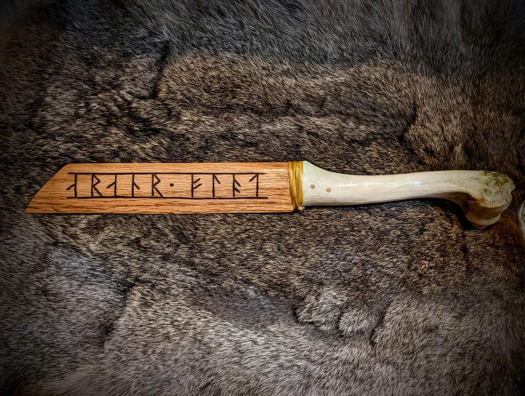 Ceremonial blot seax for gifting or commemoration made from hand carved oak wood and deer bone. Sinew wrapped between bone and wood. Younger Futhark short branch runes are hand burned, saying in Old Norse "season sacrifice".