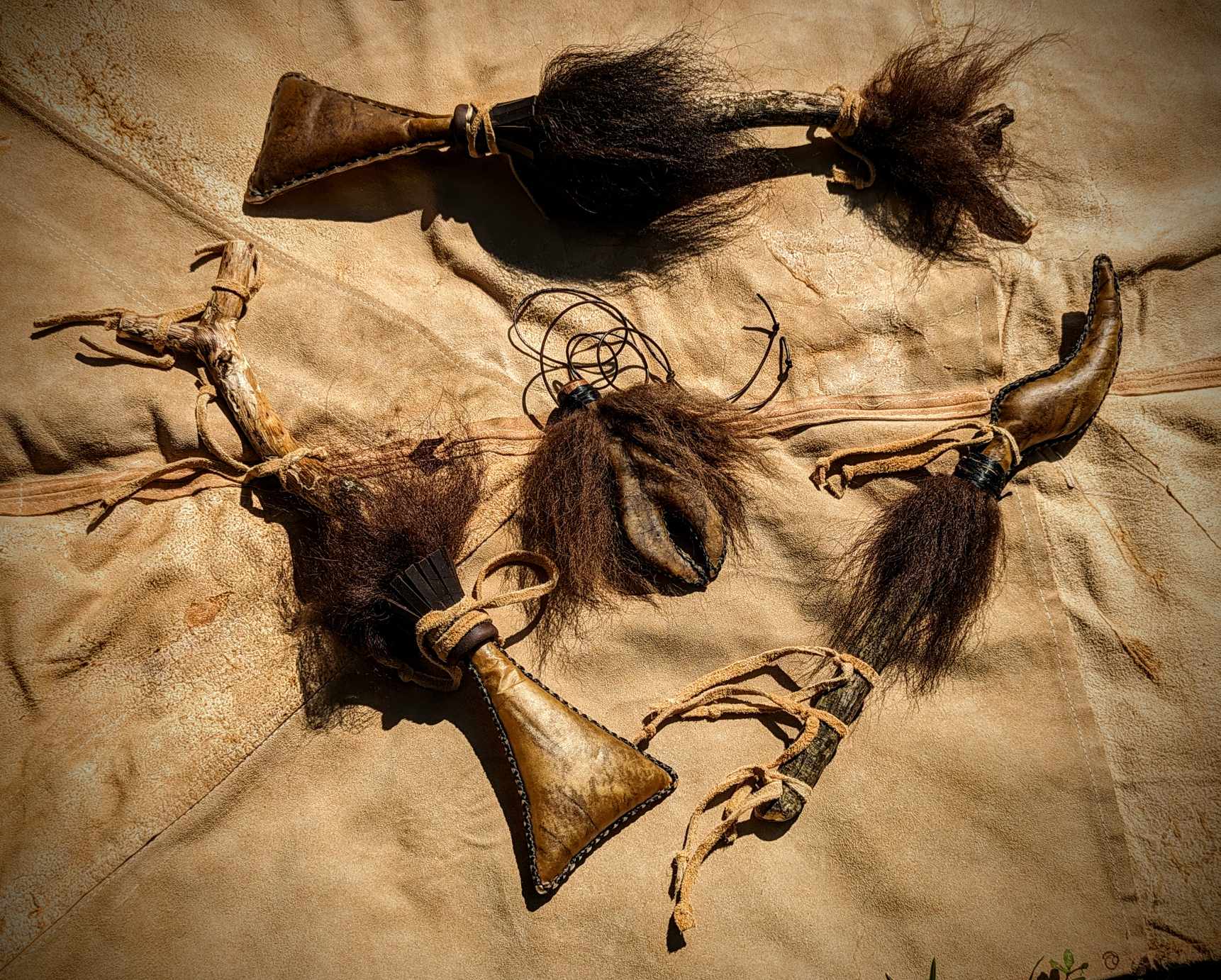 Bison Spirit Ceremonial rattles, Medicine rattle, and necklace style. Paddle, Horn, and Hoof shaped rattle heads crafted from Bison skin and filled with Buckwheat, Bison hair skirts on Apple, Chestnut, and Locust woods.