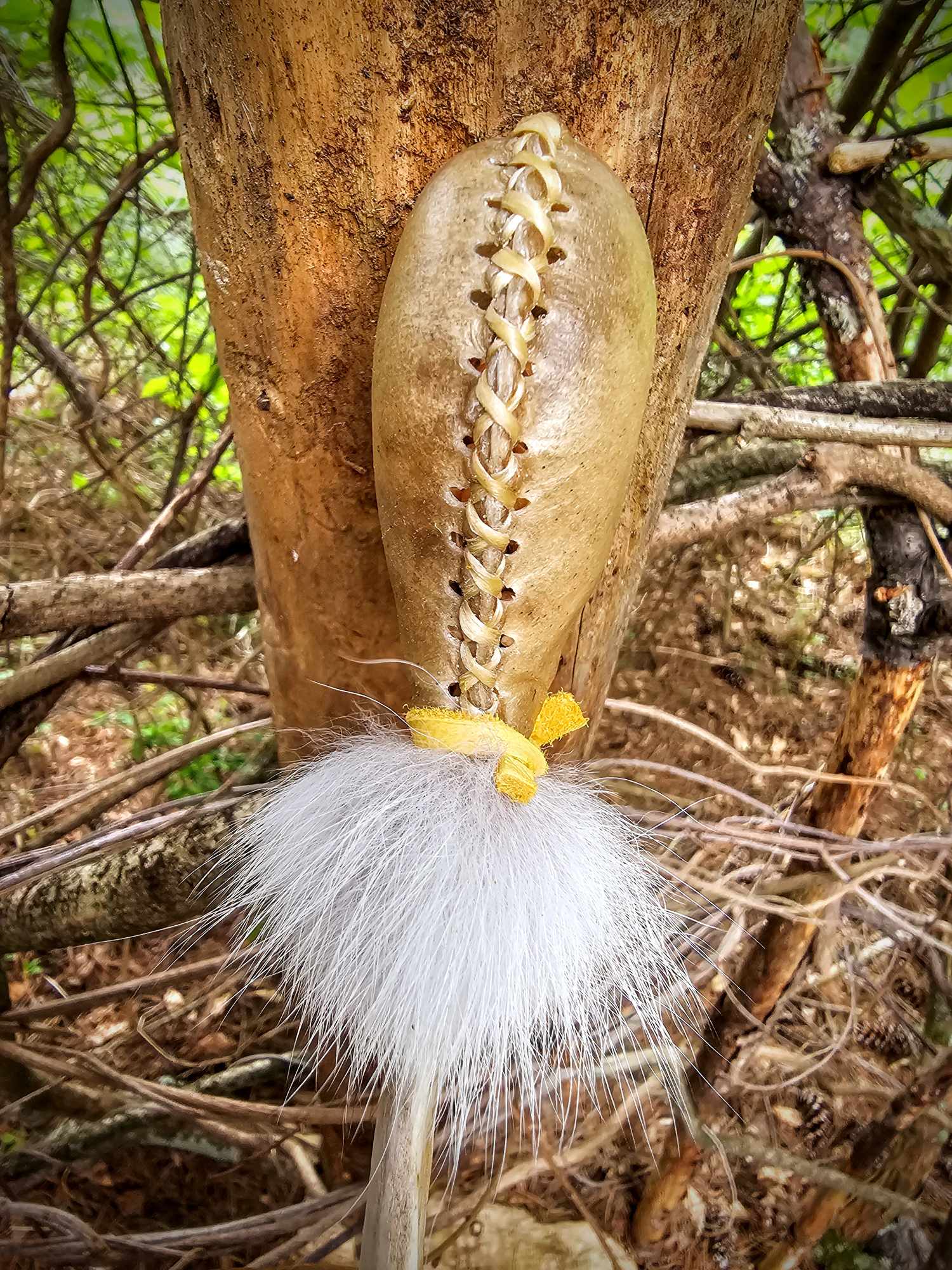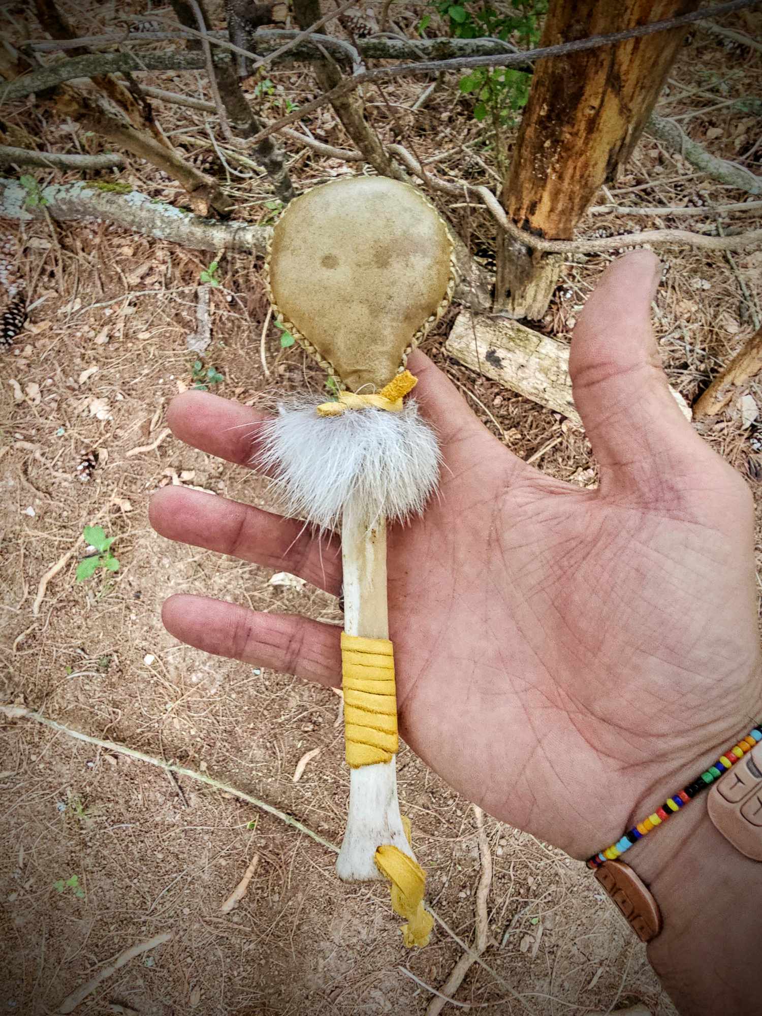 Coyote leg bone and fur handle, deer rawhide head, buckskin cord wrap, buckwheat filled.