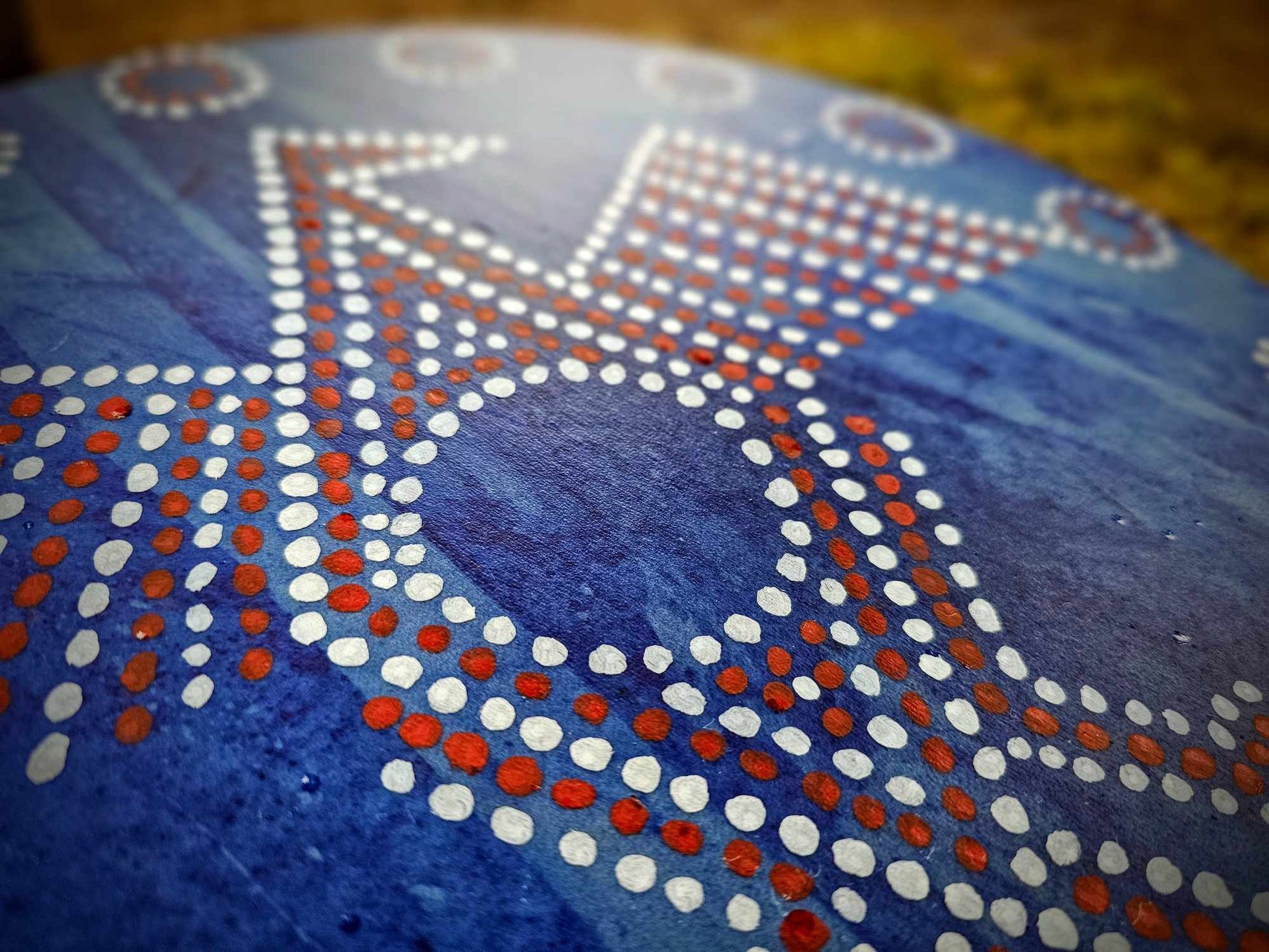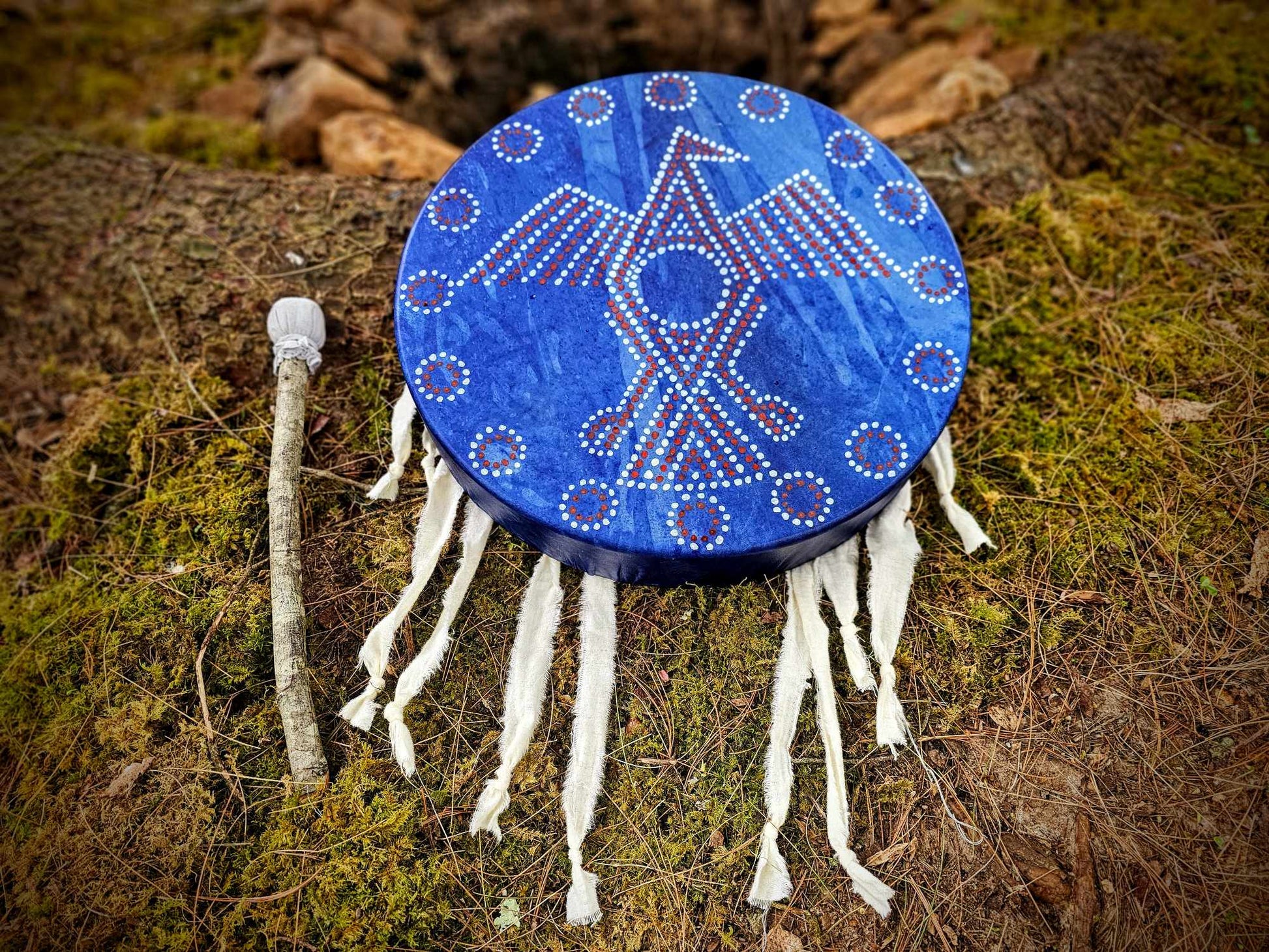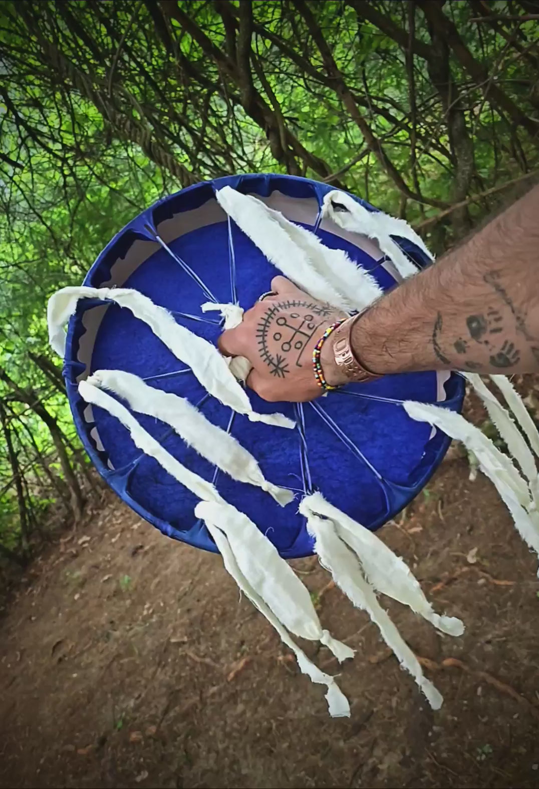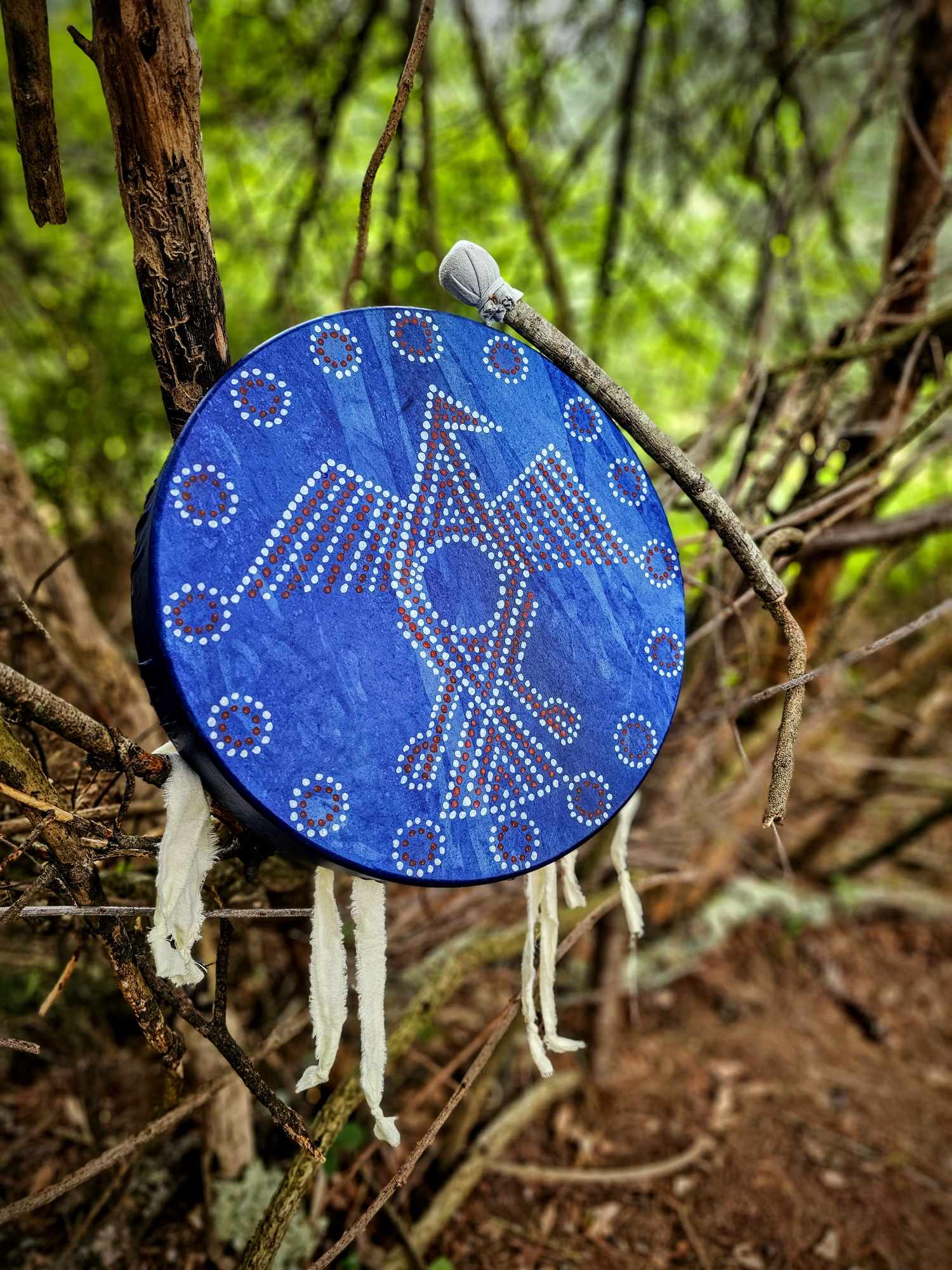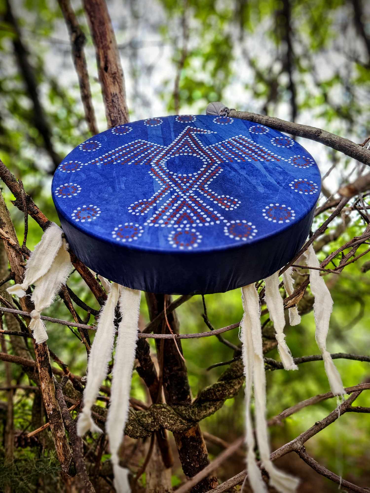 14 inch deer hide drum, dyed blue. White knotted cloth ties around back allow the drum to be played by turning it in the hand using the knotted ends against the surface. It also includes a buckskin head beater. Dotwork hand painted thunderbird art.