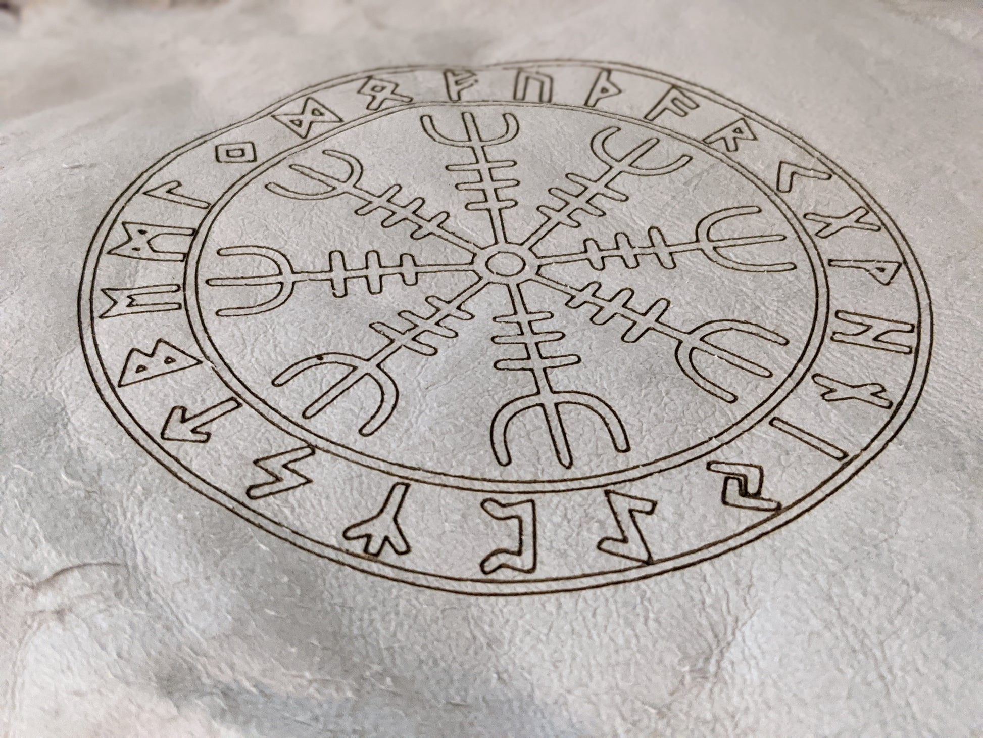 Tanned rabbit hide altar or rune casting cloth, burned with the Helm of Awe and Elder Futhark runes.