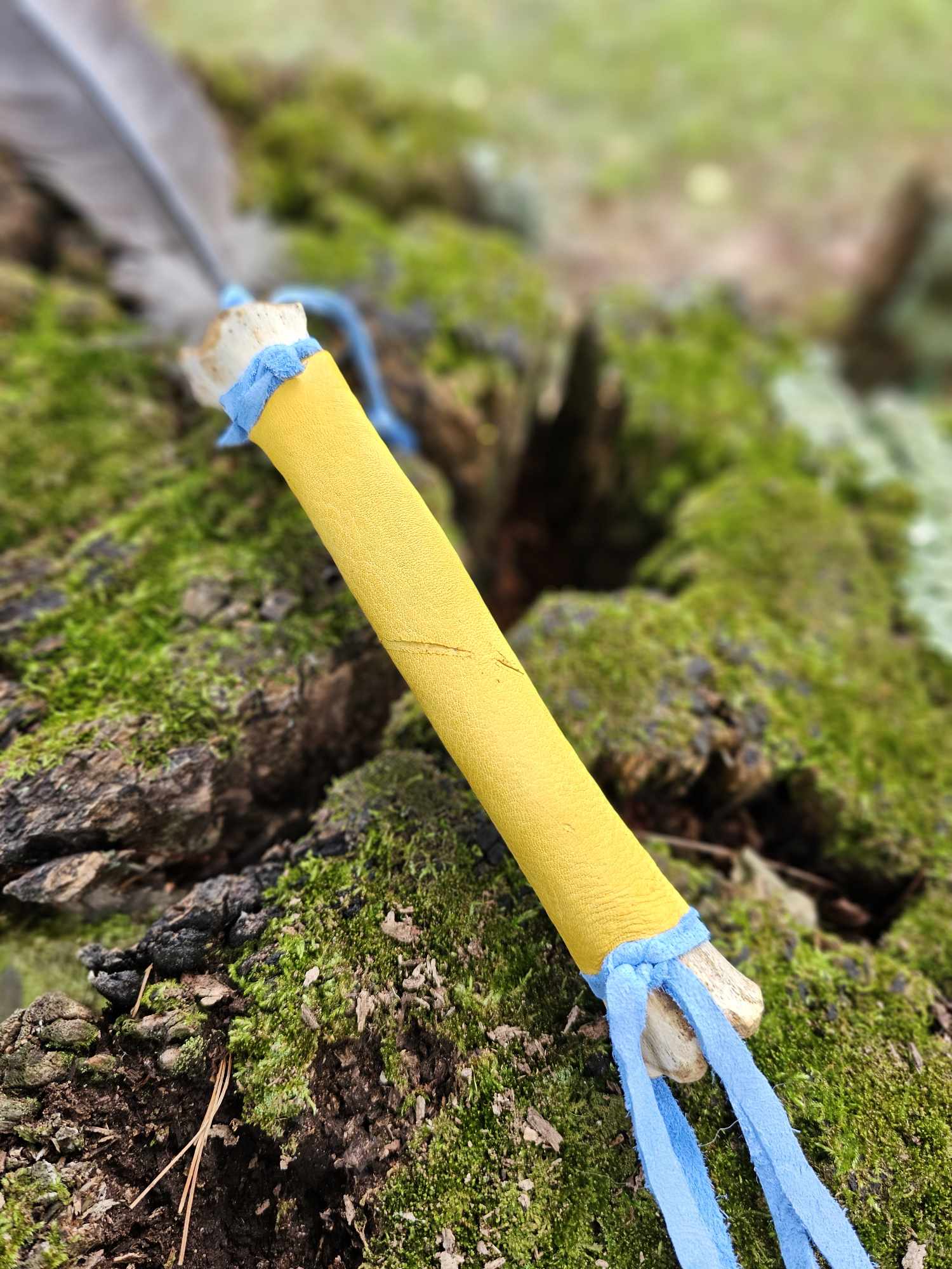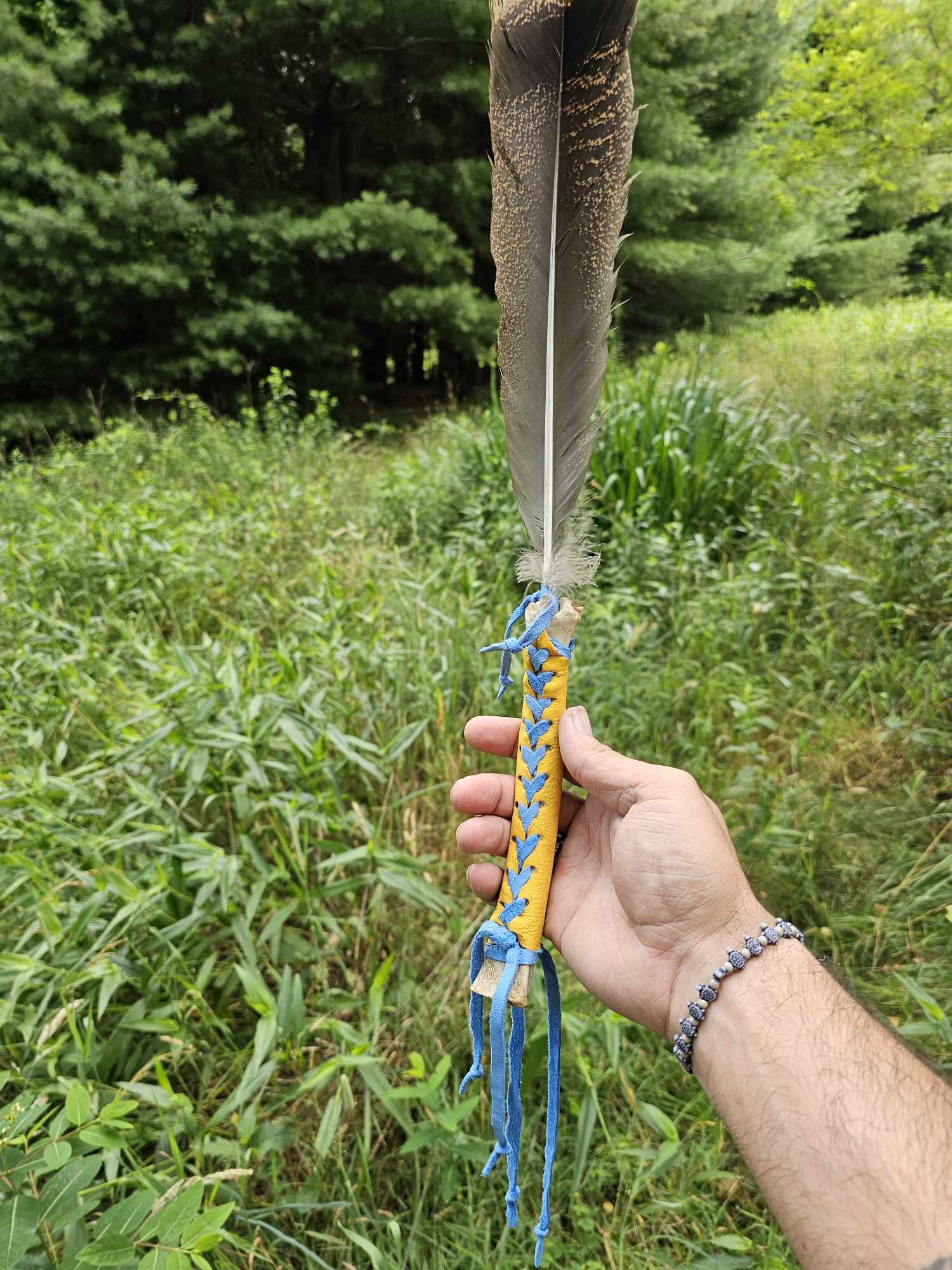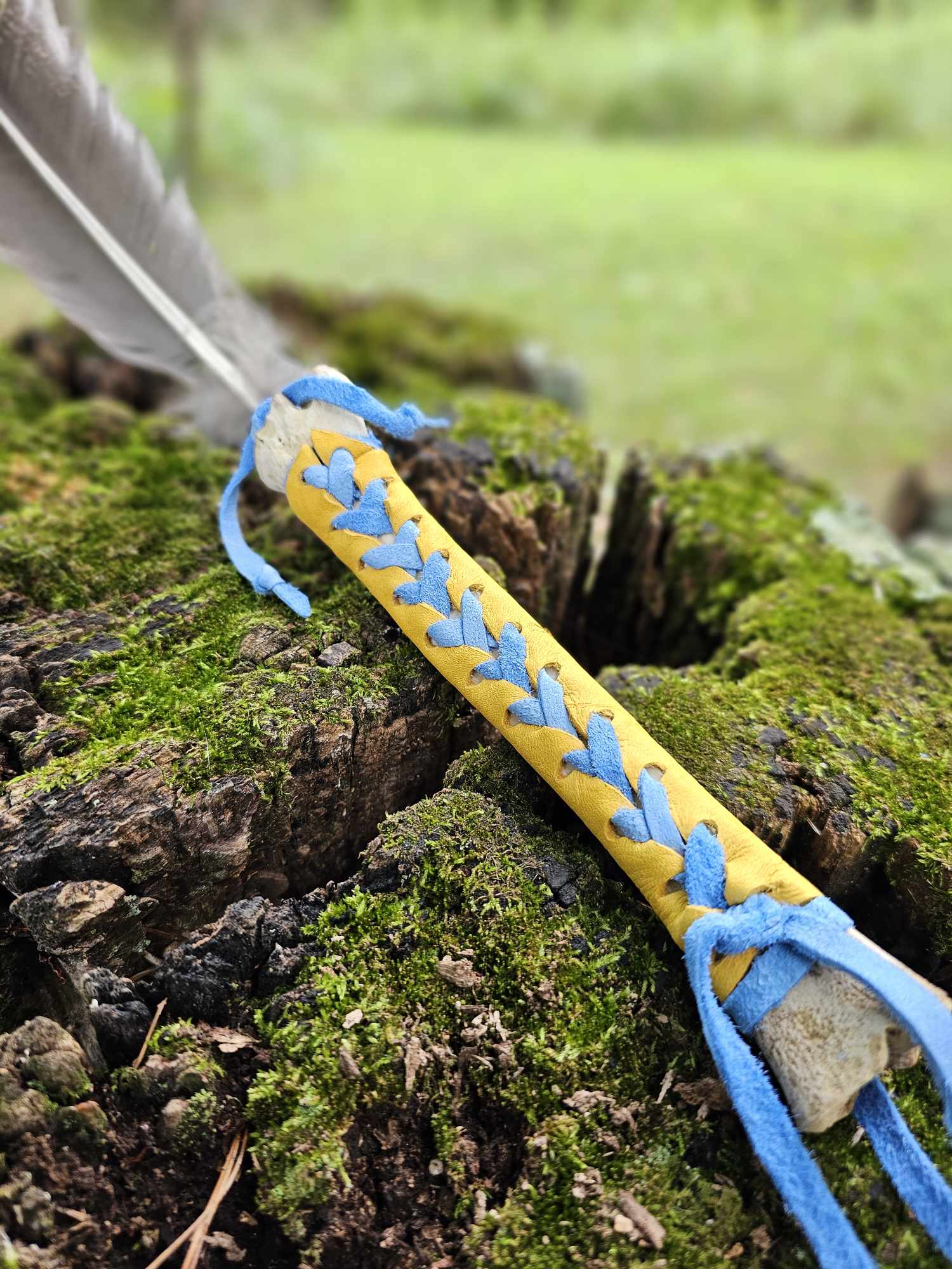Handmade from cannon bone, wild turkey feather, yellow elk leather, and blue dyed deer leather. See photo of me holding it for size reference.