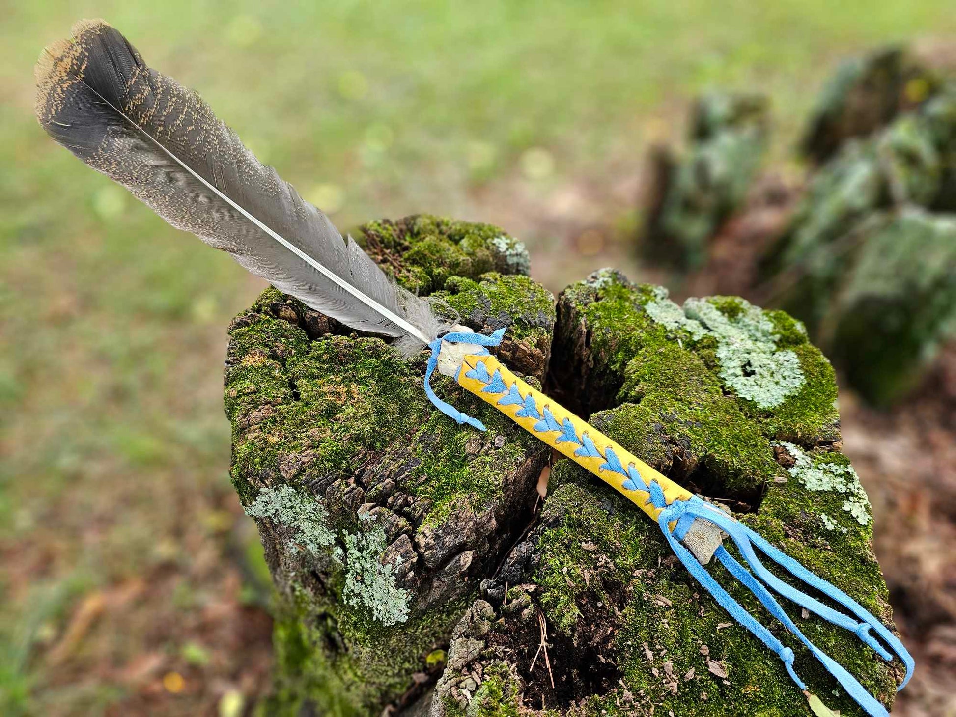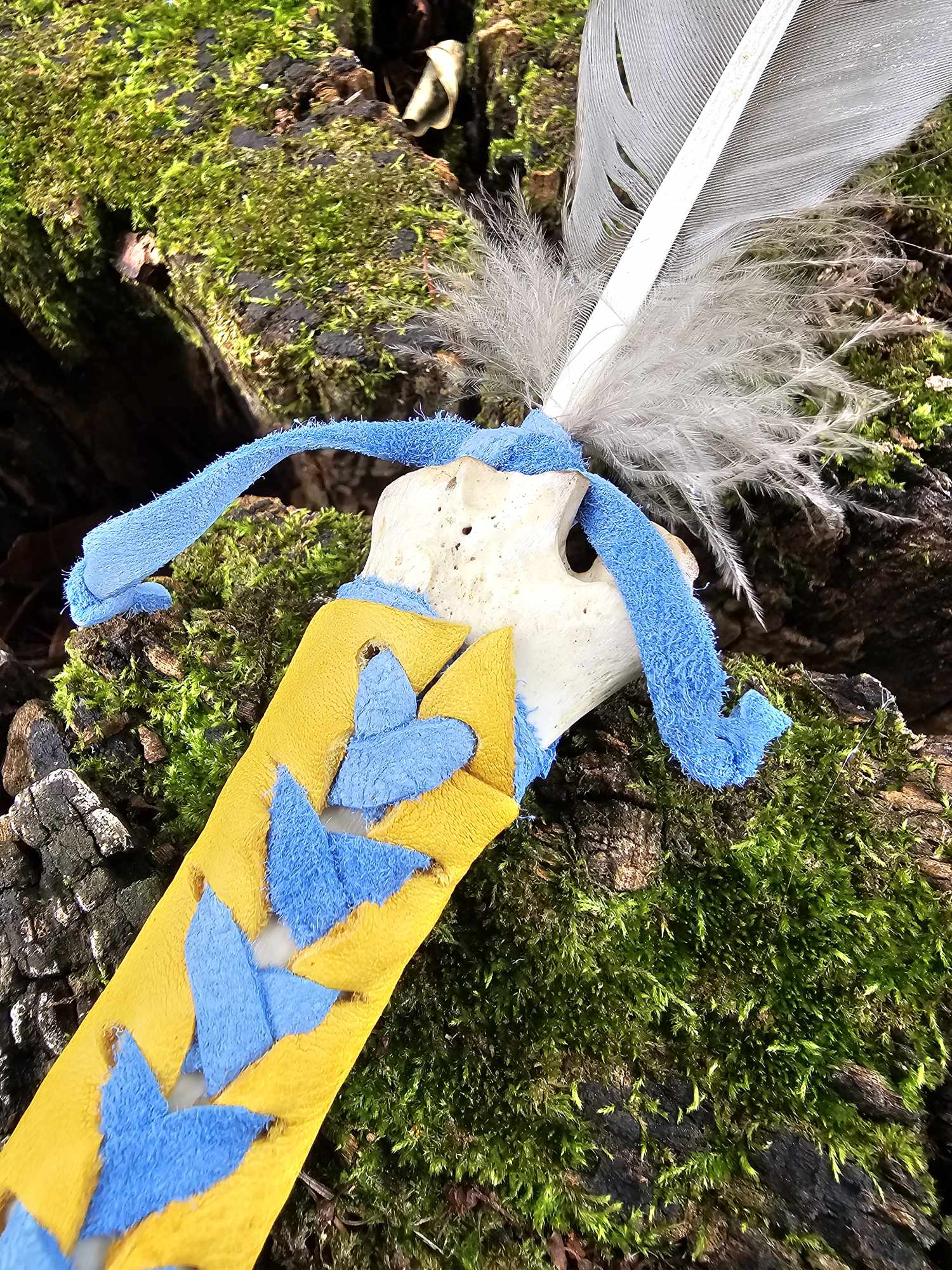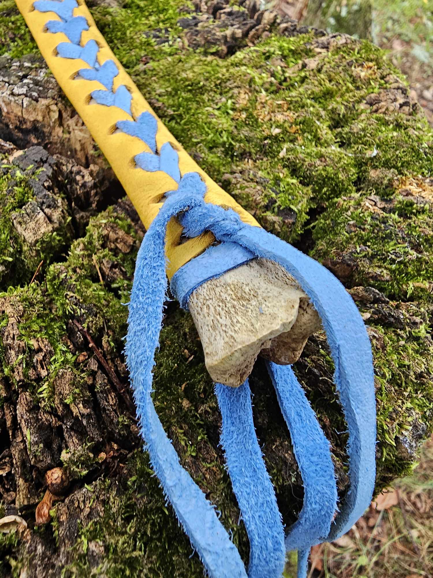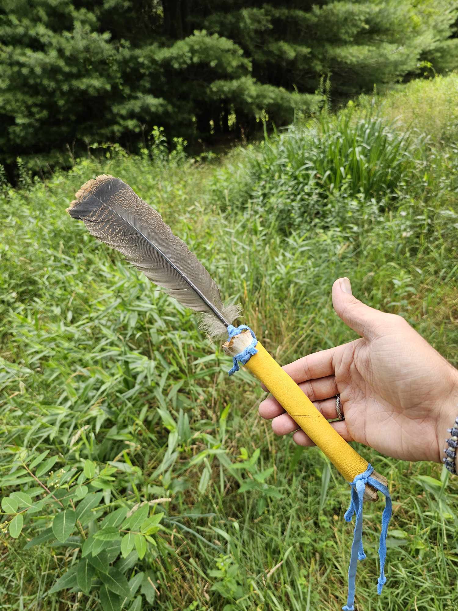 Handmade from cannon bone, wild turkey feather, yellow elk leather, and blue dyed deer leather. See photo of me holding it for size reference.