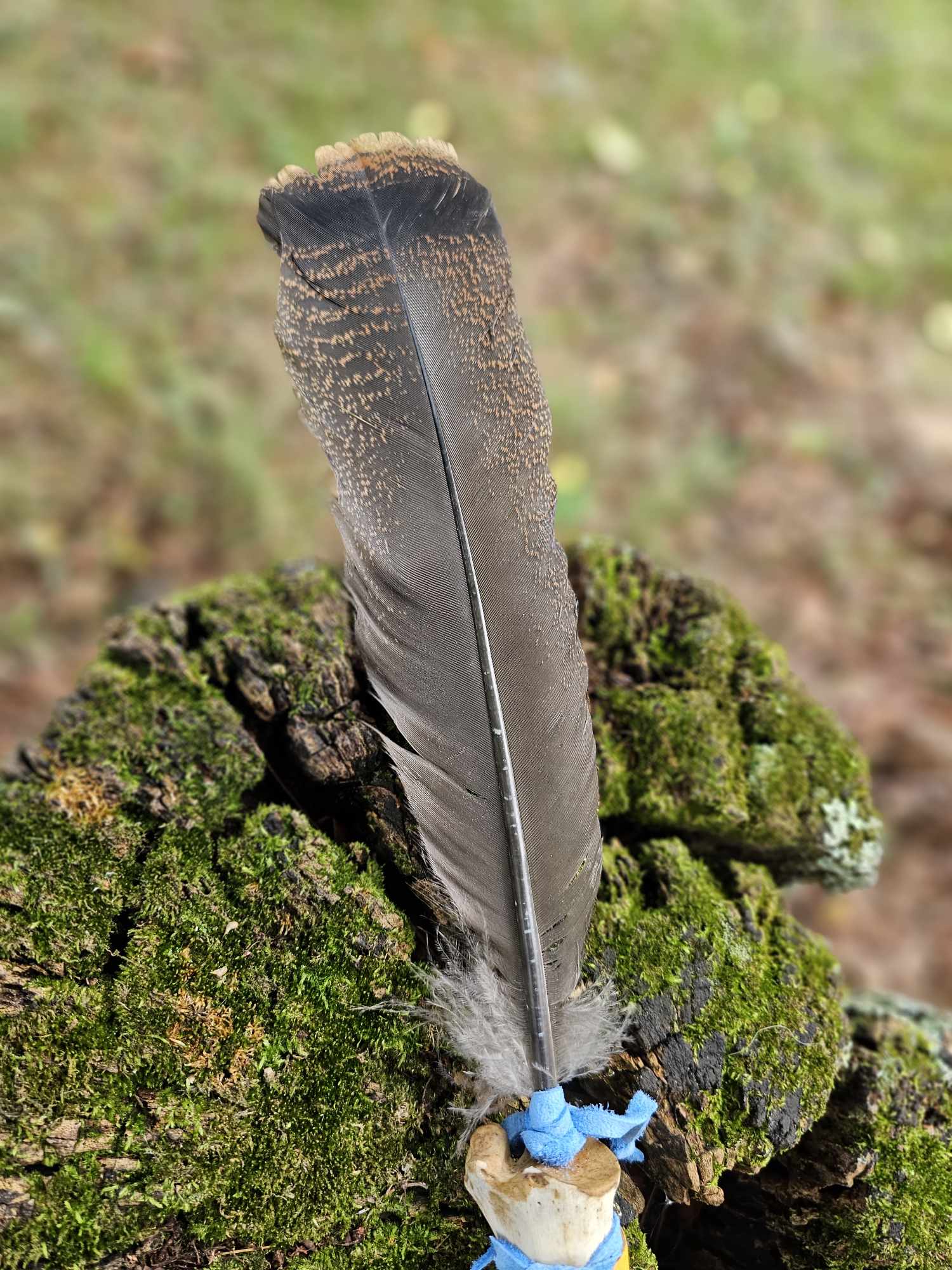 Deer bone Smudge Fan with Turkey feather, Elk Leather, Blue-Dyed Buckskin
