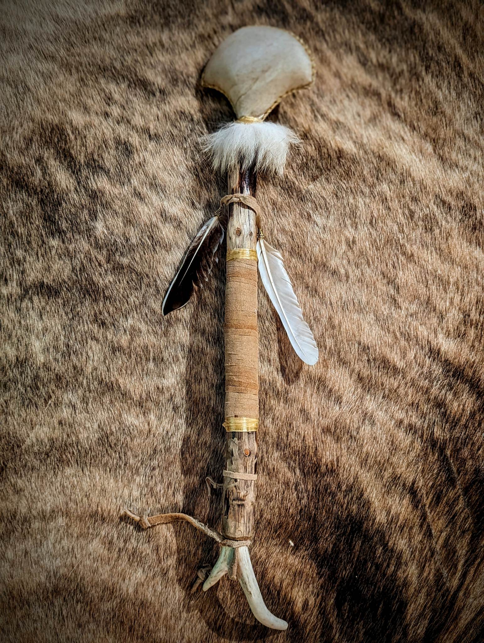 Deer Hide and Antler Rattle With Duck Feathers and Coyote Fur